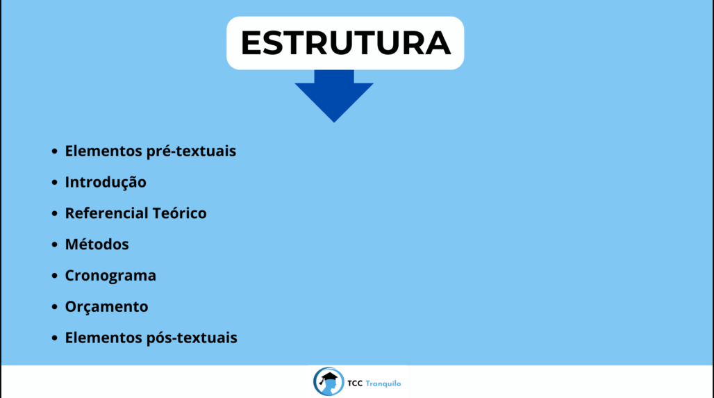 ESTRUTURA Elementos pré-textuais Introdução Referencial Teórico Métodos Cronograma Orçamento Elementos pós-textuais TCC Tranquilo