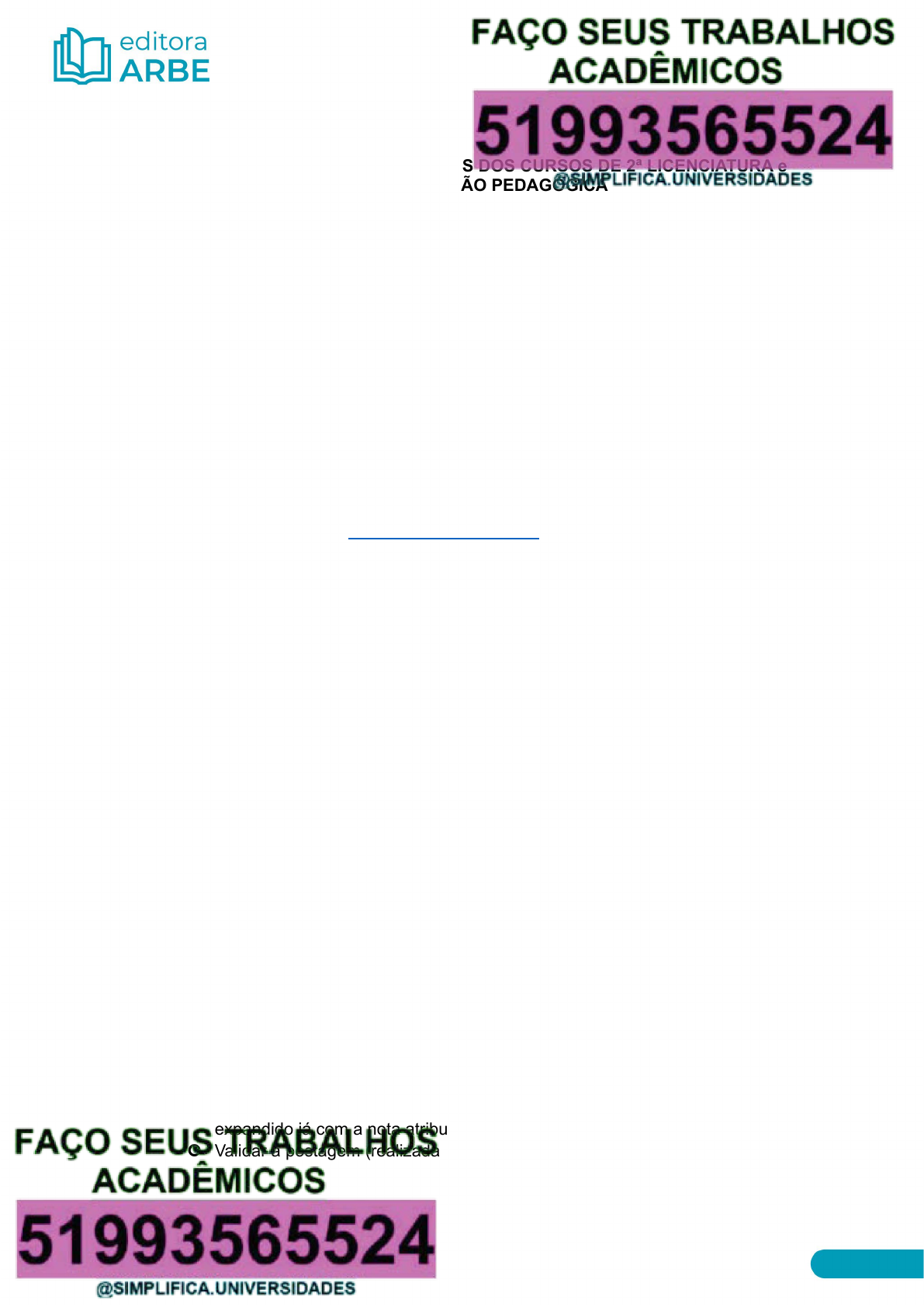 REGULAMENTAÇÕES PARA OS ALUNOS DOS CURSOS DE 2ª LICENCIATURA e COMPLEMENTAÇÃO PEDAGÓGICA O Trabalho de Conclusão de Curso será no formato resumo expandido. O resumo expandido é um documento cujas ideias e significância são expostas de forma mais compacta. Deve conter informações breves e concretas sobre o objeto do trabalho acadêmico, ou seja, deve apresentar, de forma concisa, uma ideia geral. A temática é de livre escolha, porém deve ser obrigatoriamente voltado à área da educação/licenciatura. O resumo expandido solicitado deve conter o mínimo de 2 páginas e o máximo de 5 páginas. Redigido e formatado de acordo com as normas técnicas da Associação Brasileira de Normas Técnicas – ABNT. O Discente será acompanhado pelo Docente responsável pela orientação/ correção exclusivamente pelo e-mail: artigotcc@unifahe.edu.br Caberá ao Discente/ aluno: Escolher o assunto/ temática de interesse para a elaboração do resumo expandido Fundamentar a temática em referenciais teóricos pertinentes à temática; Seguir as orientações de formatação de acordo com a ABNT Entrar em contato com o Docente (responsável pela orientação/ correção) do trabalho acadêmico; Encaminhar para a Docente (responsável pela correção) o material produzido Realinhar conforme às orientações indicadas pelo professor orientador/corretor); Realizar a devolutiva das correções no prazo estipulado; Fazer upload do arquivo correspondente já com a nota atribuída pelo professor/orientador, ou seja, subir na plataforma o material acadêmico, corrigido e com a nota atribuída pelo professor/orientador; Caberá ao Docente responsável: Orientar o discente na temática desenvolvida; Realizar as correções nos aspectos gramaticais, lexicais, coesão e coerência textual, regras de formatação e citação segundo as normas da ABNT... Apontar as correções e / ou alterações textuais; Atribuir nota ao referido trabalho acadêmico; Após conclusão do processo com o educando, encaminhar para a equipe de tutoria (UNIFAHE), a versão concluída e corrigida do aluno; Caberá à Equipe de tutoria: Receber, exclusivamente, do Professor orientador/ corretor o resumo expandido já com a nota atribuída; Validar a postagem (realizada pelo discente) na plataforma; MANUAL DE TRABALHO DE CONCLUSÃO DE CURSO - TCC Segunda Licenciatura e Complementação Pedagógica (R2) 1. Introdução 2. Orientações Gerais 3. Resumo Expandido na Prática 4. Formatações e Dicas 5. Nota e Entrega da Versão Final 1. Introdução Caro Estudante! Seja bem-vindo(a) à mais uma etapa de sua 2ª Licenciatura/ Formação Pedagógica, o Trabalho de Conclusão de Curso (TCC). Nessa etapa será disponibilizado ao estudante o contato direto, via e-mail, com o profissional que irá acompanhá-lo. O Trabalho de Conclusão de Curso da 2ª Licenciatura e Formação Pedagógica em licenciatura tem como objetivos possibilitar a você, acadêmico(a): • A elaboração de estudos e iniciação científica; • Correlacionar e aprofundar os conhecimentos teórico-práticos adquiridos na 2ª Licenciatura/ Formação Pedagógica; • O contato com o processo de investigação e incentivo à disseminação do conhecimento por meio da apresentação e possível publicação de trabalhos produzidos; • O enriquecimento da produção científica voltada à Educação, estimulando a iniciação à pesquisa científica, articulada com as necessidades da comunidade local, nacional e internacional. Esta etapa é um momento de extrema importância para sua formação docente, pois você terá oportunidade de se aproximar da área da pesquisa de forma a investigar e ampliar seus conhecimentos acerca de uma temática da área. Ressaltamos que dúvidas poderão surgir, contudo reiteramos que a assessoria pedagógica acontecerá, via e-mail, com o Profissional (orientador/ corretor) Este é um documento norteador para a realização de seu TCC. Além disso, os tutores educacionais estarão ao seu lado, prontos e dispostos para sanar quaisquer dúvidas. Bons estudos! 2. Orientações Gerais O presente manual tem como objetivo apresentar os direcionamentos para elaboração do Trabalho de Conclusão de Curso. O TCC deve ser realizado no formato RESUMO EXPANDIDO. Você sabe o que é este tipo de trabalho científico? O RESUMO EXPANDIDO é um documento cujas ideias e significância são expostas de forma mais compacta. Deve conter informações breves e concretas sobre o objeto do trabalho acadêmico, ou seja, deve apresentar, de forma concisa, uma ideia geral. TÍTULO Nome do(a) autor(a) 1. INTRODUÇÃO 2. DESENVOLVIMENTO 3. CONCLUSÃO 4. REFERÊNCIAS BIBLIOGRÁFICAS O RESUMO EXPANDIDO deve conter o mínimo de 2 páginas e o máximo de 5 páginas, incluindo todos os elementos mencionados acima. ATENÇÃO! O RESUMO NÃO DEVE CONTER CAPA(S). Para formatação do RESUMO EXPANDIDO você deve seguir as normas técnicas da Associação Brasileira de Normas Técnicas – ABNT. Então, por onde começar? 3. Resumo Expandido na Prática O primeiro passo para a escrita do seu RESUMO EXPANDIDO é o tema. Este é LIVRE, porém deve ser obrigatoriamente voltado à área da educação/licenciatura. Além disso, este tema deverá ter relação com sua área de estudos, ou seja, seu curso atual, portanto não é permitido utilizar trabalhos prévios (de outros cursos ou instituições); Após a delimitação de sua temática, é importante definir o objetivo geral do seu estudo. O objetivo geral é único, ele resume a ideia central do trabalho. Em seguida, é necessário organizar a questão problema que norteará seu estudo. Ela deve ser específica ao seu curso de formação pedagógica. Com o tema, objetivo geral e questão problema definidos, vamos iniciar a escrita do RESUMO EXPANDIDO? A seguir, você encontrará o MODELO que deve ser seguido para a organização e a entrega do seu RESUMO EXPANDIDO. FIQUE ATENTO! O texto em vermelho deve ser apagad