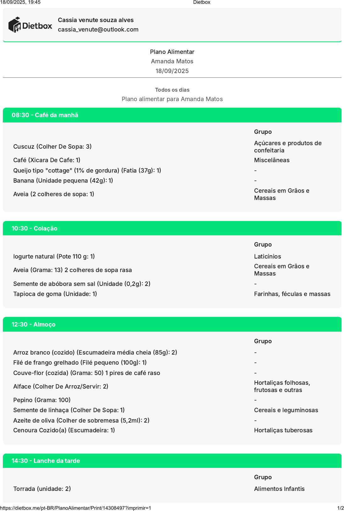 Cassia venute souza alves cassia_venute@outlook.com Plano Alimentar Amanda Matos 18/09/2025 Todos os dias Plano alimentar para Amanda Matos 08:30 - Café da manhã Grupo Cuscuz (Colher De Sopa: 3) Açúcares e produtos de confeitaria Café (Xicara De Cafe: 1) Miscelâneas Queijo tipo "cottage" (1% de gordura) (Fatia (37g): 1) - Banana (Unidade pequena (42g): 1) - Aveia (2 colheres de sopa: 1) Cereais em Grãos e Massas 10:30 - Colação Grupo Iogurte natural (Pote 110 g: 1) Laticínios Aveia (Grama: 13) 2 colheres de sopa rasa Cereais em Grãos e Massas Semente de abóbora sem sal (Unidade (0,2g): 2) - Tapioca de goma (Unidade: 1) Farinhas, féculas e massas 12:30 - Almoço Grupo Arroz branco (cozido) (Escumadeira média cheia (85g): 2) - Filé de frango grelhado (Filé pequeno (100g): 1) - Couve-flor (cozida) (Grama: 50) 1 pires de café raso - Alface (Colher De Arroz/Servir: 2) Hortaliças folhosas, frutosas e outras Pepino (Grama: 100) - Semente de linhaça (Colher De Sopa: 1) Cereais e leguminosas Azeite de oliva (Colher de sobremesa (5,2ml): 2) - Cenoura Cozido(a) (Escumadeira: 1) Hortaliças tuberosas 14:30 - Lanche da tarde Grupo Torrada (unidade: 2) Alimentos Infantis 18/09/2025, 19:45 Dietbox https://dietbox.me/pt-BR/PlanoAlimentar/Print/14308497?imprimir=1 1/2 Geléia de amora (Colher de sopa (34g): 1) - Suco de uva integral - Superbom® (Copo médio (200ml): 1) - Castanha de caju torrada com sal (Punhado (40g): 1) - 16:30 - Lanche da tarde II Grupo Amêndoas com casca - Mr. Valley Qualitá® (Unidade (2g): 2) - Iogurte natural (Pote 110 g: 1) Laticínios Aveia (2 colheres de sopa: 2) Cereais em Grãos e Massas Pão francês (Unidade (50g): 1) - Clara de ovo de galinha (Unidade (34g): 1) - 20:00 - Jantar Grupo Batata doce, cozida, sem pele, com sal (xícara, amassada: 1) Vegetais e Produtos Vegetais Salada, de legumes, cozida no vapor (Grama: 50) Alimentos preparados Azeite de oliva (Colher de chá (2,4ml): 1) - Tofu (Fatia grande (50g): 1) - Couve-flor (cozida) (Grama: 50) - Suco de morango (Copo Americano: 1) Miscelâneas Mandioca (Grama: 50) 1 porção média - 22:00 - ceia Grupo Mingau de aveia (Colher de sopa (22g): 2) - Leite de vaca semidesnatado (Copo Americano: 1) Laticínios Castanha do Pará sem sal (Unidade (4g): 5) - 18/09/2025, 19:45 Dietbox https://dietbox.me/pt-BR/PlanoAlimentar/Print/14308497?imprimir=1 2/2