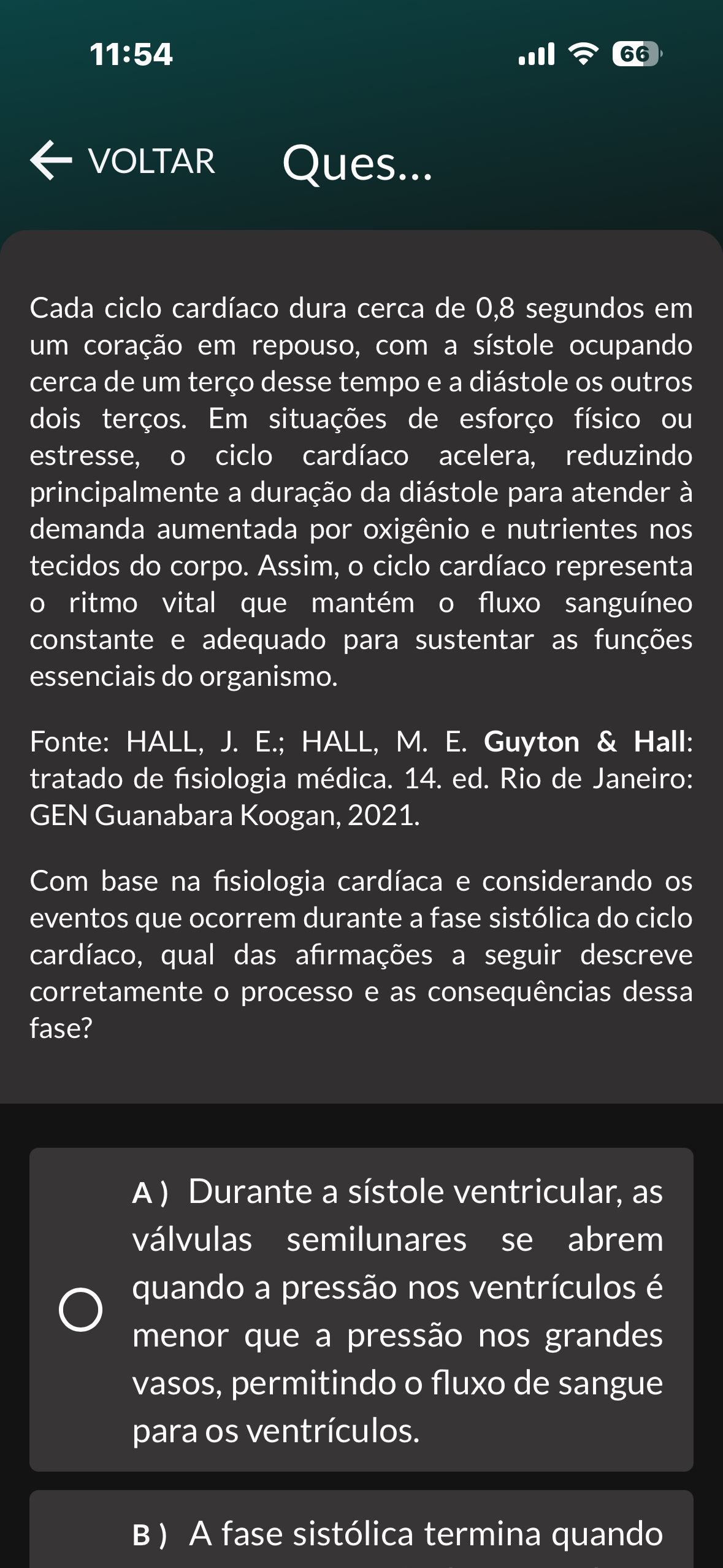 11:54 66 VOLTAR Ques... Cada ciclo cardíaco dura cerca de 0,8 segundos em um coração em repouso, com a sístole ocupando cerca de um terço desse tempo e a diástole os outros dois terços. Em situações de esforço físico ou estresse, ciclo cardíaco acelera, reduzindo principalmente a duração da diástole para atender à demanda aumentada por oxigênio e nutrientes nos tecidos do corpo. Assim, ciclo cardíaco representa ritmo vital que mantém fluxo sanguíneo constante e adequado para sustentar as funções essenciais do organismo. Fonte: HALL, J. HALL, Guyton & Hall: tratado de fisiologia médica. 14. ed. Rio de Janeiro: GEN Guanabara Koogan, 2021. Com base na fisiologia cardíaca e considerando os eventos que ocorrem durante a fase sistólica do ciclo cardíaco, qual das afirmações a seguir descreve corretamente processo e as consequências dessa fase? A) Durante a sístole ventricular, as válvulas semilunares se abrem quando a pressão nos ventrículos é menor que a pressão nos grandes vasos, permitindo fluxo de sangue para os ventrículos. A fase sistólica termina quando