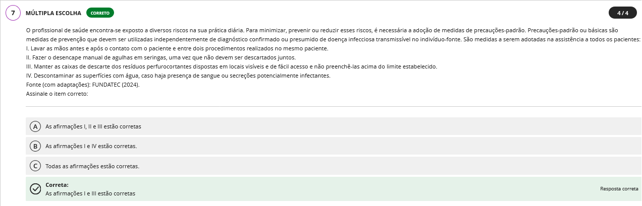 7 MULTIPLA ESCOLHA CORRETO 4/4 profissional de saúde encontra-se exposto a diversos riscos na sua Para minimizar, prevenir ou reduzir esses riscos, é necessária a adoção de medidas de precauções-padrão. Precauções-padrão ou são medidas de prevenção que devem ser utilizadas independentemente de confirmado ou presumido de doença infecciosa transmissivel no medidas a serem adotadas na assistência a todos pacientes: Lavar as mãos antes e após contato com paciente e entre dois procedimentos realizados no mesmo paciente. II. Fazer desencape manual de agulhas em seringas, uma vez que não devem ser descartados juntos. III. Manter as caixas de descarte dos residuos perfurocortantes dispostas em locais visiveis e de facil acesso e não preenchê-las acima do limite estabelecido. IV. Descontaminar as superficies com caso haja presença de sangue ou secreções potencialmente infectantes. Fonte (com adaptações): FUNDATEC (2024). Assinale 0 item correto: A As afirmações II e III estão corretas B As afirmações e IV estão corretas. C Todas as afirmações estão corretas. Correta: Resposta correta As afirmações e III estão corretas