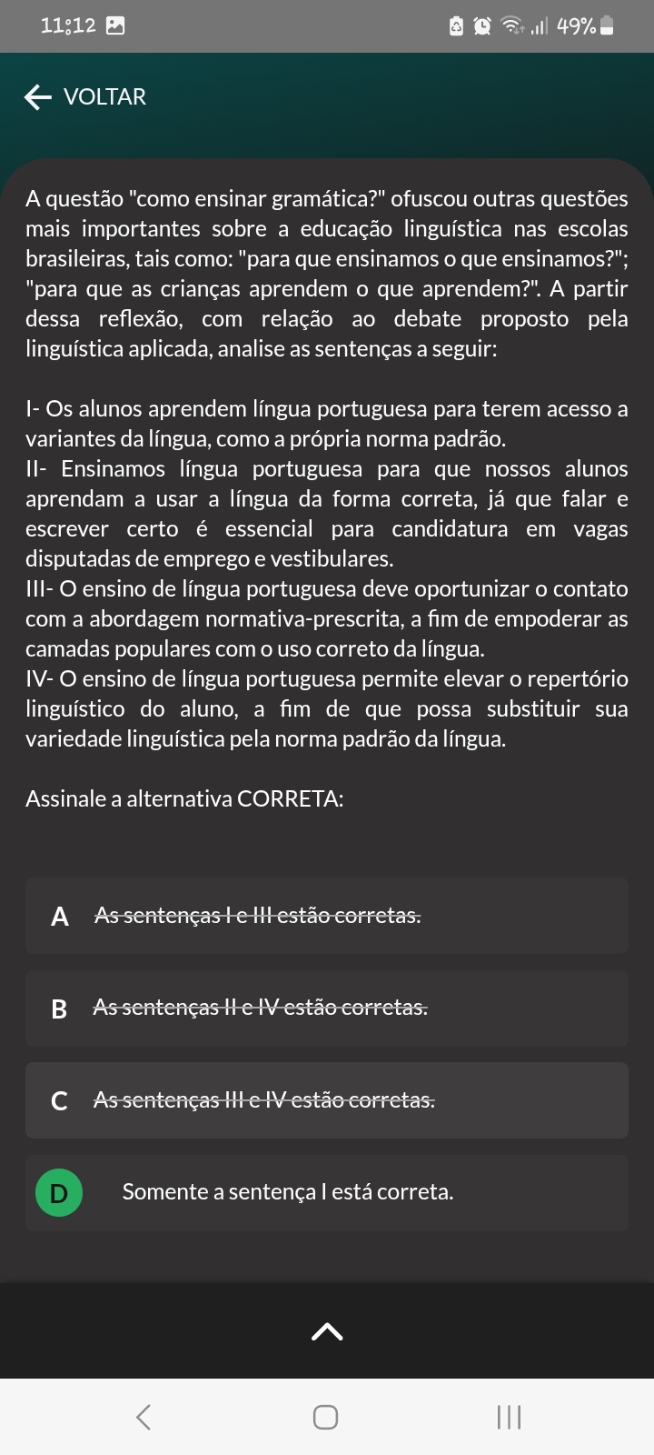 11:12 49% VOLTAR A questão "como ensinar gramática?" ofuscou outras questões mais importantes sobre a educação linguística nas escolas brasileiras, tais como: "para que ensinamos que ensinamos?"; "para que as crianças aprendem que aprendem?". A partir dessa reflexão, com relação ao debate proposto pela linguística aplicada, analise as sentenças a seguir: I- Os alunos aprendem língua portuguesa para terem acesso a variantes da língua, como a própria norma padrão. II- Ensinamos língua portuguesa para que nossos alunos aprendam a usar a língua da forma correta, já que falar e escrever certo é essencial para candidatura em vagas disputadas de emprego e vestibulares. III- ensino de língua portuguesa deve oportunizar contato com a abordagem normativa-prescrita, a fim de empoderar as camadas populares com o uso correto da língua. IV- ensino de língua portuguesa permite elevar repertório linguístico do aluno, a fim de que possa substituir sua variedade linguística pela norma padrão da língua. Assinale a alternativa CORRETA: A As sentenças le estão corretas. As sentenças IV estão corretas. c As sentenças e IV estão corretas. D Somente a sentença está correta.