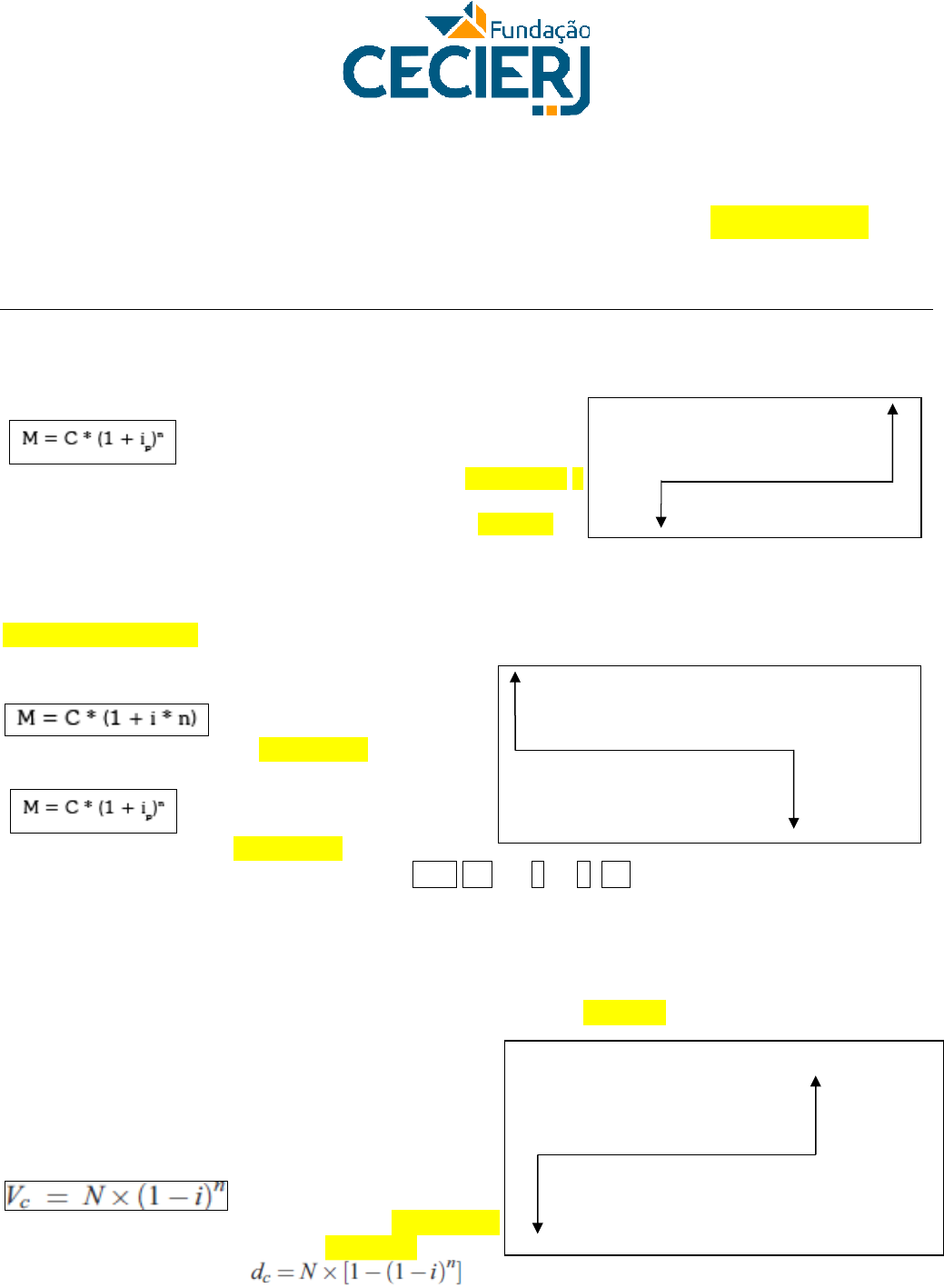 Fundação Centro de Ciências e Educação Superior a Distância do Estado do Rio de Janeiro Centro de Educação Superior a Distância do Estado do Rio de Janeiro AP1 – Matemática financeira I – 2º Semestre/2025 - GABARITO QUESTÕES (cada questão vale 1,0 ponto) 1. Julgue se a assertiva abaixo é verdadeira (V) ou falsa (F) e justifique sua resposta: Um banco oferece a seguinte opção de investimento: “Deposite R$ 100,00 hoje e resgate R$ 112,00 ao final de um ano”. Neste caso a taxa de juros compostos deste investimento seria de 1% a.a. Sugestão de resolução: 112 = 100 x (1 + i)1 → 1 + i = 112/100 → i = 1,12 – 1 → i = 12% a.a. F - Se você depositar R$ 100,00 por 12 meses (um ano) à taxa de 1% a.a. teria o valor de: M = 100 x (1 + 0,01)1 = R$ 101,00. FALSA 2. Um capital de R$ 2.000,00 foi aplicado à taxa de 3% a.m. por três meses. Os montantes correspondentes obtidos segundo capitalização simples e composta, respectivamente, são (R$): a) 2.180,00 e 2.185,45 b) 2.180,00 e 2.480,00 c) 2.185,45 e 2.480,00 d) 2.185,45 e 2.180,00 Sugestão de resolução: Juros simples: M = 2.000 x (1 + 0,03 x 3) = R$ 2.180,00 Juros compostos: M = 2.000 x (1 + 0,03)3 = R$ 2.185,45 Ou pela calculadora financeira HP-12C: 2.000 CHS PV / 3 n / 3 i FV = - 2.185,45 3. Uma loja procurou um banco para descontar uma nota promissória com valor nominal de R$ 5.000,00, com vencimento em um semestre. Qual o valor do desconto, ao saber que o banco cobra uma taxa de desconto composto comercial de 2% a.m.? a) R$ 500,00 b) R$ 535,71 c) R$ 560,14 d) 570,79 Sugestão de resolução: N = R$ 5.000,00 (valor nominal do título) n= 1 semestre = 6 meses i = 2% a.m. Vc = ? (valor recebido, valor descontado) dc = ? (desconto) = N - Vc PV = 5.000 x (1 - 0,02)6 = 5.000 x 0,8858 = R$ 4.429,21 dC = N – Vc = 5.000,00 – 4.429,21= R$ 570,79 ou pela fórmula direta do d: N = R$ 5.000,00 i = 2% a.m. 0 dc = ? n = 1 sem = 6 meses Vc = ? C = R$ 2.000,00 (PV) n = 3 anos 0 i = 3% a.m. M = ? (FV) M = R$ 112,00 i = ? % a.a. 0 n = 1 ano = 12 meses C = R$ 100,00 4. Um título financeiro no valor de R$ 1.500,00 poderá ser resgatado em 180 dias pelo valor de R$ 2.850,00. Qual a taxa mensal de juros compostos desse investimento? a) 10,00% a.m. b) 11,29% a.m. c) 12,75% a.m. d) 15,00% a.m. Sugestão de resolução: C = R$ 1.500,00 S = R$ 2.850,00 n = 180 dias = 6 meses i = ? 2850 = 1500 x (1 + i)6 (1 + i)6 = 2850/1500 i = (2850/1500)1/6 - 1 (digitar assim na calculadora) i = 11,29% a.m. Pela calculadora HP-12C: 1500 CHS PV / 2850 FV / 6 n / i = 11,29% 5. Uma duplicata no valor de R$ 6.900,00 foi resgatada três meses antes de seu vencimento. Considerando que a taxa anual de desconto comercial simples foi de 48%, então, se o valor atual dessa duplicata era X reais, é correto afirmar que: a) X > 6.000,00 b) 5.900,0010.000 FV / 3 n / 1 i / PV R$ - 9705,90 ENTER / f CLEAR FIN REG 10.000 FV / 6 n / 1 i / PV R$ - 9420,45 + 19.126,35 10. Qual o tempo necessário p/ que uma aplicação triplique de valor, quando aplicada à taxa 8% a.m. em regime de juros compostos? a) entre 3 e 4 meses b) entre 9 e 10 meses c) entre 14 e 15 meses d) entre 24 e 25 meses Sugestão de resolução: C = C ou $ 100 (PV) M = 3C ou $ 300 (FV) J = 2C (3C – C) ou $ 200 (300 – 100) i = 8% a.m. n = ? 300 = 100 x (1,08)n 1,08n = 3 → ln 1,08n = ln 3 → n. ln 1,08 = ln 3 n = 1,0986 / 0,0770 = 14,27 meses Pela calculadora HP12C: 100 CHS PMT /300 FV / 8 i / n = 15 HP fornece valores inteiros p/ cálculo de n. M = 3C ou 300 (FV) 0 n C = C ou $ 100 (PV) i=8% a.m. dica: se não há valor do capital, estipule valor $ 100 X N1 = R$ 10.000,00 N2 = R$ 10.000,00 0 3 6 meses iC = 1% a.m. X = Vr1 + Vr2 (valor descontado dos títulos de valor nominal N1 e N2)