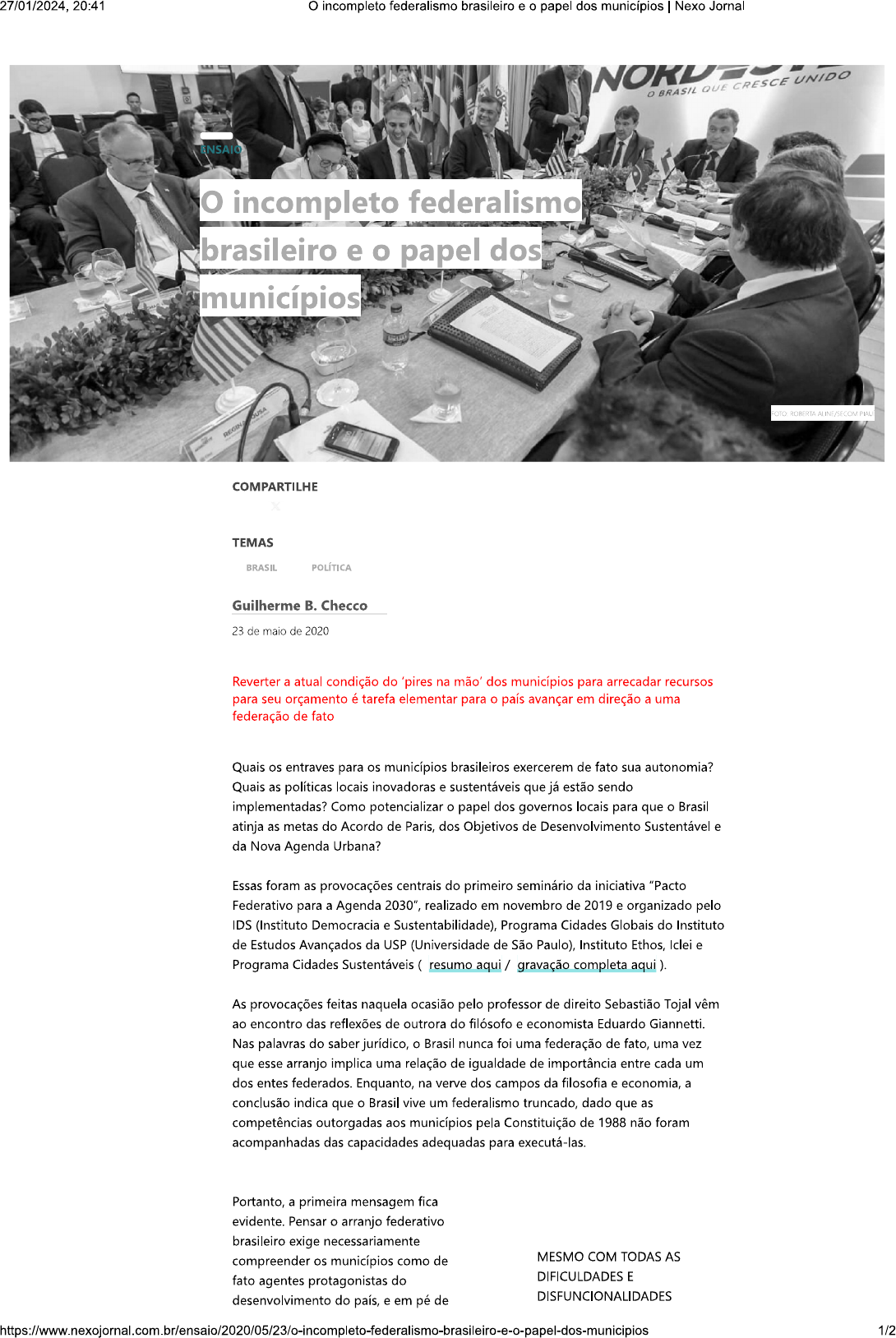27/01/2024, 20:41 incompleto federalismo brasileiro e o papel dos municípios Nexo Jornal NORD QUE CRESCE UNIDO incompleto federalismo brasileiro e papel dos municípios ROBERTA ALINE/SECOM PIAU COMPARTILHE TEMAS BRASIL POLÍTICA Guilherme B. Checco 23 de maio de 2020 Reverter a atual condição do 'pires na mão' dos municípios para arrecadar recursos para seu orçamento é tarefa elementar para país avançar em direção a uma federação de fato Quais os entraves para os municípios brasileiros exercerem de fato sua autonomia? Quais as políticas locais inovadoras e sustentáveis que já estão sendo implementadas? Como potencializar o papel dos governos locais para que o Brasil atinja as metas do Acordo de Paris, dos Objetivos de Desenvolvimento Sustentável e da Nova Agenda Urbana? Essas foram as provocações centrais do primeiro seminário da iniciativa "Pacto Federativo para a Agenda 2030", realizado em novembro de 2019 e organizado pelo IDS (Instituto Democracia e Sustentabilidade), Programa Cidades Globais do Instituto de Estudos Avançados da USP (Universidade de São Paulo), Instituto Ethos, Iclei e Programa Cidades Sustentáveis ( resumo aqui / gravação completa aqui ). As provocações feitas naquela ocasião pelo professor de direito Sebastião Tojal vêm ao encontro das reflexões de outrora do filósofo e economista Eduardo Giannetti. Nas palavras do saber jurídico, Brasil nunca foi uma federação de fato, uma vez que esse arranjo implica uma relação de igualdade de importância entre cada um dos entes federados. Enquanto, na verve dos campos da filosofia e economia, a conclusão indica que Brasil vive um federalismo truncado, dado que as competências outorgadas aos municípios pela Constituição de 1988 não foram acompanhadas das capacidades adequadas para executá-las. Portanto, a primeira mensagem fica evidente. Pensar arranjo federativo brasileiro exige necessariamente compreender os municípios como de MESMO COM TODAS AS fato agentes protagonistas do DIFICULDADES E desenvolvimento do país, e em pé de DISFUNCIONALIDADES 1/227/01/2024, 20:41 incompleto federalismo brasileiro e o papel dos municípios Nexo Jornal igualdade com estados, Distrito Federal DA GOVERNANÇA e União. Reverter a atual condição do FEDERATIVA ATUAL, "pires na mão" dos municípios para AINDA HÁ ESPAÇO PARA arrecadar recursos para seu orçamento INOVAÇÃO E é tarefa elementar para país avançar PROTAGONISMO LOCAL em direção a uma federação de fato. Desse primeiro entendimento decorre uma segunda conclusão central: fato de que federalismo obrigatoriamente está acompanhado da democracia. Descentralização do poder está umbilicalmente relacionada com maior participação social, maior transparência e um processo de amadurecimento da cidadania. E, para além disso, essa governança política deve ser pensada à luz de um projeto de país este calcado no desenvolvimento sustentável, com uma economia de baixo carbono e combatendo as desigualdades. Não é por acaso que o Estado de Direito e a Federação são cláusulas pétreas da Carta Magna. Sendo exercício da autonomia local uma necessidade de primeira ordem, Índice Firjan de Gestão Fiscal 2019 também apresentado no Seminário de novembro de 2019, retrata uma realidade alarmante da saúde fiscal da maioria dos municípios brasileiros, que ressalta um dos elementos que, na prática, dificultam exercício da autonomia 73,9% dos municípios estão em situação fiscal crítica ou difícil, e 33,3% não geram receitas suficientes para financiar sua estrutura administrativa. A Associação Brasileira de Municípios expôs as dificuldades que os municípios pequenos enfrentam, a dependência de recursos externos como do Fundo de Participação dos Municípios e críticas ao funcionamento do ICMS (Imposto sobre Circulação de Mercadorias e Serviços) em alguns estados. Os dados e opiniões indicam a necessidade de uma reflexão e diálogo mais aprofundado em relação às propostas apresentadas pelo governo federal na PEC n° 188/19 chamada "PEC do Pacto Federativo". Com todas essas dificuldades, uma derradeira mensagem emerge, aparentemente contraditória com quadro desenhado: mesmo com todas as dificuldades e disfuncionalidades da governança federativa atual, ainda há espaço para inovação e protagonismo local. Eduardo Jorge, ex-secretário municipal do Verde e Meio Ambiente de São Paulo, elencou alguns elementos-chave que permitiram que, em sua gestão, a maior cidade do país conseguisse aprovar a primeira política municipal de mudança climática em junho de 2009 antes mesmo que o Brasil tivesse uma política nacional sobre tema. Um dos aspectos destacados foi trabalho multisetorial, chancelado pelo chefe do Executivo, com as demais pastas da gestão local, transportes, construção civil, educação, saúde, entre outros. Não por acaso, a experiência do Consórcio Nordeste, arranjo entre os nove estados daquela região, também apontou poder da cooperação para alavancar desenvolvimento, com estratégias como a redução de custos e ganhos de escala. Mais do que isso, o Consórcio está adotando uma postura protagonista e reforçando seu compromisso com agendas globais, como Acordo de Paris em termos de políticas de mudança do clima. Neste breve apanhado de ideias com todas suas limitações e simplificações de integral responsabilidade deste autor vem à mente a provocação feita pelo antropólogo francês Bruno Latour em sua obra "Jamais fomos modernos" (1991). Ao explorar o conceito de modernidade, o autor afirma que a sociedade ocidental ainda não alcançou tal estágio. Este primeiro debate da iniciativa "Pacto Federativo: Municípios para a Agenda 2030" indica que na prática "jamais fomos federalistas" e que há ainda um árduo percurso para a federação brasileira se estabelecer, especialmente sob a égide dos valores da democracia e da sustentabilidade. Guilherme Checco é coordenador de pe