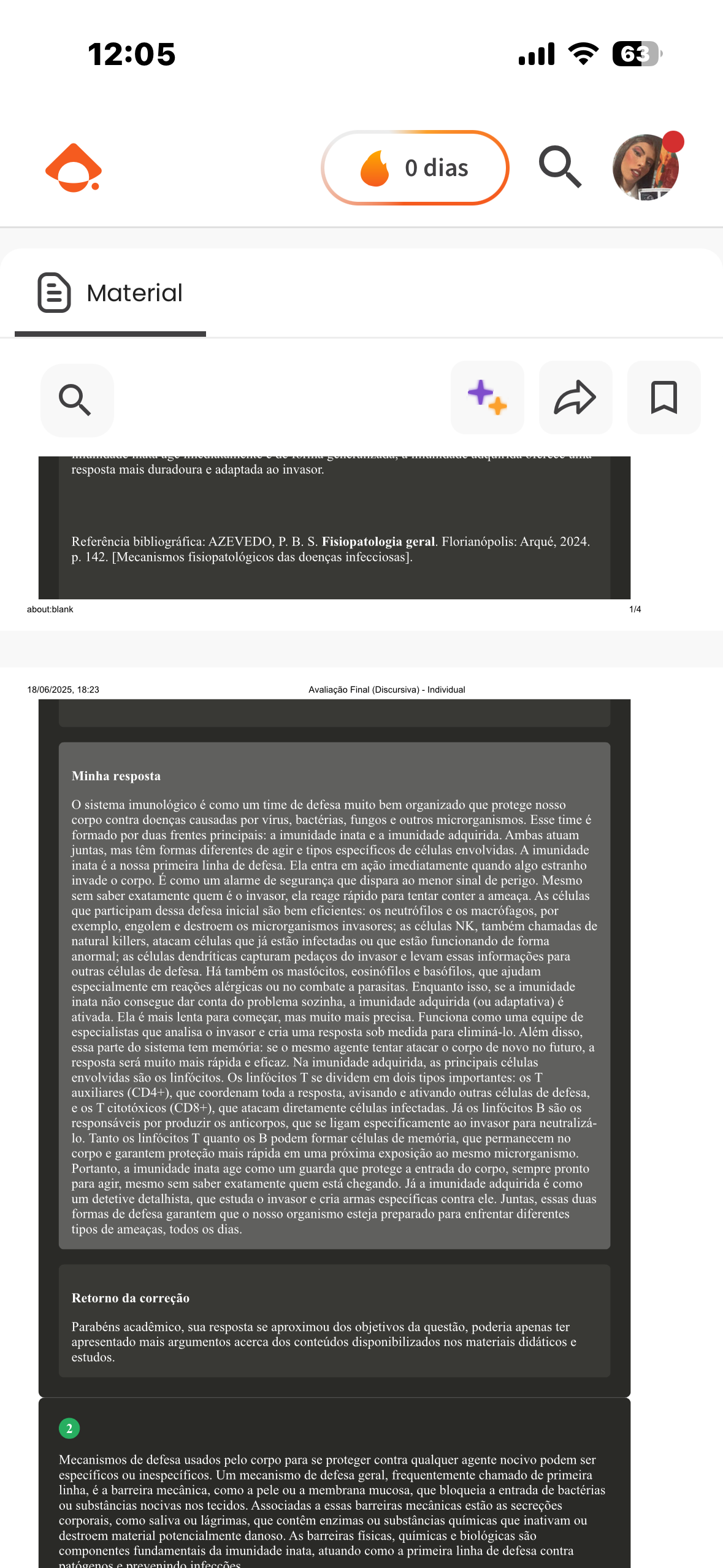 12:05 63 0 dias Material resposta mais duradoura e adaptada ao invasor. Referência bibliográfica: AZEVEDO, P.B.S. Fisiopatologia geral. Florianópolis: Arqué, 2024. p. 142. [Mecanismos fisiopatológicos das doenças infecciosas]. about:blank 1/4 18/06/2025, 18:23 Avaliação Final (Discursiva) Individual Minha resposta sistema imunológico é como um time de defesa muito bem organizado que protege nosso corpo contra doenças causadas por vírus, bactérias, fungos e outros microrganismos. Esse time é formado por duas frentes principais: a imunidade inata e a imunidade adquirida. Ambas atuam juntas, mas têm formas diferentes de agir e tipos específicos de células envolvidas. A imunidade inata é a nossa primeira linha de defesa. Ela entra em ação imediatamente quando algo estranho invade o corpo. como um alarme de segurança que dispara ao menor sinal de perigo. Mesmo sem saber exatamente quem éo invasor, ela reage rápido para tentar conter a ameaça. As células que participam dessa defesa inicial são bem eficientes: os neutrófilos e os macrófagos, por exemplo, engolem e destroem os microrganismos invasores; as células NK, também chamadas de natural killers, atacam células que já estão infectadas ou que estão funcionando de forma anormal; as células dendríticas capturam pedaços do invasor e levam essas informações para outras células de defesa. Há também os mastócitos, eosinófilos e basófilos, que ajudam especialmente em reações alérgicas ou no combate a parasitas. Enquanto isso, se a imunidade inata não consegue dar conta do problema sozinha, a imunidade adquirida (ou adaptativa) é ativada. Ela é mais lenta para começar, mas muito mais precisa. Funciona como uma equipe de especialistas que analisa o invasor e cria uma resposta sob medida para eliminá-lo. Além disso, essa parte do sistema tem memória: se o mesmo agente tentar atacar o corpo de novo no futuro, a resposta será muito mais rápida e eficaz. Na imunidade adquirida, as principais células envolvidas são os linfócitos. Os linfócitos T se dividem em dois tipos importantes: os T auxiliares (CD4+), que coordenam toda a resposta, avisando e ativando outras células de defesa, e os T citotóxicos (CD8+), que atacam diretamente células infectadas. Já os linfócitos são os responsáveis por produzir os anticorpos, que se ligam especificamente ao invasor para neutralizá- lo. Tanto os linfócitos T quanto os podem formar células de memória, que permanecem no corpo e garantem proteção mais rápida em uma próxima exposição ao mesmo microrganismo. Portanto, a imunidade inata age como um guarda que protege a entrada do corpo, sempre pronto para agir, mesmo sem saber exatamente quem está chegando. Já a imunidade adquirida é como um detetive detalhista, que estuda o invasor e cria armas específicas contra ele. Juntas, essas duas formas de defesa garantem que o nosso organismo esteja preparado para enfrentar diferentes tipos de ameaças, todos os dias. Retorno da correção Parabéns acadêmico, sua resposta se aproximou dos objetivos da questão, poderia apenas ter apresentado mais argumentos acerca dos conteúdos disponibilizados nos materiais didáticos e estudos. 2 Mecanismos de defesa usados pelo corpo para se proteger contra qualquer agente nocivo podem ser específicos ou inespecíficos. Um mecanismo de defesa geral, frequentemente chamado de primeira linha, é a barreira mecânica, como a pele ou a membrana mucosa, que bloqueia a entrada de bactérias ou substâncias nocivas nos tecidos. Associadas a essas barreiras mecânicas estão as secreções corporais, como saliva ou lágrimas, que contêm enzimas ou substâncias químicas que inativam ou destroem material potencialmente danoso. As barreiras físicas, químicas e biológicas são componentes fundamentais da imunidade inata, atuando como a primeira linha de defesa contra e prevenindo infecções
