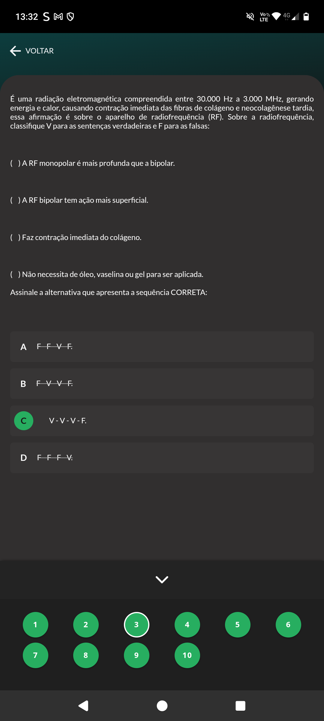 13:32 S M 4G LTE VOLTAR É uma radiação eletromagnética compreendida entre 30.000 Hz a 3.000 MHz, gerando energia e calor, causando contração imediata das fibras de colágeno e neocolagênese tardia, essa afirmação é sobre aparelho de radiofrequência (RF). Sobre a radiofrequência, classifique V para as sentenças verdadeiras e F para as falsas: RF monopolar é mais profunda que a bipolar. RF bipolar tem ação mais superficial. Faz contração imediata do colágeno. Não necessita de óleo, vaselina ou gel para ser aplicada. Assinale a alternativa que apresenta a sequência CORRETA: A B V-V-V-F. D FFFV. 1 2 3 4 5 6 7 8 9 10