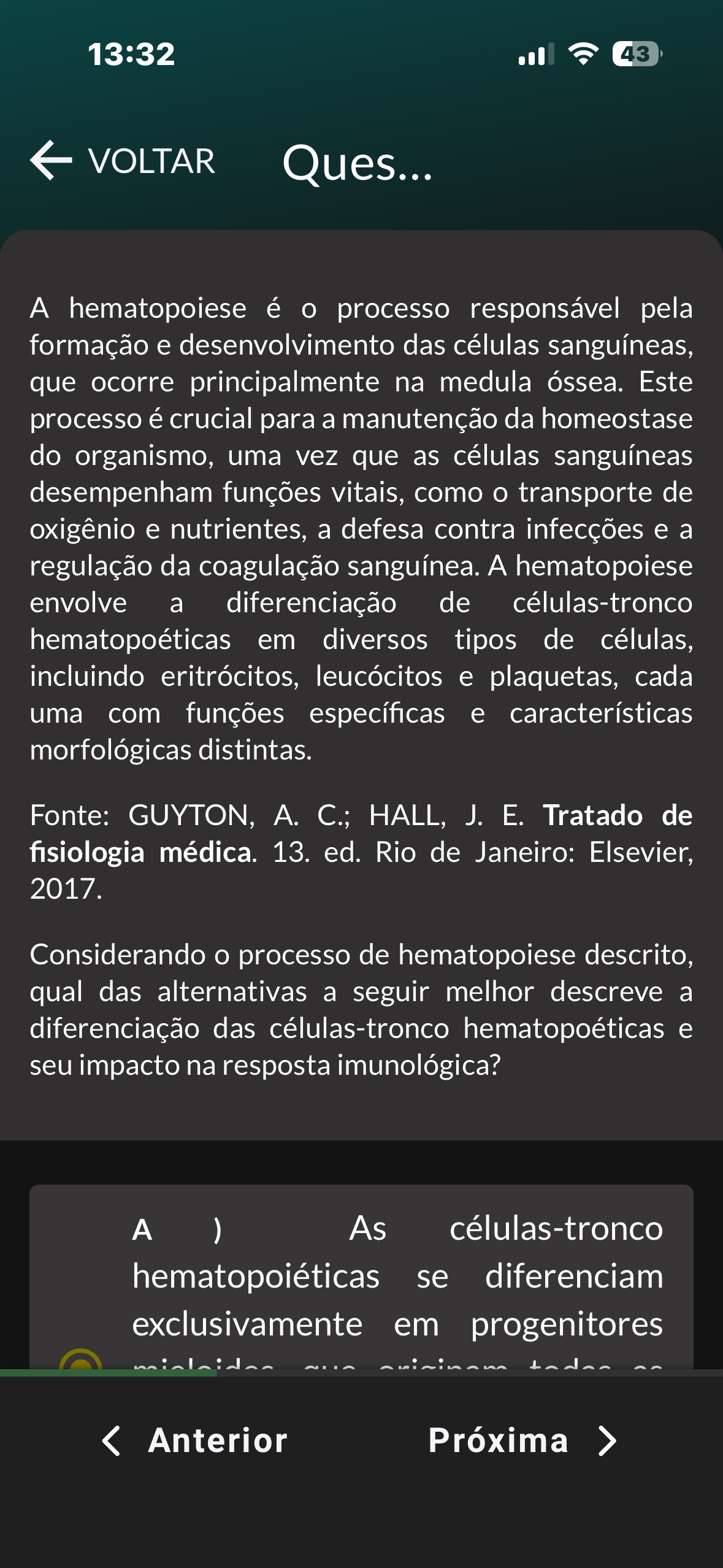 13:32 43 VOLTAR Ques... A hematopoiese é processo responsável pela formação e desenvolvimento das células sanguíneas, que ocorre principalmente na medula óssea. Este processo é crucial para a manutenção da homeostase do organismo, uma vez que as células sanguíneas desempenham funções vitais, como transporte de oxigênio e nutrientes, a defesa contra infecções e a regulação da coagulação sanguínea. A hematopoiese envolve a diferenciação de células-tronco hematopoéticas em diversos tipos de células, incluindo eritrócitos, leucócitos e plaquetas, cada uma com funções específicas e características morfológicas distintas. Fonte: GUYTON, A. C.; HALL, J. Tratado de fisiologia médica. 13. ed. Rio de Janeiro: Elsevier, 2017. Considerando processo de hematopoiese descrito, qual das alternativas a seguir melhor descreve a diferenciação das células-tronco hematopoéticas e seu impacto na resposta imunológica? A ) As células-tronco hematopoiéticas se diferenciam exclusivamente em progenitores Anterior Próxima >