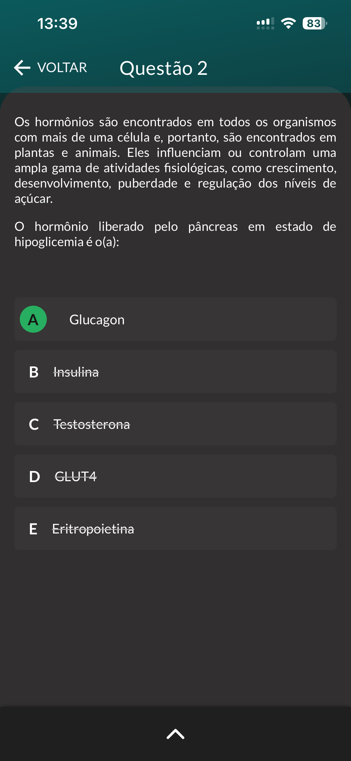 13:39 83 VOLTAR Questão 2 Os hormônios são encontrados em todos os organismos com mais de uma célula e, portanto, são encontrados em plantas e animais. Eles influenciam ou controlam uma ampla gama de atividades fisiológicas, como crescimento, desenvolvimento, puberdade e regulação dos níveis de açúcar. hormônio liberado pelo pâncreas em estado de hipoglicemia é o(a): A Glucagon Insulina c Testosterona D GLUT4 E Eritropoietina