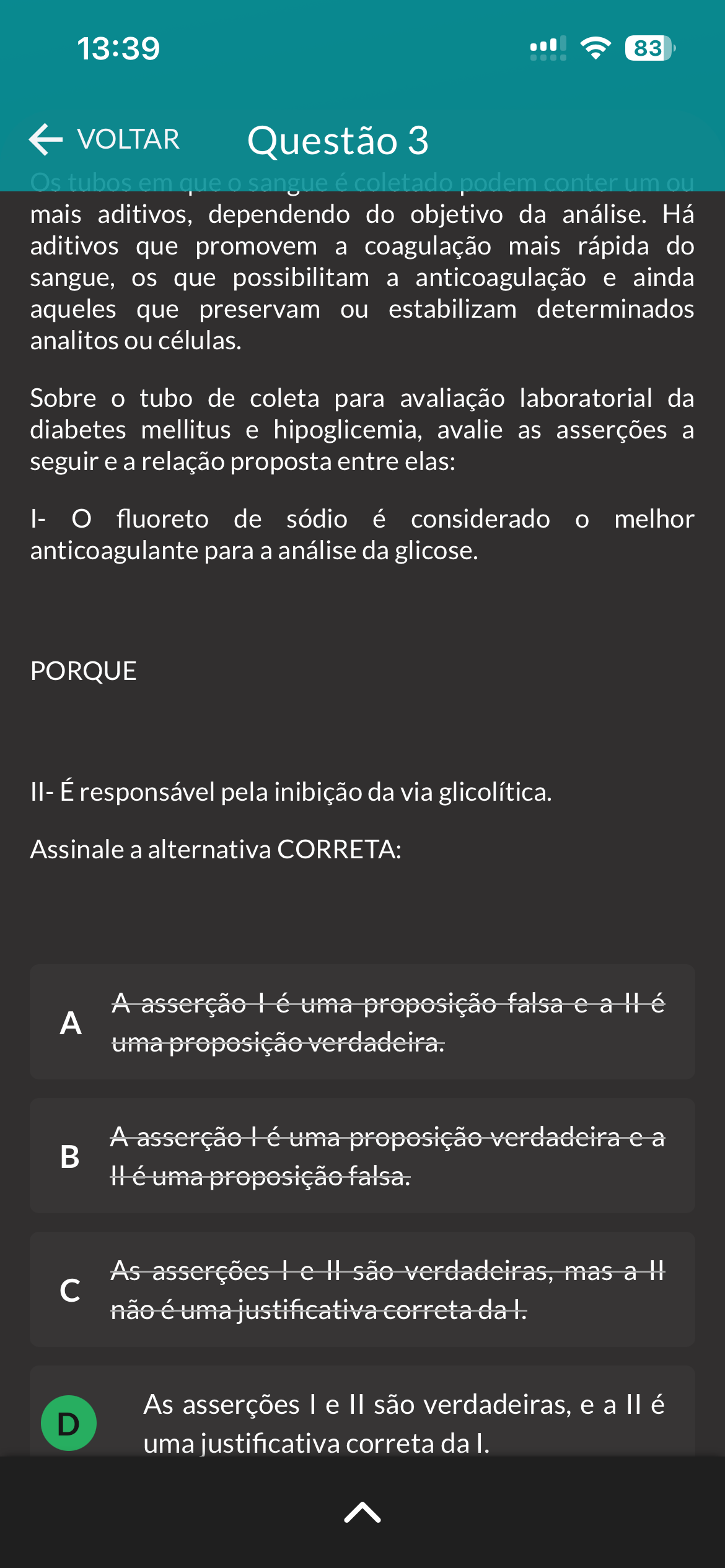 13:39 83 VOLTAR Questão 3 Os tubos em que sangue é coletado podem conter um ou mais aditivos, dependendo do objetivo da análise. Há aditivos que promovem a coagulação mais rápida do sangue, os que possibilitam a anticoagulação e ainda aqueles que preservam ou estabilizam determinados analitos ou células. Sobre tubo de coleta para avaliação laboratorial da diabetes mellitus e hipoglicemia, avalie as asserções a seguir e a relação proposta entre elas: I- fluoreto de sódio é considerado melhor anticoagulante para a análise da glicose. PORQUE II- É responsável pela inibição da via glicolítica. Assinale a alternativa CORRETA: A asserção lé uma proposição falsa e a é A uma proposição verdadeira. A asserção lé uma proposição verdadeira e a é uma proposição falsa. As asserções le são verdadeiras, mas a II c não é uma justificativa correta da As asserções I e são verdadeiras, e a é D uma justificativa correta da I.