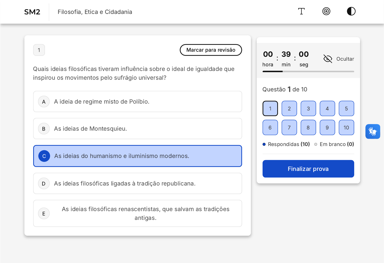A B C D E 1 Marcar para revisão Quais ideias filosóficas tiveram influência sobre o ideal de igualdade que inspirou os movimentos pelo sufrágio universal? A ideia de regime misto de Políbio. As ideias de Montesquieu. As ideias do humanismo e iluminismo modernos. As ideias filosóficas ligadas à tradição republicana. As ideias filosóficas renascentistas, que salvam as tradições antigas. 00 hora : 39 min : 00 seg Ocultar Questão 1 de 10 Respondidas (10) Em branco (0) Finalizar prova 1 2 3 4 5 6 7 8 9 10 SM2 Filosofia, Etica e Cidadania A B C D E 2 Marcar para revisão O humanismo clássico, ao reposicionar o ser humano no centro dos debates culturais do século XVI, instigou uma reavaliação das prioridades da sociedade da época. Qual foi o papel fundamental do humanismo clássico na cultura europeia do século XVI? Promoveu a expansão do império romano. Incentivou a valorização da dignidade humana e tolerância religiosa. Estabeleceu as bases para o feudalismo europeu. Contribuiu para a consolidação da monarquia absolutista. Iniciou as discussões sobre o direito divino dos reis. 3 Marcar para revisão A B C D E A cidade de Digitalville tem experimentado protestos organizados através de plataformas de mídia social. Estes movimentos questionam a eficácia das instituições democráticas tradicionais e buscam formas alternativas de representação política. Considerando o texto, analise as afirmativas abaixo. I. Movimentos organizados através de mídias sociais podem questionar a validade das instituições democráticas. II. As mídias sociais são utilizadas apenas para apoiar instituições democráticas tradicionais. III. Plataformas digitais podem ser utilizadas para buscar formas alternativas de representação política. Assinale a opção que apresenta somente as alternativas corretas. Somente a afirmativa I está correta Somente a afirmativa II está correta Somente as afirmativas I e III estão corretas Somente as afirmativas I e II estão corretas As afirmativas I, II e III estão corretas A B C D E 4 Marcar para revisão A emergência dos periódicos, atrelada inicialmente à demanda por informações dos mercadores, evoluiu, tornando-se um meio robusto de comunicação que permeava diversas camadas da sociedade, incentivando discussões e reflexões que ultrapassavam os limites do comércio. De que maneira a necessidade de informação dos comerciantes influenciou o surgimento dos periódicos? Desmotivou a criação de periódicos, dada a preferência por outras formas de comunicação Impulsionou o surgimento de periódicos para atender à demanda por informações. Incentivou os periódicos a focarem apenas em notícias locais Desencorajou discussões sobre política e economia nos periódicos Limitou os periódicos a apenas discutir temas relacionados à religião. A B C D E 5 Marcar para revisão A democracia agregativa propõe um sistema representativo no qual os líderes podem ser aceitos ou rejeitados pelos cidadãos em processos eleitorais competitivos. Os interesses e preferências da população são a base da organização político-partidária nesse modelo. Na democracia agregativa, o instrumento à disposição do cidadão é o(a): deliberação representação agregação voto discussão 6 Marcar para revisão A B C D E A democracia agregativa é um modelo representativo que se baseia em uma certa distância entre a participação popular e as decisões políticas, que são tomadas por representantes eleitos. É um modelo, contudo, que recebe críticas. Qual a principal crítica ao modelo agregativo? É muito utópico É muito voltado para as classes populares. É muito elitista É muito ultrapassado Exige muito dos cidadãos 7 Marcar para revisão Para Schumpeter, os cidadãos comuns não se interessam pela política, já que haveria um distanciamento entre eles e as questões políticas. Essa constatação é uma crítica direta à noção de ser humano político idealizada A B C D E pelos clássicos. Julgue as alternativas abaixo e escolha a que melhor exprime a crítica de Schumpeter. Falta de racionalidade. Ausência de senso de realidade. Carência de líderes. Fraco espírito cívico. Baixa formação educacional. 8 Marcar para revisão Schumpeter inicia a sua teoria a partir de críticas aos clássicos, criando uma teoria contemporânea de democracia, também chamada de método democrático. Sobre o método democrático de Schumpeter, analise as alternativas abaixo e identifique a que melhor o representa. A B C D E Luta política entre partidos. Disputa por meio de revoltas e revoluções. Influência direta dos eleitores no parlamento. Políticos controlados pelo povo. Luta competitiva pelo voto. 9 Marcar para revisão Suponha que em um país, o partido que está no governo conseguiu 2/3 das cadeiras disponíveis no Congresso. Considerando as proposições de Adam Przeworski, identifique abaixo a alternativa que melhor descreve o cenário desse país. A B C D E Dispersão do poder, governo forte - estabilidade democrática. Concentração de poder, oposição forte - estabilidade democrática. Concentração de poder, oposição fraca - risco democrático. Dispersão de poder, governo fraco - risco democrático. Dispersão equilibrada de poder - estabilidade democrática. 10 Marcar para revisão A democracia agonística é um modelo de democracia que enfatiza o papel do conflito e da competição política na tomada de decisões e na construção de uma sociedade mais justa e igualitária. Nesse sentido, a democracia agonística pode ser definida, sobretudo, pela: A B C D E perspectiva unilateral da justiça sobre a democracia visão de mundo baseada no neoliberalismo cosmovisão liberal-normativa disposição em lidar civilizadamente com os conflitos compreensão do conflito enquanto algo a ser sempre resolvido