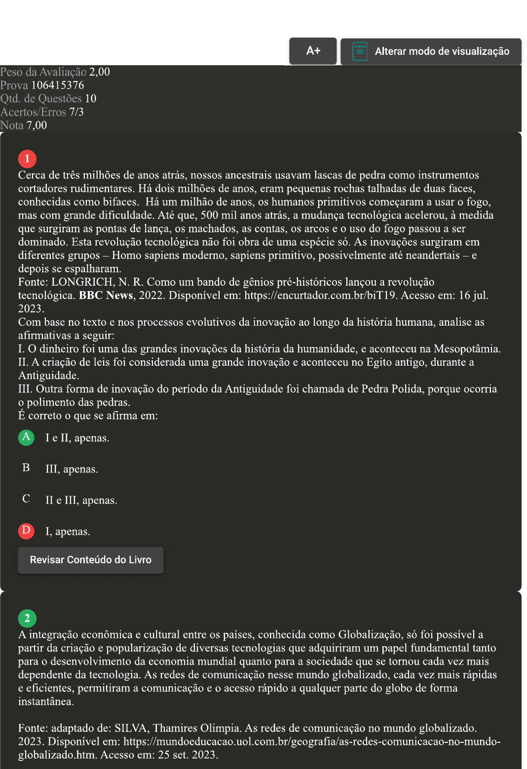 A+ Alterar modo de visualização Peso da Avaliação 2,00 Prova 106415376 Qtd. de Questões 10 Acertos/Erros 7/3 Nota 7,00 1 Cerca de três milhões de anos atrás, nossos ancestrais usavam lascas de pedra como instrumentos cortadores rudimentares. Há dois milhões de anos, eram pequenas rochas talhadas de duas faces, conhecidas como bifaces. Há um milhão de anos, os humanos primitivos começaram a usar o fogo, mas com grande dificuldade. Até que, 500 mil anos atrás, a mudança tecnológica acelerou, à medida que surgiram as pontas de lança, os machados, as contas, os arcos e o uso do fogo passou a ser dominado. Esta revolução tecnológica não foi obra de uma espécie só. As inovações surgiram em diferentes grupos Homo sapiens moderno, sapiens primitivo, possivelmente até neandertais e depois se espalharam. Fonte: LONGRICH, N.R. Como um bando de gênios pré-históricos lançou a revolução tecnológica. BBC News, 2022. Disponível em: Acesso em: 16 jul. 2023. Com base no texto e nos processos evolutivos da inovação ao longo da história humana, analise as afirmativas a seguir: I. dinheiro foi uma das grandes inovações da história da humanidade, e aconteceu na Mesopotâmia. II. A criação de leis foi considerada uma grande inovação e aconteceu no Egito antigo, durante a Antiguidade. III. Outra forma de inovação do período da Antiguidade foi chamada de Pedra Polida, porque ocorria o polimento das pedras. É correto o que se afirma em: A I e II, apenas. III, apenas. II e III, apenas. D I, apenas. Revisar Conteúdo do Livro 2 A integração econômica e cultural entre os países, conhecida como Globalização, só foi possível a partir da criação e popularização de diversas tecnologias que adquiriram um papel fundamental tanto para o desenvolvimento da economia mundial quanto para a sociedade que se tornou cada vez mais dependente da tecnologia. As redes de comunicação nesse mundo globalizado, cada vez mais rápidas e eficientes, permitiram a comunicação e o acesso rápido a qualquer parte do globo de forma instantânea. Fonte: adaptado de: SILVA, Thamires Olimpia. As redes de comunicação no mundo globalizado. 2023. Disponível em: globalizado.htm. Acesso em: 25 set. 2023.Acerca do tema inovação, invenção, seus desafios e potencialidades, analise as afirmações considerando V para verdadeiro e F para falso: ( ) A inovação não é uma decorrência evidente do estado da técnica. ( ) A colaboração e a orientação para o futuro são elementos da inovação. ( ) A inovação pode reunir muitas características ou algumas, em diferentes graus e intensidades. ( ) ato de olhar a sua volta e visualizar os princípios que podem ser identificados em eventos naturais ou em objetos existentes e aplicá-los em busca de solucionar problemas reais é uma habilidade de um inventor. Assinale a alternativa que apresenta a sequência CORRETA: Assinale a alternativa que apresenta a sequência CORRETA: ( ) A inovação não é uma decorrência evidente do estado da técnica. ( ) A colaboração e a orientação para o futuro são elementos da inovação. ( ) A inovação pode reunir muitas características ou algumas, em diferentes graus e intensidades. ato de olhar a sua volta e visualizar os princípios que podem ser identificados em eventos naturais ou em objetos existentes e aplicá-los em busca de solucionar problemas reais é uma habilidade de um inventor. É correto o que se afirma em: A V,V,V,V. F,V,V,V. F,V,V,F. D V,V,V,F. E F,F,V,F. 3 Com o aumento do mundo digital e das conexões que possibilitam encontrar pessoas e realizar reuniões mesmo distante, o uso da internet tem se tornado inevitável. Graças a essa criação, temos tudo na palma da mão, descobrimos meios de pesquisar e nos manter informados a todo momento, conseguimos aprender mais, escolher novos roteiros de lazer, trabalhar de diversas localidades e, o mais importante, se manter conectado com a família e amigos. Como parte da evolução deste processo vale citar o impacto que se teve sobre a Revolução Industrial, levando-nos para a Era da Informação. Deste momento em diante, a tecnologia foi evoluindo gradativamente. Antes era muito utilizada a "internet depois a banda larga e a conexão através do celular com a rede 3G. Fonte: adaptado de: MENDES, M. A Internet e suas constantes inovações tecnológicas! Casa do Desenvolvedor, dez. 2021. Disponível em: https://blog.casadodesenvolvedor.com.br/inovacoes- tecnologicas/. Acesso em 15 ago. 2023. Sobre o exposto, assinale a alternativa correta: A Considerada uma grande inovação, a Revolução Industrial transformou a sociedade.B Graças ao surgimento da internet é possível nos manter informados, mas no mundo do trabalho ainda não é possível estar em diversos locais. Atualmente, mesmo com o surgimento das conexões de banda larga e redes 3G, muitas pessoas só têm acesso à internet discada. D Mesmo na Era da Internet ainda é difícil realizar reuniões on-line e encontrar pessoas que estão distantes de nós. 4 A epigenética é um campo de pesquisa que investiga como os estímulos ambientais podem ativar determinados genes e silenciar outros. Ela permite entender como a experiência é capaz de operar transformações profundas no organismo, mesmo que isso signifique destacar o DNA e não implique em mudar o genoma. Para entender melhor, veja um exemplo: dois irmãos gêmeos univitelinos (com a mesma carga genética) são criados em ambientes separados. Um deles é cercado por cuidados, conforto, afeto e tem atendimento a suas necessidades físicas e emocionais desde a primeira infância. outro irmão, porém, é exposto a um ambiente profundamente ansiogênico. Ele vive em um lar violento, em um território exposto a conflitos armados, sem seus cuidados básicos atendidos, como alimentação e higiene. Além disso, não recebe o mesmo afeto que seu irmão, cujo genoma é igual. EPIGENÉTICA: entenda como o corpo pode ativar 