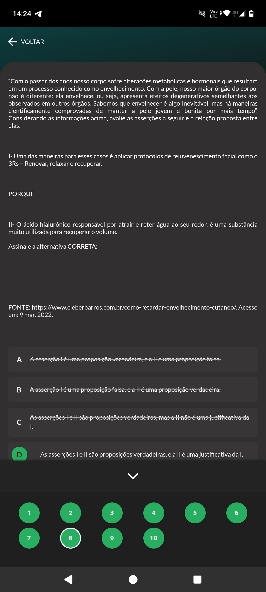 14:24 4G LTE VOLTAR "Com passar dos anos nosso corpo sofre alterações metabólicas e hormonais que resultam em um processo conhecido como envelhecimento. Com a pele, nosso maior órgão do corpo, não é diferente: ela envelhece, ou seja, apresenta efeitos degenerativos semelhantes aos observados em outros órgãos. Sabemos que envelhecer é algo inevitável, mas há maneiras cientificamente comprovadas de manter a pele jovem e bonita por mais tempo". Considerando as informações acima, avalie as asserções a seguir e a relação proposta entre elas: I- Uma das maneiras para esses casos é aplicar protocolos de rejuvenescimento facial como o 3Rs Renovar, relaxar e recuperar. PORQUE II- ácido hialurônico responsável por atrair e reter água ao seu redor, é uma substância muito utilizada para recuperar volume. Assinale a alternativa CORRETA: FONTE: https://www.cleberbarros.com.br/como-retardar-envelhecimento-cutaneo/ Acesso em: 9 mar. 2022. A A asserção lé uma proposição verdadeira, uma proposição falsa. B A asserção lé uma proposição falsa, ea uma proposição verdadeira. As asserções são proposições verdadeiras, mas a não é uma justificativa da c D As asserções e são proposições verdadeiras, e a II é uma justificativa da I. 1 2 3 4 5 6 7 8 9 10