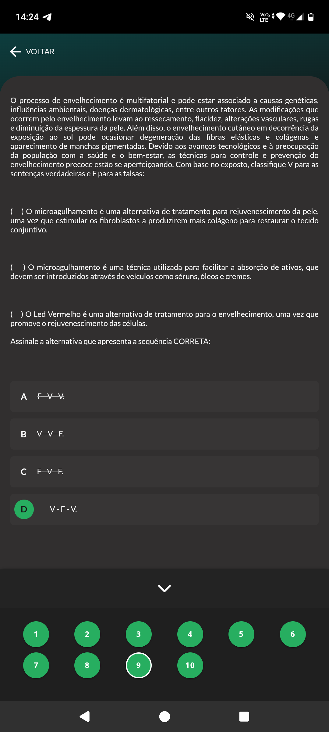 14:24 4G LTE VOLTAR processo de envelhecimento é multifatorial e pode estar associado a causas genéticas, influências ambientais, doenças dermatológicas, entre outros fatores. As modificações que ocorrem pelo envelhecimento levam ao ressecamento, flacidez, alterações vasculares, rugas e diminuição da espessura da pele. Além disso, envelhecimento cutâneo em decorrência da exposição ao sol pode ocasionar degeneração das fibras elásticas e colágenas e aparecimento de manchas pigmentadas. Devido aos avanços tecnológicos e à preocupação da população com a saúde e o bem-estar, as técnicas para controle e prevenção do envelhecimento precoce estão se aperfeiçoando. Com base no exposto, classifique V para as sentenças verdadeiras e F para as falsas: microagulhamento é uma alternativa de tratamento para rejuvenescimento da pele, uma vez que estimular os fibroblastos a produzirem mais colágeno para restaurar tecido conjuntivo. microagulhamento é uma técnica utilizada para facilitar a absorção de ativos, que devem ser introduzidos através de veículos como séruns, óleos e cremes. Led Vermelho é uma alternativa de tratamento para envelhecimento, uma vez que promove rejuvenescimento das células. Assinale a alternativa que apresenta a sequência CORRETA: B c D V-F-V. 1 2 3 4 5 6 7 8 9 10
