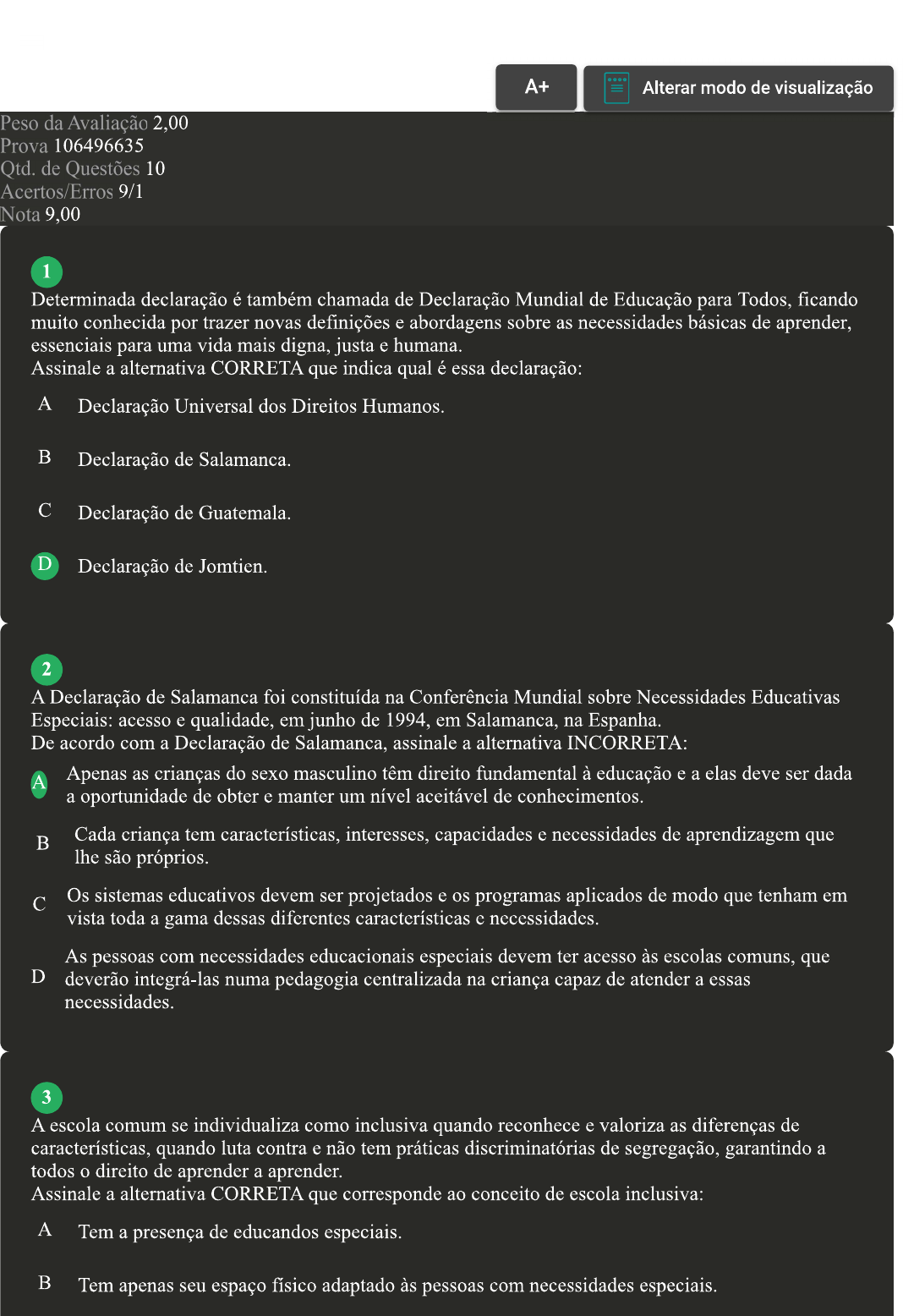 A+ Alterar modo de visualização Peso da Avaliação 2,00 Prova 106496635 Qtd. de Questões 10 Acertos/Erros 9/1 Nota 9,00 1 Determinada declaração é também chamada de Declaração Mundial de Educação para Todos, ficando muito conhecida por trazer novas definições e abordagens sobre as necessidades básicas de aprender, essenciais para uma vida mais digna, justa e humana. Assinale a alternativa CORRETA que indica qual é essa declaração: A Declaração Universal dos Direitos Humanos. Declaração de Salamanca. Declaração de Guatemala. D Declaração de Jomtien. 2 A Declaração de Salamanca foi constituída na Conferência Mundial sobre Necessidades Educativas Especiais: acesso e qualidade, em junho de 1994, em Salamanca, na Espanha. De acordo com a Declaração de Salamanca, assinale a alternativa INCORRETA: Apenas as crianças do sexo masculino têm direito fundamental à educação e a elas deve ser dada a oportunidade de obter e manter um nível aceitável de conhecimentos. B Cada criança tem características, interesses, capacidades e necessidades de aprendizagem que lhe são próprios. Os sistemas educativos devem ser projetados e os programas aplicados de modo que tenham em vista toda a gama dessas diferentes características e necessidades. As pessoas com necessidades educacionais especiais devem ter acesso às escolas comuns, que D deverão integrá-las numa pedagogia centralizada na criança capaz de atender a essas necessidades. 3 A escola comum se individualiza como inclusiva quando reconhece e valoriza as diferenças de características, quando luta contra e não tem práticas discriminatórias de segregação, garantindo a todos o direito de aprender a aprender. Assinale a alternativa CORRETA que corresponde ao conceito de escola inclusiva: A Tem a presença de educandos especiais. B Tem apenas seu espaço físico adaptado às pessoas com necessidades especiais.Assegura a matrícula de pessoas com necessidades especiais. D Deverá oferecer qualidade à permanência com êxito destes alunos e mudança de comportamento da comunidade escolar. 4 A perspectiva da educação inclusiva traz como premissa a prevalência de um único sistema educativo para todos. A respeito disso, assinale a alternativa CORRETA: A Crianças com necessidades educativas especiais, em turmas de educação especial da escola regular. Todas as crianças com deficiências ou necessidades educativas especiais, na escola regular. Todo e qualquer tipo de deficiência ou alta habilidade, na escola de educação especial. D Crianças surdas e cegas na escola de educação especial, a partir do ensino obrigatório de Braille e da Língua de Sinais. 5 A Declaração Universal dos Direitos Humanos (DUDH) é um documento marco na história dos direitos humanos, (DECLARAÇÃO UNIVERSAL DOS DIREITOS HUMANOS, s.d, s.p). Ou seja, esta declaração assegura os mesmos direitos a todos os cidadãos, sem mencionar a existência ou não de necessidades especiais. Sobre o exposto, avalie as asserções a seguir: I- Prover atendimento educacional não especializado para alunos com necessidades educacionais especiais é um dos objetivos da Educação Especial na perspectiva da Educação Inclusiva. PORQUE II- A educação inclusiva constitui um paradigma educacional fundamentado na concepção de direitos humanos. Assinale a alternativa CORRETA: A As asserções I e II são proposições falsas. B A asserção I é uma proposição falsa, e a II é uma proposição verdadeira. As asserções I e II são proposições verdadeiras, mas a II não é uma justificativa da I. D As asserções I e II são proposições verdadeiras. Revisar Conteúdo do Livro 6 Na Antiguidade, estudamos que as atitudes para com crianças "disformes" eram drásticas, para que não houvesse adultos deficientes. Este talvez seja o primeiro registro de proposta de aborto para bebês com problemas. Assinale a alternativa CORRETA que indica quais eram as ações para tal objetivo: A Fortalecer o papel do Estado.B Fortalecer o papel da Igreja. Fazer testes experimentais, afinal, a medicina precisava destas ações. D Ter uma sociedade saudável, forte, com homens aptos para guerrear. Só os fortes sobreviviam. 7 Entre vários registros artísticos desta fase, há um em especial que retrata um homem com deficiência interagindo com outras pessoas. Trata-se, de um homem identificado como Roma, ocupante de um cargo de grande responsabilidade em seus dias: porteiro do templo de um dos deuses egípcios. Sua perna esquerda tem uma anomalia de musculatura e seu pé está atrofiado. Imagina-se que seja devido à poliomielite, conforme afirmam alguns médicos, na atualidade. Pelas dificuldades para andar com segurança, o homem usa um longo bastão para se apoiar. Assinale a alternativa CORRETA que indica qual a maior evidência de deficiência no antigo Egito: A Os artistas da época fizeram uma crítica aos deficientes. As pessoas deficientes foram evidenciadas nas obras de arte como forma de respeito. uso de equipamentos que foi representado na obra de arte. D Que mesmo deficiente eram iguais. 8 sistem educacional é organizado em nívies do enisino. assunto ludicidade tem conquistado um espaço no processo de aprendizado. Assinale a alternativa CORRETA que indica em qual nível: A Educação Infantil. Fundamental 02. Ensino Médio. D Fundamental 01. 9 De acordo com os estudos, podemos perceber que ao longo dos tempos, os termos relacionados à educação inclusiva vem sendo adaptados. Embora os termos sejam parecidos e possam nos confundir, cada um tem um significado. Assinale a alternativa CORRETA que indica qual o significado correto do termo integração: A Trata-se da inclusão de alunos com necessidades especiais em escolas comuns. B Insere o aluno no contexto escolar, mas não o inclui. Trata-se do aluno especial na educação.Ocorre quando as crianças sem necessidades especiais são isoladas e separadas em grupos, em instituições de atend