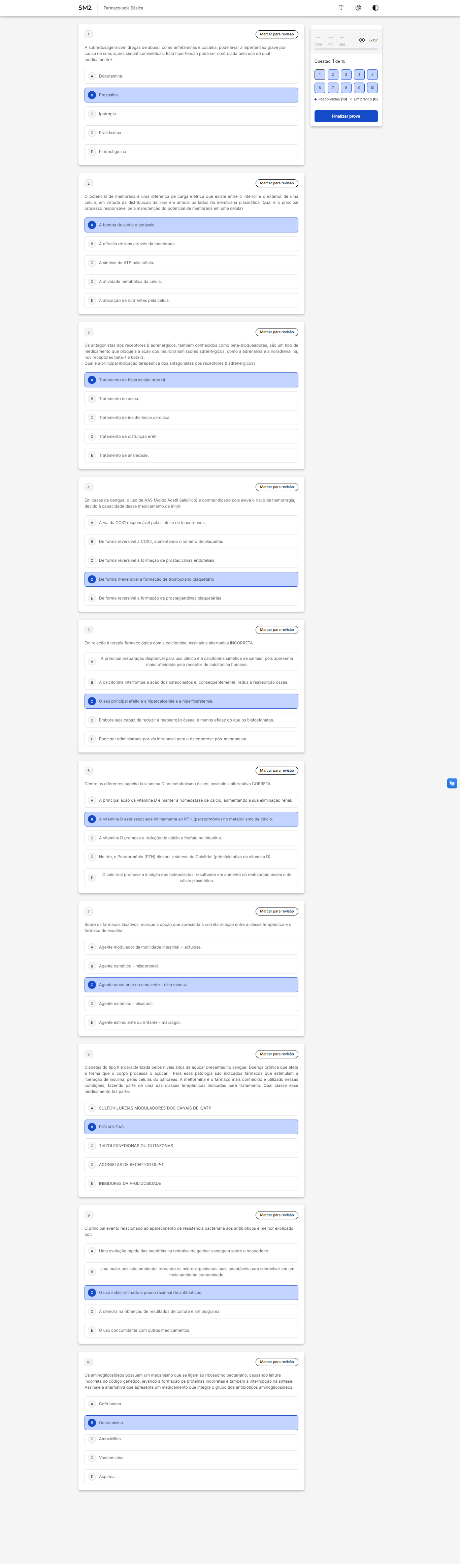 SM2 Farmacologia Básica T - dosagen com drogas como anfetaminas cocaina, pode levar por causa suas ções simpa Esta pode ser controlada pelo uso qual medicamento? Questão 1de 10 A Dobutamina 6 Prazosina D Pralidoxima E Piridostigmina 2 0 potencial de membrana uma diferença de carga elétrica que existe entre interior exterior uma em virtude distribuição em ambos lados Qual principal processo respon do potencial de membrana uma B através membrana sintese D atividade absorção nutrientes 3 Marcar Os intagonistas dos receptores também conhecidos como beta são tipo de medicamento bloqueia ação dos neu otrans como adrenalina nora nos princip indicação dos antagonistas dos receptores tensão arterial. asma Tratamento D Tratamento E Tratamento ansiedade 4 Marcar para revisão dengue AAS Aceti devido dade desse dicamento A responsável pela sintese reversivel COX2 aumentando de reversivel formação prostaciclinas formação reversivel formação de rostagland plaquetárias 5 Marcar terapia com assinale INCORRETA A rincipal preparação para uso clinico sintética de salmão, pois apresenta maior nidade pelo receptor calcitonina humano calcitonina interro mpe ação dos reduz reabsorção hipercalcemia D Embora seja capaz de reduzir menos eficaz que E Pode ser administrada via ntranasal para osteoporose pos -menopausa 6 Marcar dife papéis da A ação da vitamina manter homeostase de aumentando sua eliminação associada metabolismo vitamina promove fosfato D No rim, diminui sintese Calcitriol ativo E alcitriol promove dos resultando em aumento da de 7 Marcar Sobre marque a opção que apresenta correta relação entre lasse escolha A Agente modulador motilidade intestinal lactulose B Agente osmótico Agente umectante emoliente mineral D Agente osmótico E Agente estimulante rritante 8 Marca Diabetes do tipo elos presentes Doença que afeta a forma que corpo processa Para essa patologia são indicados que estimulam iberação pelas celulas pancreas mais conhecido ilizado nessas condições, fazendo parte de uma das classes indicadas para Qual classe esse - medicament parte: A FONIL UREIAS MODULADORES DOS CANAIS K/ATP BIGUANIDAS TIAZOLIDINEDIONAS ITAZONAS D AGONISTAS DE RECEPTOR GLP-1 E NIBIDORES -GLICOSIDADE 9 relacionado de resistência aos explicado por A Uma evolução das na tentativa de ganhar vantagem sobre maior poluição ambienta micro- sobreviver em um B ambiente contaminado ndiscriminado racional D obtenção cultur E oncomitante com outros medicamentos 10 Marcar Os possuem bacteriano causando leitura incorreta do genético levando mação incorretas sintese alter nativa que apresenta um camento que integra dos A D E Aspirina