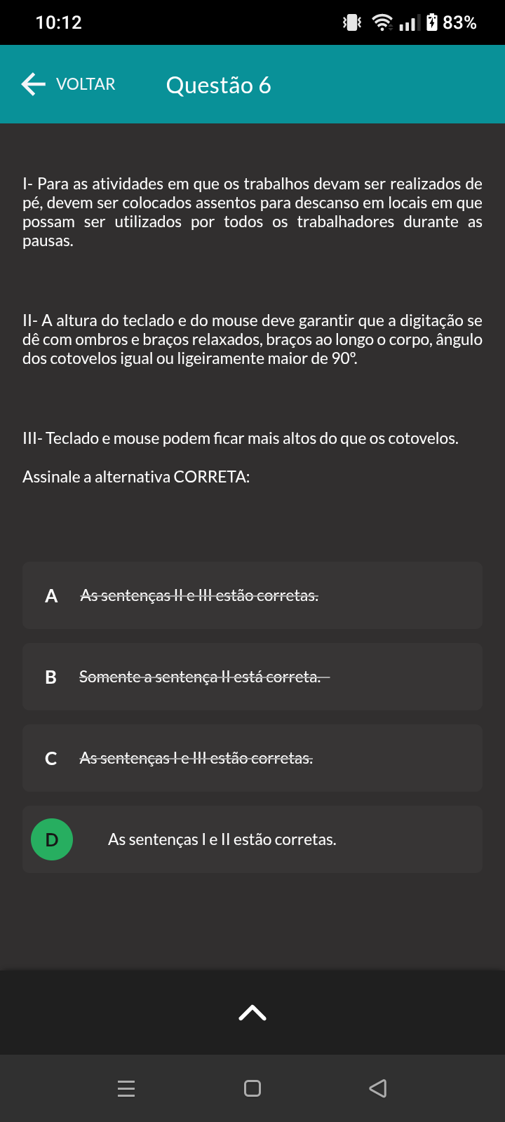 10:12 83% VOLTAR Questão 6 I- Para as atividades em que os trabalhos devam ser realizados de pé, devem ser colocados assentos para descanso em locais em que possam ser utilizados por todos os trabalhadores durante as pausas. II- A altura do teclado e do mouse deve garantir que a digitação se dê com ombros e braços relaxados, braços ao longo corpo, ângulo dos cotovelos igual ou ligeiramente maior de 90°. III- Teclado e mouse podem ficar mais altos do que os cotovelos. Assinale a alternativa CORRETA: A As sentenças estão corretas. Somente a sentença H está correta. c As sentenças le estão corretas. D As sentenças le estão corretas.