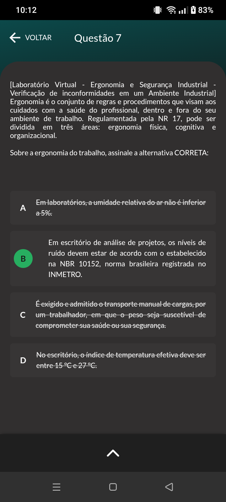 10:12 83% VOLTAR Questão 7 [Laboratório Virtual Ergonomia e Segurança Industrial - Verificação de inconformidades em um Ambiente Industrial] Ergonomia é conjunto de regras e procedimentos que visam aos cuidados com a saúde do profissional, dentro e fora do seu ambiente de trabalho. Regulamentada pela NR 17, pode ser dividida em três áreas: ergonomia física, cognitiva e organizacional. Sobre a ergonomia do trabalho, assinale a alternativa CORRETA: Em laboratórios, a umidade relativa do ar não é inferior A a5%. Em escritório de análise de projetos, os níveis de ruído devem estar de acordo com estabelecido na NBR 10152, norma brasileira registrada no INMETRO. É exigido e admitido transporte manual de cargas, por c um trabalhador, em que peso seja suscetível de comprometer sua saúde ou sua segurança. No escritório, índice de temperatura efetiva deve ser D entre