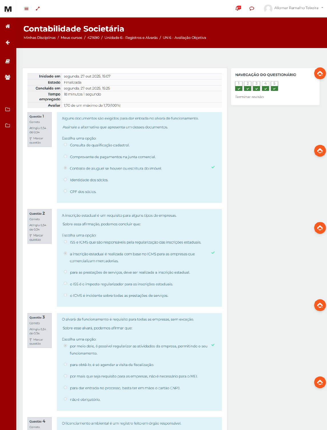 M Aliomar Ramalho Teixeira Contabilidade Societária Minhas Disciplinas / Meus cursos / 421690 / Unidade 6 Registros e Alvarás / UN 6 Avaliação Objetiva Iniciado em segunda, 27 out 2025, 15:07 NAVEGAÇÃO DO QUESTIONÁRIO Estado Finalizada 1 2 3 4 5 Concluída em segunda, 27 out 2025, 15:25 Tempo 18 minutos 1 segundo Terminar revisão empregado Avaliar 1,70 de um máximo de 1,70(100%) Questão 1 Alguns documentos são exigidos para dar entrada no alvará de funcionamento. Correto Atingiu 0,34 Assinale a alternativa que apresenta um desses documentos. de 0,34 P Marcar Escolha uma opção: questão Consulta de qualificação cadastral. Comprovante de pagamentos na junta comercial. Contrato de aluguel se houver ou escritura do imóvel. Identidade dos sócios. CPF dos sócios. Questão 2 A inscrição estadual é um requisito para alguns tipos de empresas. Correto Atingiu 0,34 Sobre essa afirmação, podemos concluir que: de 0,34 P Marcar Escolha uma opção: questão ISS e ICMS que são responsáveis pela regularização das inscrições estaduais. a inscrição estadual é realizada com base no ICMS para as empresas que comercializam mercadorias. para as prestações de serviços, deve ser realizada a inscrição estadual. ISS é imposto regularizador para as inscrições estaduais. ICMS é incidente sobre todas as prestações de serviços. Questão 3 alvará de funcionamento é requisito para todas as empresas, sem exceção. Correto Atingiu 0,34 Sobre esse alvará, podemos afirmar que: de 0,34 P Marcar Escolha uma opção: questão por meio dele, é possível regularizar as atividades da empresa, permitindo seu funcionamento. para obtê-lo, é só agendar a visita da fiscalização. por mais que seja requisito para as empresas, não é necessário para MEI. para dar entrada no processo, basta ter em mãos cartão CNPJ. não é obrigatório. Questão 4 licenciamento ambiental é um registro feito em órgão responsável. CorretoAtingiu 0,34 Nesse contexto, podemos afirmar que licenciamento ambiental é obrigatório para: de 0,34 P Marcar Escolha uma opção: questão todas as empresas que manipulam alimentos. todas as empresas existentes, independentemente do enquadramento fiscal. todas as prestadoras de serviço. aquelas empresas cujas atividades oferecem risco ao meio ambiente e à natureza. todas que comercializam produtos. Questão 5 primeiro passo no momento de constituir uma empresa é realizar registro na junta Correto comercial do seu estado. Atingiu 0,34 de 0,34 Sobre esse registro, podemos afirmar que: Marcar questão Escolha uma opção: empresário pode escolher nome empresarial sem realizar consulta de disponibilidade. para realizá-lo, é necessário ter em mãos contrato social da empresa com todas as diretrizes concretas. para realizá-lo, basta ter em mãos cartão do CNPJ. ao realizar cadastro na junta comercial, os sócios passam por uma consulta de qualificação cadastral. para entrada no processo, são necessários apenas documentos pessoais dos sócios. Terminar revisão Conteúdo Online Seguir para... Exercícios de Fixação MOODLE BY ITVIX