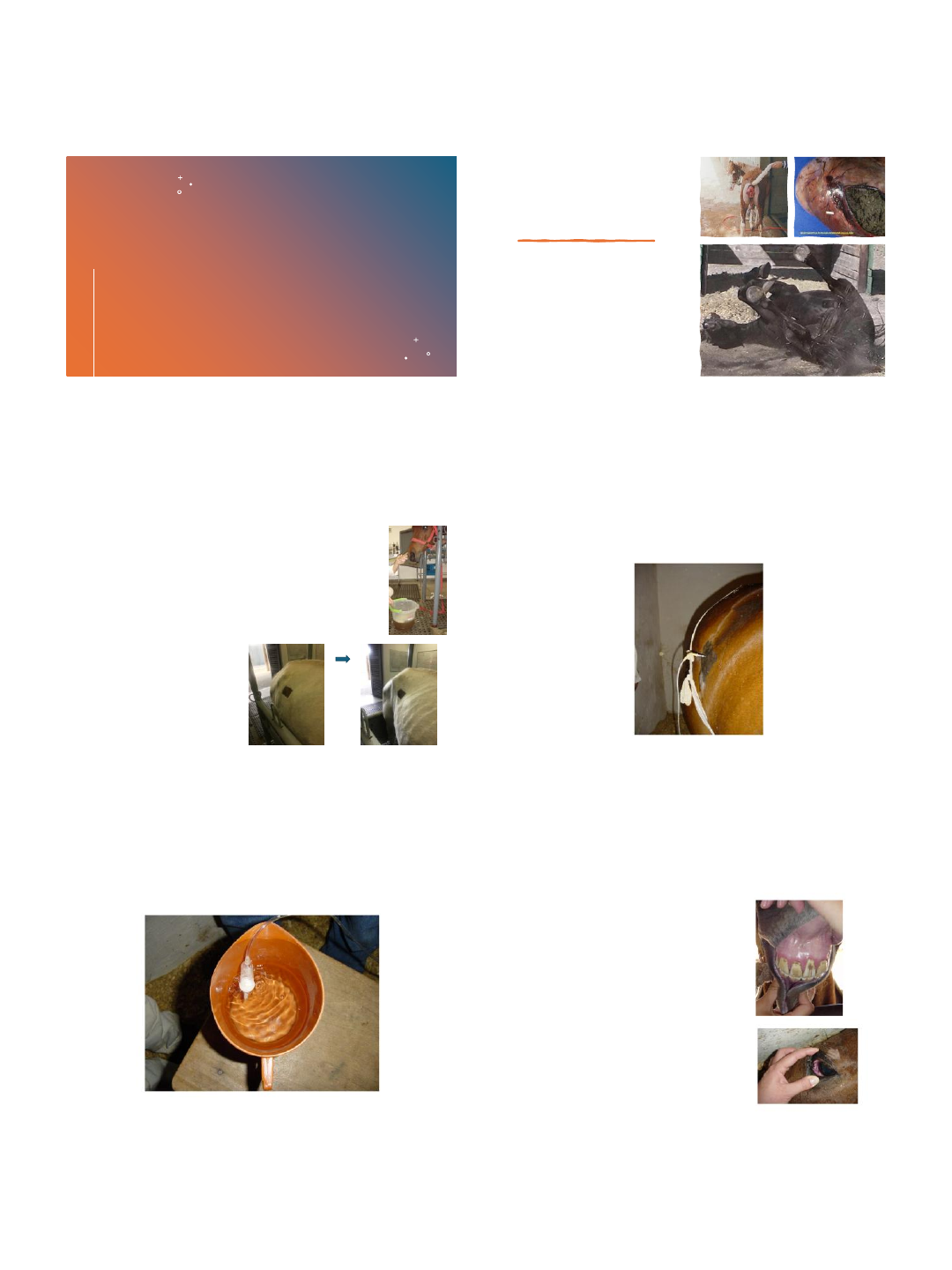 15/09/2025 1 Critérios para avaliação do equino com cólica Medicina e Criação de Equinos Profa Gabriela Marchioni Gabriela Marchioni Considerações: • Decisão: Cirúrgico x Clínico • Cólica = quadro dinâmico • Comparar avaliação clínica prévia e após manobras de descompressão • Na dúvida ..................encaminhar Gabriela Marchioni Conduta Primária Emergencial ou de Urgência • Manobras de Descompressão • Restaurar Equilíbrio Hidroeletrolítico • Melhorar oferta de O2 Gabriela Marchioni Punção do ceco Gabriela Marchioni Gabriela Marchioni Exame clínico Dor Frequência Cardíaca Temperatura Frequência respiratória Coloração das mucosas Tempo de preenchimento capilar Aspecto do refluxo gástrico Paracentese abdominal Palpação retal Ausculta do intestino Gabriela Marchioni 15/09/2025 2 Exame clínico • MUCOSAS: • pálidas- sangramento; anemia. • congestas: toxemia; déficit circulatório • ictéricas: babesia/ figado • TPC • 4 seg diminuição severa da perfusão e choque nestes casos hidratar de maneira agressiva. Gabriela Marchioni Exame clínico • FC • 60 prognóstico ruim • TEMPERATURA • 39,0 agitação? Infecção? Transporte/calor? • FR • Distensão do abdome; acidose; dor Gabriela Marchioni Cirúrgico ou não? • Refluxo gástrico • Palpação retal • Abdominocentese • Condições hemodinâmicas • Dor • Distensão abdominal Gabriela Marchioni Conteúdo gástrico • Aspecto • Quantidade: velocidade de drenagem • Coloração • Odor • pH Gabriela Marchioni 15/09/2025 3 Paracentese / Abdominocentese Gabriela Marchioni Gabriela Marchioni Análise do Líquido Peritoneal • Aspecto Macroscópico • Citologia • Bioquímica Gabriela Marchioni 15/09/2025 4 Gabriela Marchioni FLÚIDOS PERITONIAIS normal hemorrágico turvo ruptura Gabriela Marchioni Paracentese Peritonite Gabriela Marchioni Palpação retal • Posicionamento alças intestinais • Distensão • Sensibilidade ? • Estruturas relacionadas Gabriela Marchioni Palpação Retal • Ceco; Cólon Esquerdo Ventral e Dorsal; Flexura Pélvica; Cólon Descendente • Síbalas-normais/pequenas/secas/ausentes • Aorta-pulso simétrico/frêmito • Baço-margem afilada/não palpável/plano mediano/lig.lienorenal livre • Anel inguinal/vaginal-diâmetro/estruturas • Útero-Responsivo/torção • Bexiga-repleta/cálculos Gabriela Marchioni Gabriela Marchioni Projeção Topográfica 15/09/2025 5 Palpação Retal Gabriela Marchioni Gabriela Marchioni Gabriela Marchioni Gabriela Marchioni Já que temos que ter parâmetros........ • Considerar : • Evolução........o tempo decorrido desde o início da cólica (mais de seis horas), • dor intensa e contínua (incontrolável com analgésicos), distensão abdominal, • atonia intestinal (ausência de peristalse), • ausência de defecação, achados de exame transretal ( Ex: intestino delgado distendido, tênias sob tensão). Gabriela Marchioni DOR • A dor é um critério consistente • Espasmo e distensão. • A dor não tratada diminui a motilidade, aumenta as secreções gástricas e favorece o íleo adinâmico. • Manobras de descompressão = critério dor fidedigno. • Dores de controle mais difícil: afecções estranguladas do intestino delgado; encarceramento espaço nefro-esplênico; enterólitos e distensão do cólon descendente.* Gabriela Marchioni 15/09/2025 6 Cuidados no atendimento para não atrasar o diagnóstico • 1) Não administrar analgésicos potentes e de longa ação, antes de elucidar o diagnóstico. Neste caso alguns animais com afecções cirúrgicas podem dar falsa impressão de melhora ( sintomas podem ficar mascarados) • 2) Retirada da sonda nasogástrica acreditando que o estômago esteja vazio. Neste caso a produção de gás ou a ocorrência de refluxo pode levar a um desdobramento/reagudização com possível ruptura gástrica. • 3) Alimentar precocemente (sob efeito de analgésicos).Neste caso o animal pode estar frente a uma compactação que irá se agravar, podendo levar a ruptura. • 4)Não proceder na abdominocentese por receio de contaminação da cavidade. Neste caso as informações importantes que podem ser obtidas por meio da observação e exame do liquido abdominal não serão utilizadas.( Prognóstico e diagnóstico) Gabriela Marchioni Quais os casos que devem ser encaminhados? • Afecções cirúrgicas com diagnóstico fechado ou certeza de quadro estrangulativo • Aqueles que necessitam tratamento e acompanhamento intensivo ( Ex: Fluidoterapia, paracentese seriada). • quadro indefinido (cirúrgico ou clinico??): evitar rápida deterioração caso seja cirúrgico. Gabriela Marchioni Transporte para o hospital • TODOS os animais de ser transportados com sonda naso-gástrica. • Potros ou éguas devem ser transportados com suas mães ou vice versa. • A rápida transferência de um paciente cirúrgico para o hospital irá determinar a diferença entre a morte e a sobrevivência. • É preferível para o paciente, proprietário e veterinário transferir um animal que não seja eminentemente um caso cirúrgico ao invés de atrasar a internação de um caso cirúrgico. Gabriela Marchioni Gabriela Marchioni