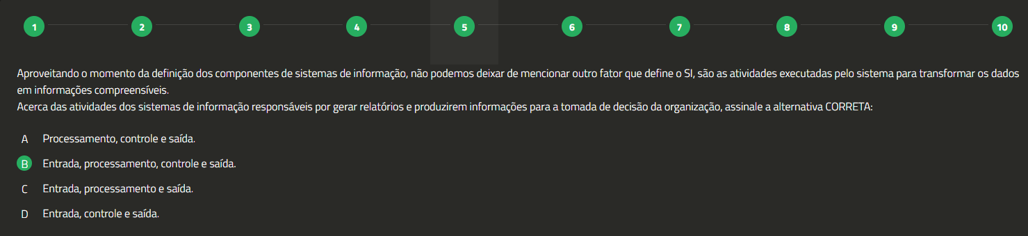 1 2 3 4 5 6 7 8 9 10 Aproveitando momento da definição dos componentes de sistemas de informação, não podemos deixar de mencionar outro fator que define 0 SI, são as atividades executadas pelo sistema para transformar dados em informações compreensíveis. Acerca das atividades dos sistemas de informação responsáveis por gerar relatórios e produzirem informações para a tomada de decisão da organização, assinale a alternativa CORRETA: A Processamento, controle e saída. Entrada, processamento, controle e saída. Entrada, processamento e saída. D Entrada, controle e saída.