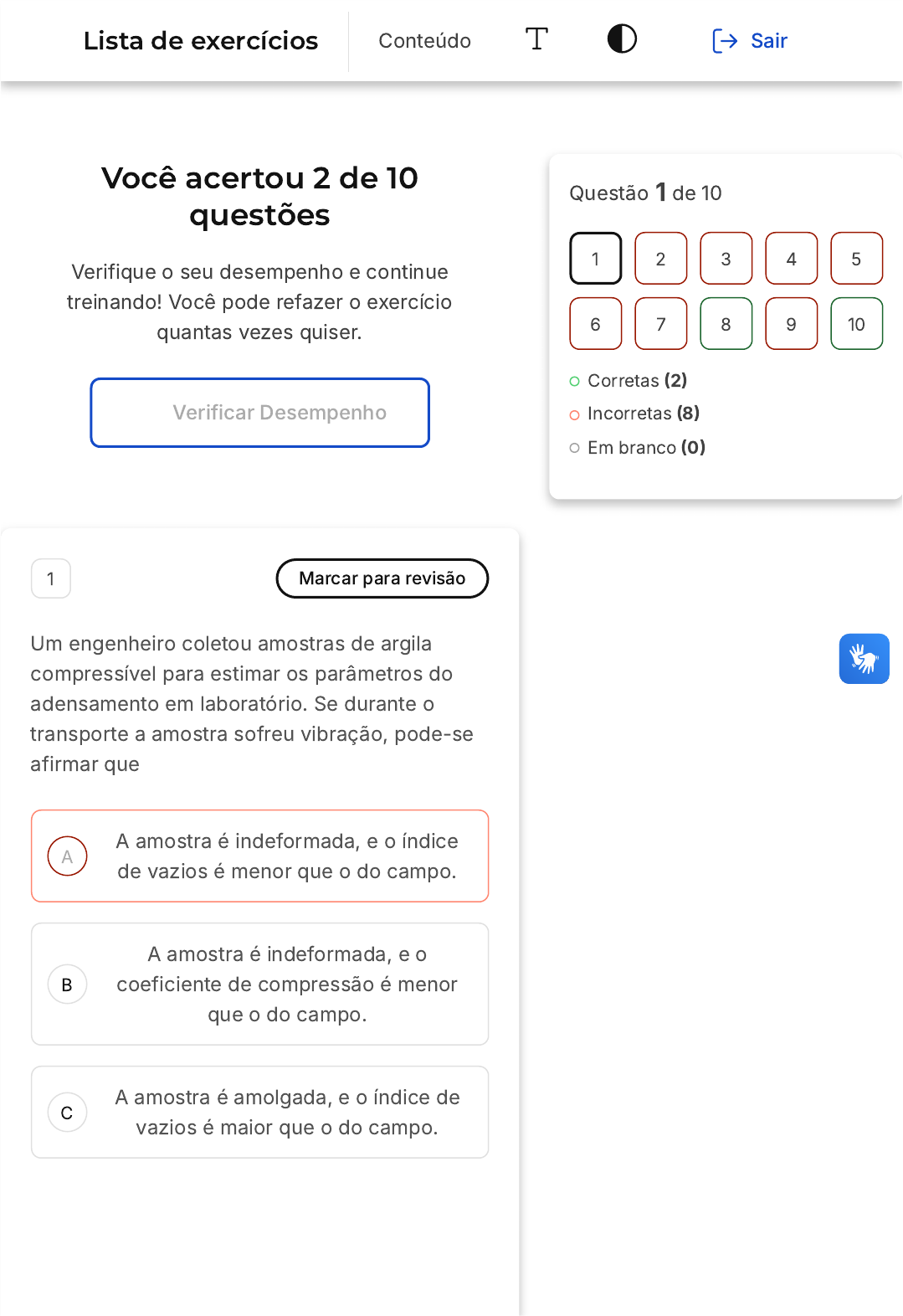 Você acertou 2 de 10 questões Verifique o seu desempenho e continue treinando! Você pode refazer o exercício quantas vezes quiser. Verificar Desempenho A B C 1 Marcar para revisão Um engenheiro coletou amostras de argila compressível para estimar os parâmetros do adensamento em laboratório. Se durante o transporte a amostra sofreu vibração, pode-se afirmar que A amostra é indeformada, e o índice de vazios é menor que o do campo. A amostra é indeformada, e o coeficiente de compressão é menor que o do campo. A amostra é amolgada, e o índice de vazios é maior que o do campo. Questão 1 de 10 Corretas (2) Incorretas (8) Em branco (0) 1 2 3 4 5 6 7 8 9 10 Lista de exercícios Conteúdo Sair D E A amostra é amolgada, e o coeficiente de compressão é maior que o do campo. A amostra é amolgada, e o coeficiente de recompressão é maior que o do campo. Resposta incorreta Opa! A alternativa correta é a letra E. Confira o gabarito comentado! Gabarito Comentado A alternativa correta é a E, que afirma que a amostra é amolgada e o coeficiente de recompressão é maior que o do campo. Isso ocorre porque a vibração durante o transporte pode causar deformações na amostra, tornando-a amolgada. Além disso, essa deformação pode aumentar o coeficiente de recompressão, pois a amostra pode ter uma maior tendência a se recomprimir após ser deformada. Portanto, a vibração durante o transporte pode alterar as propriedades da amostra, afetando os resultados dos testes de adensamento em laboratório. 2 Marcar para revisão A deformação que ocorre lentamente em solos em consequência da expulsão de água dos poros devido à aplicação de carregamento é chamada de A B C D E recalque imediato. adensamento primário. adensamento secundário. recalque por adensamento. ressecamento por adensamento. Resposta incorreta Opa! A alternativa correta é a letra D. Confira o gabarito comentado! Gabarito Comentado A saída de água resulta, naturalmente, na diminuição da camada do solo. A essa diminuição dá-se o nome de recalque por adensamento. 3 Marcar para revisão Para um solo que apresente coeficiente de adensamento de 0,22m²/ano, espessura de 2m e distância de drenagem de 1m, após 3 meses de adensamento o grau de adensamento deverá, de acordo com a tabela abaixo, ser de aproximadamente: Tabela 1 - Pares U x T da Curva de adensamento. Fonte: Adaptado de Pinto (2006) A B C D E 85%. 45%. 15%. 25%. 70%. Resposta incorreta Opa! A alternativa correta é a letra D. Confira o gabarito comentado! Gabarito Comentado A B C D E A resposta certa é: 25%. 4 Marcar para revisão Seja um aterro que deverá ser construído para a futura implantação de uma rodovia, e que o solo do leito e subleito na região seja composto por argila muito mole. Para acelerar os recalques, o engenheiro pode propor a implantação de sobrecarga. drenos verticais de areia. drenos verticais de argila. estacas de fundação. jet grouting. Resposta incorreta Opa! A alternativa correta é a letra B. Confira o gabarito comentado! Gabarito Comentado Os drenos verticais de areia são uma técnica comumente utilizada para acelerar o processo de recalque em solos moles, como a argila. Esses drenos permitem que a água contida no solo seja expelida mais rapidamente, reduzindo o tempo de recalque. Portanto, em um cenário onde o A B C D E solo do leito e subleito é composto por argila muito mole, a implantação de drenos verticais de areia seria uma solução eficaz proposta pelo engenheiro. 5 Marcar para revisão A forma mais acurada de se obter o coeficiente de adensamento para estimativa de recalques e tempo até que ocorra em adensamentos em solos é por meio do (a): Método de Taylor a partir dos resultados de ensaio edométrico. Método de Casagrande a partir dos resultados de ensaio edométrico. Método de Pacheco e Silva a partir dos resultados de ensaio edométrico. Correlações com o índice de plasticidade. Retroanálise de casos reais em campo. Resposta incorreta Opa! A alternativa correta é a letra E. Confira o gabarito comentado! Gabarito Comentado A alternativa correta é a "E", que menciona a retroanálise de casos reais em campo. A B C D E Isso significa que, para obter o coeficiente de adensamento mais preciso para estimar recalques e o tempo até que ocorram em adensamentos em solos, é mais eficaz analisar casos reais que já ocorreram. Isso permite uma compreensão mais profunda e precisa das condições do solo e de como ele reage sob certas circunstâncias, proporcionando uma estimativa mais acurada. Os outros métodos mencionados nas alternativas A, B, C e D, embora úteis, não fornecem a mesma precisão que a análise de casos reais. 6 Marcar para revisão A Equação do Adensamento para estimativa do processo de expulsão de água, no tempo, dos poros do solo devido à aplicação de uma carga faz parte do(a): Lei de Darcy. Princípio das Tensões Efetivas de Terzaghi. Lei de Hooke. Teoria da Elasticidade. Teoria do Adensamento de Terzaghi. Resposta incorreta A B C D E Opa! A alternativa correta é a letra E. Confira o gabarito comentado! Gabarito Comentado A Teoria do Adensamento de Terzaghi é uma teoria que descreve o processo de compactação do solo, ou seja, a expulsão de água dos poros do solo devido à aplicação de uma carga. A equação do adensamento é uma equação que descreve o comportamento do solo durante o processo de compactação. 7 Marcar para revisão Segundo a Teoria do Adensamento de Terzaghi, ao se aplicar um acréscimo de carga em um solo saturado, quem suporta o carregamento? São os grãos e a água intersticial. São os grãos. É a água intersticial. É o ar. São o ar e os grãos. A B Resposta incorreta Opa! A alternativa correta é a letra C. Confira o gabarito comentado! Gabarito Comentado De acordo com a Teoria do Adensamento de Terzaghi, quando um acréscimo de carga é aplicado em um solo saturado, a água intersticial é quem suporta o carregamento.