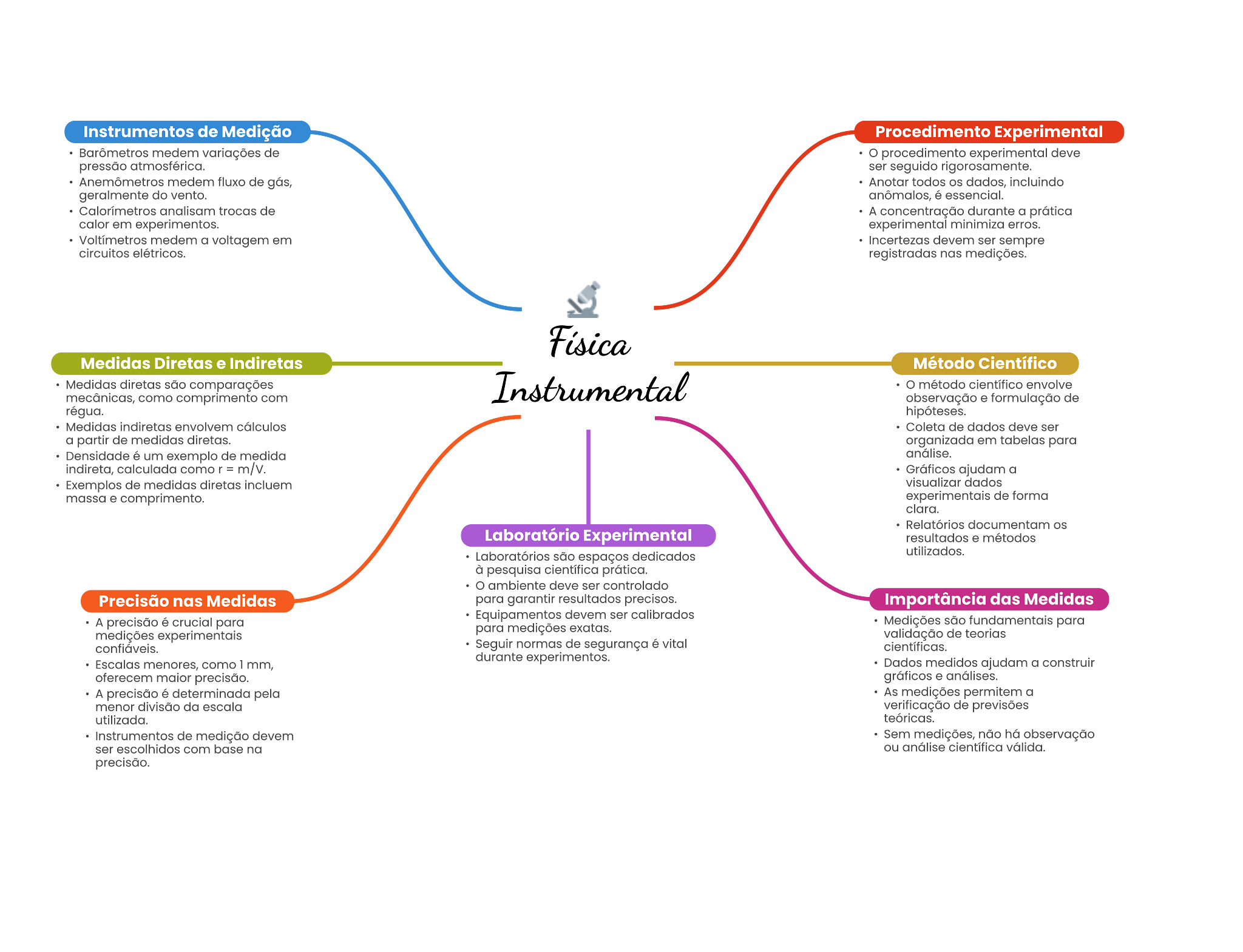 Instrumentos de Medição Procedimento Experimental madem variações de procedimento ser seguido medem fluxo de Anotor todos dados, do vento. anômalos, trocas de A concentração durante a prática calor em experimentos. experimental minimiza erros. Voltimetros medem a voltagem em devem ser sempre circuitos elétricos. registrados medições. Medidas Diretas e Indiretas Método Científico Medidas são comparações método envolve mecânicas, como comprimento com observação formulação de régua. Medicias indiretas envolvem cálculos Coleta de dados deve ser a partir de medidas diretas. organizada em para Densidade um exemplo de medida indireta, calculada como m/V. Gráficos ajudam Exemplos de medidas diretas incluem visualizar massa comprimento. de forma clara. Relatórios documentam Laboratório Experimental resultados métodos Laboratórios espaços dedicados utilizados. à pesquisa ambiente deve ser controlado Precisão nas Medidas para garantir resultados precisos. Importância das Medidas A crucial para Equipamentos devem ser para medições Medições são para medições experimentale validação de Seguir normas de segurança vital Escalas como 1 mm, durante experimentos. ajudam a construir oferecem maior gráficos A determinada pela medições permitem a menor da escala verificação de previeões utilizada. de medição devem Sem medições, não há observação ser escolhidos com base na ou análise cientifica precisão.