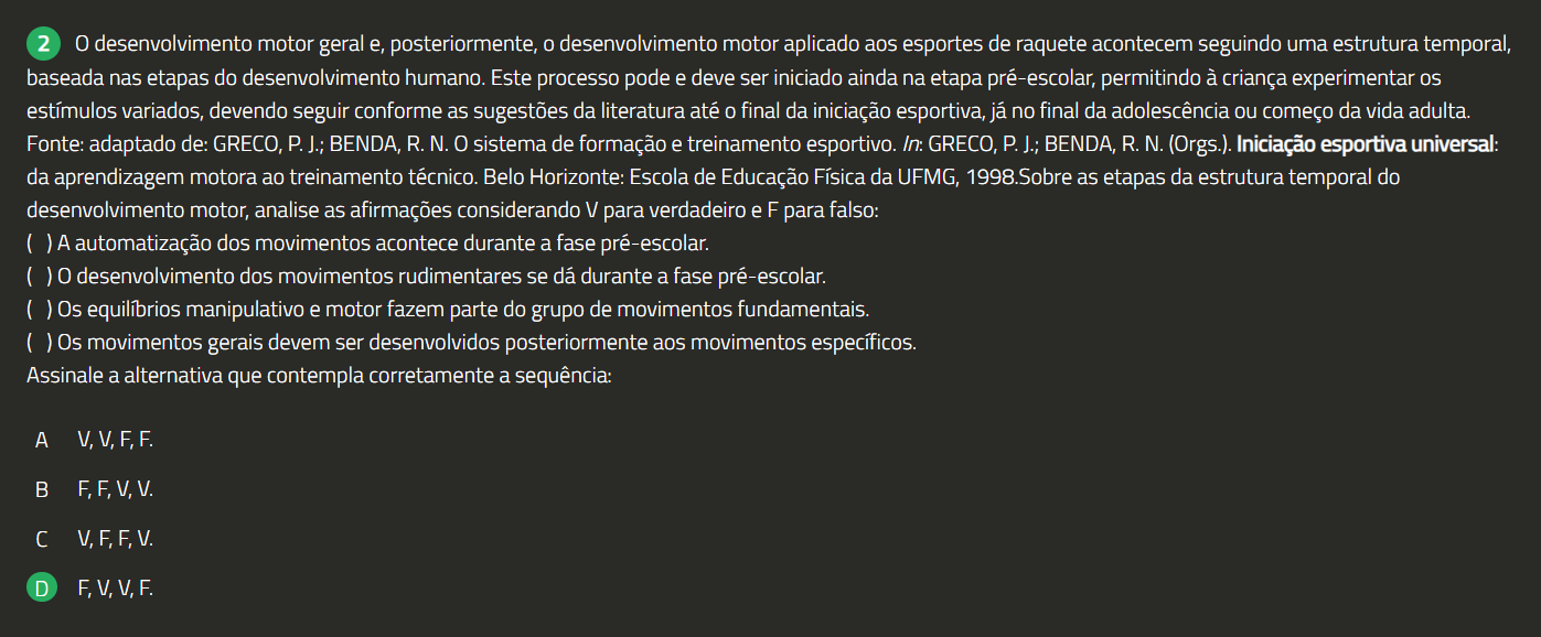 2 0 desenvolvimento motor geral e, posteriormente, 0 desenvolvimento motor aplicado aos esportes de raquete acontecem seguindo uma estrutura temporal, baseada nas etapas do desenvolvimento humano. Este processo pode e deve ser iniciado ainda na etapa pré-escolar, permitindo à criança experimentar estímulos variados, devendo seguir conforme as sugestões da literatura até 0 final da iniciação esportiva, já no final da adolescência ou começo da vida adulta. Fonte: adaptado de: GRECO, P. J.; BENDA, R.N. 0 sistema de formação e treinamento esportivo. In: GRECO, P. J.; BENDA, R.N. (Orgs.). Iniciação esportiva universal: da aprendizagem motora ao treinamento técnico. Belo Horizonte: Escola de Educação Física da UFMG, 1998.Sobre as etapas da estrutura temporal do desenvolvimento motor, analise as afirmações considerando V para verdadeiro e F para falso: A automatização dos movimentos acontece durante a fase pré-escolar. ( ) 0 desenvolvimento dos movimentos rudimentares se dá durante a fase pré-escolar. ( ) Os equilíbrios manipulativo e motor fazem parte do grupo de movimentos fundamentais. Os movimentos gerais devem ser desenvolvidos posteriormente aos movimentos específicos. Assinale a alternativa que contempla corretamente a sequência: A B F,F,V,V. V,F,F,V. D F,V,V,F.