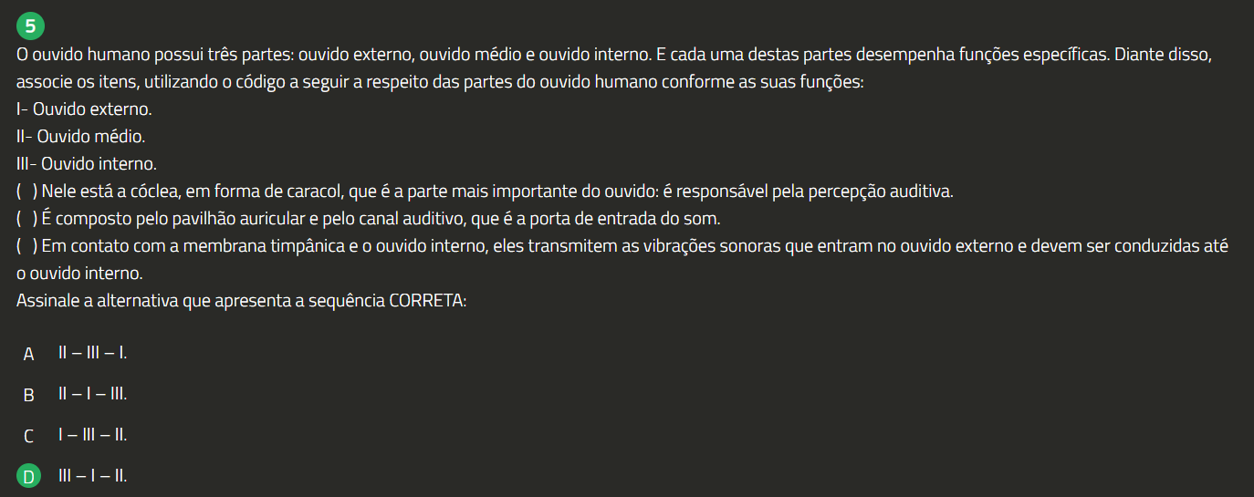 5 0 ouvido humano possui três partes: ouvido externo, ouvido médio e ouvido interno. E cada uma destas partes desempenha funções específicas. Diante disso, associe itens, utilizando 0 código a seguir a respeito das partes do ouvido humano conforme as suas funções: I- Ouvido externo. II- Ouvido médio. III- Ouvido interno. Nele está a cóclea, em forma de caracol, que é a parte mais importante do ouvido: é responsável pela percepção auditiva. É composto pelo pavilhão auricular e pelo canal auditivo, que é a porta de entrada do som. Em contato com a membrana timpânica e 0 ouvido interno, eles transmitem as vibrações sonoras que entram no ouvido externo e devem ser conduzidas até ouvido interno. Assinale a alternativa que apresenta a sequência CORRETA: A III I. B III. III II. D III - II.