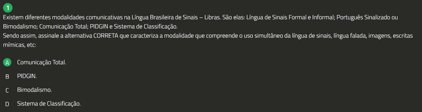 1 Existem diferentes modalidades comunicativas na Língua Brasileira de Sinais - Libras. São elas: Língua de Sinais Formal e Informal; Português Sinalizado ou Bimodalismo; Comunicação Total; PIDGIN e Sistema de Classificação. Sendo assim, assinale a alternativa CORRETA que caracteriza a modalidade que compreende 0 uso simultâneo da língua de sinais, língua falada, imagens, escritas mímicas, etc: A Comunicação Total. B PIDGIN. Bimodalismo. D Sistema de Classificação.