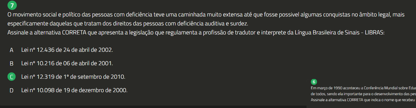 7 0 movimento social e político das pessoas com deficiência teve uma caminhada muito extensa até que fosse possivel algumas conquistas no âmbito legal, mais especificamente daquelas que tratam dos direitos das pessoas com deficiência auditiva e surdez. Assinale a alternativa CORRETA que apresenta a legislação que regulamenta a profissão de tradutor e interprete da Língua Brasileira de Sinais LIBRAS: A Lei n° 12.436 de 24 de abril de 2002. B Lei n° 10.216 de 06 de abril de 2001. Lei n° 12.319 de 1° de setembro de 2010. 6 D Lei n° 10.098 de 19 de dezembro de 2000. Em março de 1990 aconteceu a Conferência Mundial sobre Educ de todos, sendo ela importante para 0 desenvolvimento das pes Assinale a alternativa CORRETA que indica 0 nome que recebeu