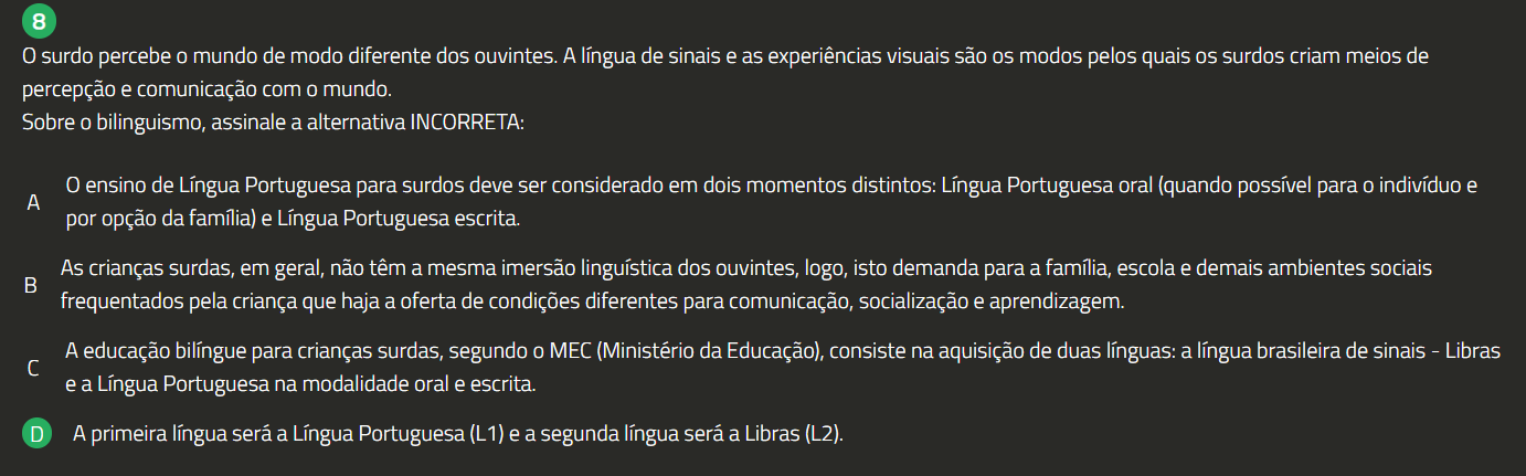 8 0 surdo percebe 0 mundo de modo diferente dos ouvintes. A língua de sinais e as experiências visuais são OS modos pelos quais surdos criam meios de percepção e comunicação com 0 mundo. Sobre 0 bilinguismo, assinale a alternativa INCORRETA: 0 ensino de Língua Portuguesa para surdos deve ser considerado em dois momentos distintos: Língua Portuguesa oral (quando possível para 0 indivíduo e A por opção da família) e Língua Portuguesa escrita. As crianças surdas, em geral, não têm a mesma imersão linguística dos ouvintes, logo, isto demanda para a família, escola e demais ambientes sociais B frequentados pela criança que haja a oferta de condições diferentes para comunicação, socialização e aprendizagem. A educação bilíngue para crianças surdas, segundo 0 MEC (Ministério da Educação), consiste na aquisição de duas línguas: a língua brasileira de sinais Libras e a Língua Portuguesa na modalidade oral e escrita. D A primeira língua será a Língua Portuguesa (L1) e a segunda língua será a Libras (L2).