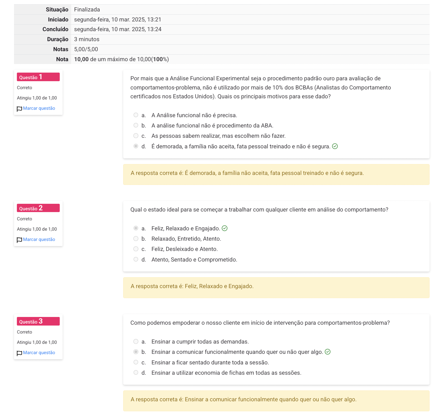 Situação Finalizada Iniciado segunda-feira, 10 mar. 2025, 13:21 Concluído segunda-feira, 10 mar. 2025, 13:24 Duração 3 minutos Notas 5,00/5,00 Nota 10,00 de um máximo de 10,00(100%) Questão 1 Por mais que a Análise Funcional Experimental seja procedimento padrão ouro para avaliação de Correto comportamentos-problema, não é utilizado por mais de 10% dos BCBAs (Analistas do Comportamento Atingiu 1,00 de 1,00 certificados nos Estados Unidos). Quais principais motivos para esse dado? Marcar questão a. A Análise funcional não é precisa. b. A análise funcional não é procedimento da ABA. C. As pessoas sabem realizar, mas escolhem não fazer. d. É demorada, a família não aceita, fata pessoal treinado e não é segura. A resposta correta é: É demorada, a família não aceita, fata pessoal treinado e não é segura. Questão 2 Qual estado ideal para se começar a trabalhar com qualquer cliente em análise do comportamento? Correto Atingiu 1,00 de 1,00 a. Feliz, Relaxado e Engajado. Marcar questão b. Relaxado, Entretido, Atento. C. Feliz, Desleixado e Atento. d. Atento, Sentado e Comprometido. A resposta correta é: Feliz, Relaxado e Engajado. Questão 3 Como podemos empoderar nosso cliente em início de intervenção para Correto Atingiu 1,00 de 1,00 a. Ensinar a cumprir todas as demandas. Marcar questão b. Ensinar a comunicar funcionalmente quando quer ou não quer algo. C. Ensinar a ficar sentado durante toda a sessão. d. Ensinar a utilizar economia de fichas em todas as sessões. A resposta correta é: Ensinar a comunicar funcionalmente quando quer ou não quer algo.