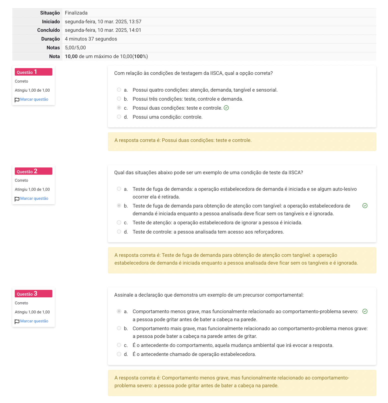Situação Finalizada Iniciado segunda-feira, 10 mar. 2025, 13:57 Concluído segunda-feira, 10 mar. 2025, 14:01 Duração 4 minutos 37 segundos Notas 5,00/5,00 Nota 10,00 de um máximo de 10,00(100%) Questão 1 Com relação às condições de testagem da IISCA, qual a opção correta? Correto Atingiu 1,00 de 1,00 a. Possui quatro condições: atenção, demanda, tangível e sensorial. Marcar questão b. Possui três condições: teste, controle e demanda. C. Possui duas condições: teste e controle. d. Possui uma condição: controle. A resposta correta é: Possui duas condições: teste e controle. Questão 2 Qual das situações abaixo pode ser um exemplo de uma condição de teste da IISCA? Correto Atingiu 1,00 de 1,00 a. Teste de fuga de demanda: a operação estabelecedora de demanda é iniciada e se algum auto-lesivo Marcar questão ocorrer ela é retirada. b. Teste de fuga de demanda para obtenção de atenção com t tangível: a operação estabelecedora de demanda é iniciada enquanto a pessoa analisada deve ficar sem os tangíveis e é ignorada. C. Teste de atenção: a operação estabelecedora de ignorar a pessoa é iniciada. d. Teste de controle: a pessoa analisada tem acesso aos reforçadores. A resposta correta é: Teste de fuga de demanda para obtenção de atenção com tangível: a operação estabelecedora de demanda é iniciada enquanto a pessoa analisada deve ficar sem os tangíveis e é ignorada. Questão 3 Assinale a declaração que demonstra um exemplo de um precursor comportamental: Correto Atingiu 1,00 de 1,00 a. Comportamento menos grave, mas funcionalmente relacionado ao comportamento-problema severo: Marcar questão a pessoa pode gritar antes de bater a cabeça na parede. b. Comportamento mais grave, mas funcionalmente relacionado ao comportamento-problema menos grave: a pessoa pode bater a cabeça na parede antes de gritar. C. É antecedente do comportamento, aquela mudança ambiental que irá evocar a resposta. d. É antecedente chamado de operação estabelecedora. A resposta correta é: Comportamento menos grave, mas funcionalmente relacionado ao comportamento- problema severo: a pessoa pode gritar antes de bater a cabeça na parede.