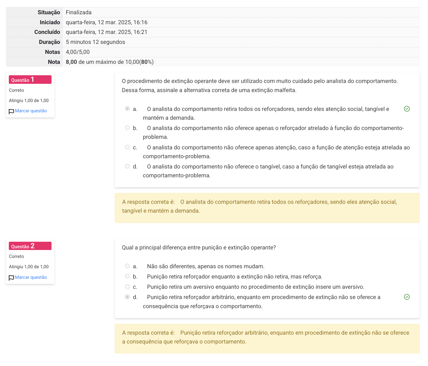 Situação Finalizada Iniciado quarta-feira, 12 mar. 2025, 16:16 Concluído quarta-feira, 12 mar. 2025, 16:21 Duração 5 minutos 12 segundos Notas 4,00/5,00 Nota 8,00 de um máximo de 10,00(80%) Questão 1 0 procedimento de extinção operante deve ser utilizado com muito cuidado pelo analista do comportamento. Correto Dessa forma, assinale a alternativa correta de uma extinção malfeita. Atingiu 1,00 de 1,00 Marcar questão a. 0 analista do comportamento retira todos reforçadores, sendo eles atenção social, tangível e mantém a demanda. b. analista do comportamento não oferece apenas reforçador atrelado à função do comportamento- problema. C. analista do comportamento não oferece apenas atenção, caso a função de atenção esteja atrelada ao comportamento-problema. d. analista do comportamento não oferece tangível, caso a função de tangível esteja atrelada ao comportamento-problema. A resposta correta é: 0 analista do comportamento retira todos reforçadores, sendo eles atenção social, tangível e mantém a demanda. Questão 2 Qual a principal diferença entre punição e extinção operante? Correto Atingiu 1,00 de 1,00 a. Não são diferentes, apenas nomes mudam. Marcar questão b. Punição retira reforçador enquanto a extinção não retira, mas reforça. C. Punição retira um aversivo enquanto no procedimento de extinção insere um aversivo. d. Punição retira reforçador arbitrário, enquanto em procedimento de extinção não se oferece a consequência que reforçava comportamento. A resposta correta é: Punição retira reforçador arbitrário, enquanto em procedimento de extinção não se oferece a consequência que reforçava comportamento.