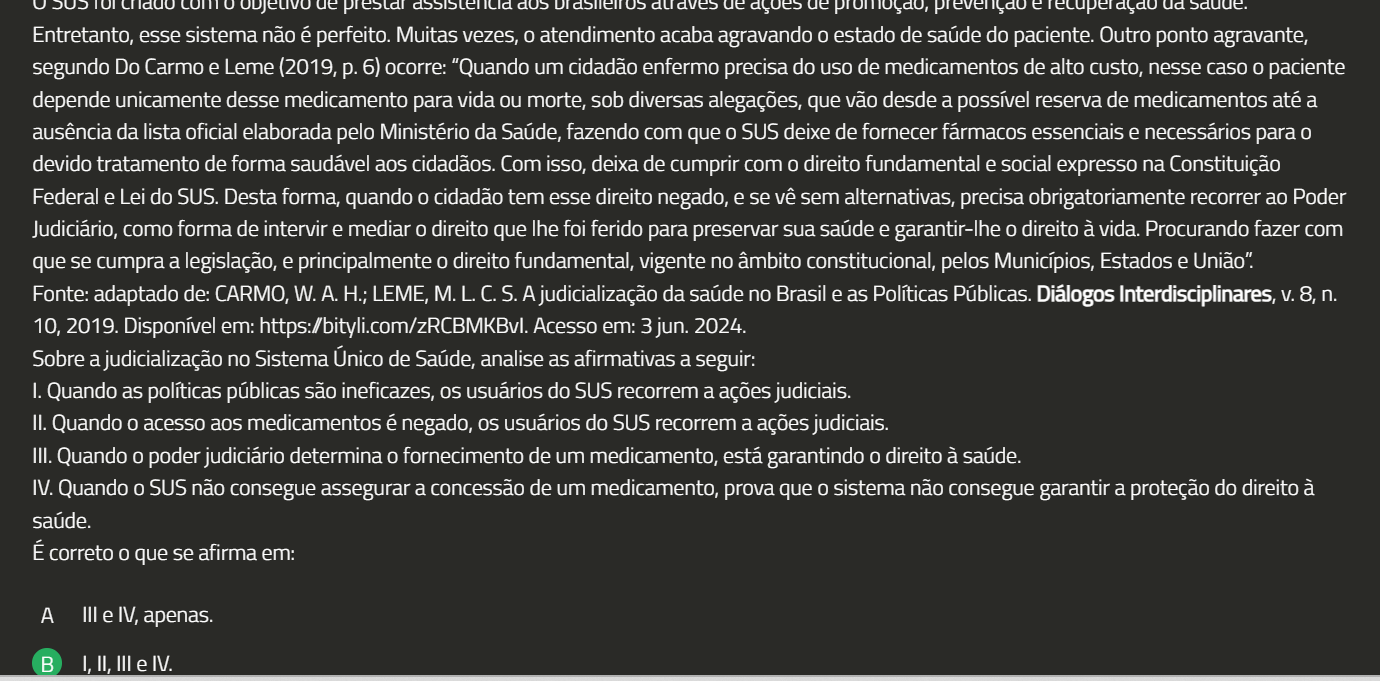 promoção, Entretanto, esse sistema não é perfeito. Muitas vezes, 0 atendimento acaba agravando 0 estado de saúde do paciente. Outro ponto agravante, segundo Do Carmo e Leme (2019, 6) ocorre: "Quando um cidadão enfermo precisa do uso de medicamentos de alto custo, nesse caso 0 paciente depende unicamente desse medicamento para vida ou morte, sob diversas alegações, que vão desde a possível reserva de medicamentos até a ausência da lista oficial elaborada pelo Ministério da Saúde, fazendo com que 0 SUS deixe de fornecer fármacos essenciais e necessários para 0 devido tratamento de forma saudável aos cidadãos. Com isso, deixa de cumprir com 0 direito fundamental e social expresso na Constituição Federal e Lei do SUS. Desta forma, quando 0 cidadão tem esse direito negado, e se vê sem alternativas, precisa obrigatoriamente recorrer ao Poder Judiciário, como forma de intervir e mediar 0 direito que lhe foi ferido para preservar sua saúde e garantir-lhe 0 direito à vida. Procurando fazer com que se cumpra a legislação, e principalmente 0 direito fundamental, vigente no âmbito constitucional, pelos Municípios, Estados e União". Fonte: adaptado de: CARMO, W.A. H.; LEME, M. L. C.S. A judicialização da saúde no Brasil e as Políticas Públicas. Diálogos Interdisciplinares, V. 8, n. 10, 2019. Disponível em: Acesso em: 3 jun. 2024. Sobre a judicialização no Sistema Único de Saúde, analise as afirmativas a seguir: I. Quando as políticas públicas são ineficazes, usuários do SUS recorrem a ações judiciais. II. Quando 0 acesso aos medicamentos é negado, usuários do SUS recorrem a ações judiciais. III. Quando 0 poder judiciário determina 0 fornecimento de um medicamento, está garantindo 0 direito à saúde. IV. Quando 0 SUS não consegue assegurar a concessão de um medicamento, prova que 0 sistema não consegue garantir a proteção do direito à saúde. É correto 0 que se afirma em: A III e IV, apenas. I, II, III e IV.