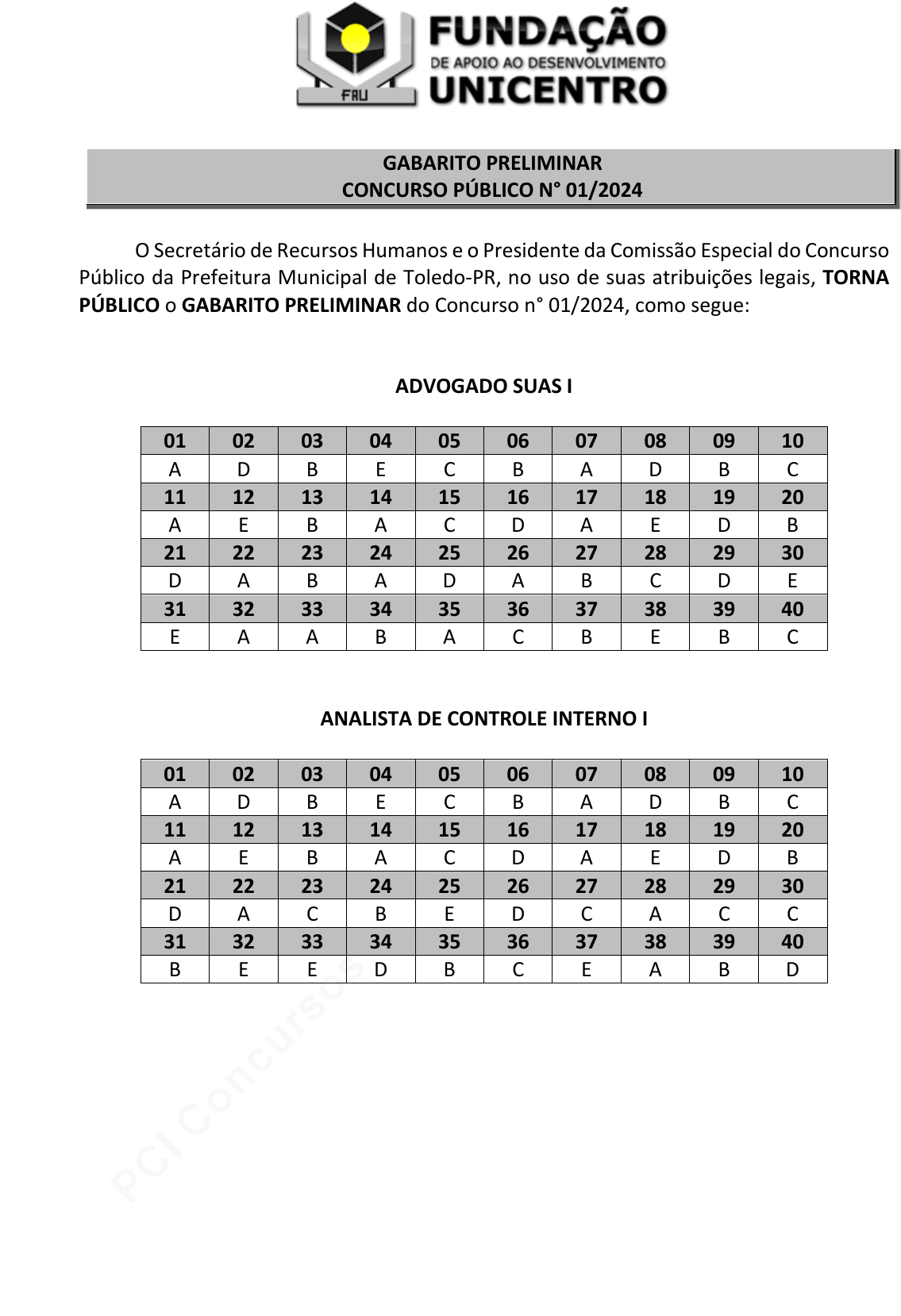 pcimarkpci MjgwNDowMzBjOjFlNjU6ZTAwMDoyNWJlOjJkNjc6ZjZmYzpjZDgw:TW9uLCAyNyBPY3QgMjAyNSAyMTowODo0MiAtMDMwMA== www.pciconcursos.com.br GABARITO PRELIMINAR CONCURSO PÚBLICO N° 01/2024 O Secretário de Recursos Humanos e o Presidente da Comissão Especial do Concurso Público da Prefeitura Municipal de Toledo-PR, no uso de suas atribuições legais, TORNA PÚBLICO o GABARITO PRELIMINAR do Concurso n° 01/2024, como segue: ADVOGADO SUAS I 01 02 03 04 05 06 07 08 09 10 A D B E C B A D B C 11 12 13 14 15 16 17 18 19 20 A E B A C D A E D B 21 22 23 24 25 26 27 28 29 30 D A B A D A B C D E 31 32 33 34 35 36 37 38 39 40 E A A B A C B E B C ANALISTA DE CONTROLE INTERNO I 01 02 03 04 05 06 07 08 09 10 A D B E C B A D B C 11 12 13 14 15 16 17 18 19 20 A E B A C D A E D B 21 22 23 24 25 26 27 28 29 30 D A C B E D C A C C 31 32 33 34 35 36 37 38 39 40 B E E D B C E A B D pcimarkpci MjgwNDowMzBjOjFlNjU6ZTAwMDoyNWJlOjJkNjc6ZjZmYzpjZDgw:TW9uLCAyNyBPY3QgMjAyNSAyMTowODo0MiAtMDMwMA== www.pciconcursos.com.br ANALISTA EM TECNOLOGIA DA INFORMAÇÃO I 01 02 03 04 05 06 07 08 09 10 A D B E C B A D B C 11 12 13 14 15 16 17 18 19 20 A E B A C D A E D B 21 22 23 24 25 26 27 28 29 30 C A B C D C A A D E 31 32 33 34 35 36 37 38 39 40 B C B A E A A B B D ARQUITETO I 01 02 03 04 05 06 07 08 09 10 A D B E C B A D B C 11 12 13 14 15 16 17 18 19 20 A E B A C D A E D B 21 22 23 24 25 26 27 28 29 30 C B B A A A C B B C 31 32 33 34 35 36 37 38 39 40 E B D B C A A D E D ENFERMEIRO I 01 02 03 04 05 06 07 08 09 10 A D B E C B A D B C 11 12 13 14 15 16 17 18 19 20 A E B A C D A E D B 21 22 23 24 25 26 27 28 29 30 C D A D A D B E C C 31 32 33 34 35 36 37 38 39 40 A B D E B A C D A D pcimarkpci MjgwNDowMzBjOjFlNjU6ZTAwMDoyNWJlOjJkNjc6ZjZmYzpjZDgw:TW9uLCAyNyBPY3QgMjAyNSAyMTowODo0MiAtMDMwMA== www.pciconcursos.com.br ENFERMEIRO T8 - ESF I 01 02 03 04 05 06 07 08 09 10 A D B E C B A D B C 11 12 13 14 15 16 17 18 19 20 A E B A C D A E D B 21 22 23 24 25 26 27 28 29 30 C A B D A E C B C B 31 32 33 34 35 36 37 38 39 40 A C D A A D C A E A ENGENHEIRO CIVIL I 01 02 03 04 05 06 07 08 09 10 A D B E C B A D B C 11 12 13 14 15 16 17 18 19 20 A E B A C D A E D B 21 22 23 24 25 26 27 28 29 30 C D D C C B B B A C 31 32 33 34 35 36 37 38 39 40 D B C E C E C B C B FISIOTERAPEUTA I 01 02 03 04 05 06 07 08 09 10 A D B E C B A D B C 11 12 13 14 15 16 17 18 19 20 A E B A C D A E D B 21 22 23 24 25 26 27 28 29 30 B D B E C E C A B A 31 32 33 34 35 36 37 38 39 40 D B C E A D B C A B pcimarkpci MjgwNDowMzBjOjFlNjU6ZTAwMDoyNWJlOjJkNjc6ZjZmYzpjZDgw:TW9uLCAyNyBPY3QgMjAyNSAyMTowODo0MiAtMDMwMA== www.pciconcursos.com.br JORNALISTA I 01 02 03 04 05 06 07 08 09 10 A D B E C B A D B C 11 12 13 14 15 16 17 18 19 20 A E B A C D A E D B 21 22 23 24 25 26 27 28 29 30 C D E D B A B E B C 31 32 33 34 35 36 37 38 39 40 A D E A D B E C C A MÉDICO T4 - DERMATOLOGISTA 01 02 03 04 05 06 07 08 09 10 A D B E C B A D B C 11 12 13 14 15 16 17 18 19 20 A E B A C D A E D B 21 22 23 24 25 26 27 28 29 30 A D E B D A C E B C 31 32 33 34 35 36 37 38 39 40 D A B E D C E B C A MÉDICO T4 - ORTOPEDISTA 01 02 03 04 05 06 07 08 09 10 A D B E C B A D B C 11 12 13 14 15 16 17 18 19 20 A E B A C D A E D B 21 22 23 24 25 26 27 28 29 30 D C A B D E A B A A 31 32 33 34 35 36 37 38 39 40 B E A B B A B D D B pcimarkpci MjgwNDowMzBjOjFlNjU6ZTAwMDoyNWJlOjJkNjc6ZjZmYzpjZDgw:TW9uLCAyNyBPY3QgMjAyNSAyMTowODo0MiAtMDMwMA== www.pciconcursos.com.br MÉDICO T4 - OTORRINOLARINGOLOGISTA 01 02 03 04 05 06 07 08 09 10 A D B E C B A D B C 11 12 13 14 15 16 17 18 19 20 A E B A C D A E D B 21 22 23 24 25 26 27 28 29 30 A B C C B B B A B C 31 32 33 34 35 36 37 38 39 40 B C B C C D A B A A MÉDICO T4 - ULTRASSONOGRAFISTA 01 02 03 04 05 06 07 08 09 10 A D B E C B A D B C 11 12 13 14 15 16 17 18 19 20 A E B A C D A E D B 21 22 23 24 25 26 27 28 29 30 B C B E A E D B A E 31 32 33 34 35 36 37 38 39 40 D C A E E C E C C D MÉDICO T4 - UROLOGISTA 01 02 03 04 05 06 07 08 09 10 A D B E C B A D B C 11 12 13 14 15 16 17 18 19 20 A E B A C D A E D B 21 22 23 24 25 26 27 28 29 30 B E C D A C E C B A 31 32 33 34 35 36 37 38 39 40 C C B D B B D E A D pcimarkpci MjgwNDowMzBjOjFlNjU6ZTAwMDoyNWJlOjJkNjc6ZjZmYzpjZDgw:TW9uLCAyNyBPY3QgMjAyNSAyMTowODo0MiAtMDMwMA== www.pciconcursos.com.br MÉDICO T4 I - CIRURGIÃO GERAL 01 02 03 04 05 06 07 08 09 10 A D B E C B A D B C 11 12 13 14 15 16 17 18 19 20 A E B A C D A E D B 21 22 23 24 25 26 27 28 29 30 D C A B A C E A B A 31 32 33 34 35 36 37 38 39 40 C D B E A C D B E A MUSEÓLOGO I 01 02 03 04 05 06 07 08 09 10 A D B E C B A D B C 11 12 13 14 15 16 17 18 19 20 A E B A C D A E D B 21 22 23 24 25 26 27 28 29 30 B E B B D B C B E A 31 32 33 34 35 36 37 38 39 40 B C B C C C A A B D ODONTÓLOGO 01 02 03 04 05 06 07 08 09 10 A D B E C B A D B C 11 12 13 14 15 16 17 18 19 20 A E B A C D A E D B 21 22 23 24 25 26 27 28 29 30 A B B D E D C A E C 31 32 33 34 35 36 37 38 39 40 A E A C B D C A C D pcimarkpci MjgwNDowMzBjOjFlNjU6ZTAwMDoyNWJlOjJkNjc6ZjZmYzpjZDgw:TW9uLCAyNyBPY3QgMjAyNSAyMTowODo0MiAtMDMwMA== www.pciconcursos.com.br PEDAGOGO I 01 02 03 04 05 06 07 08 09 10 A D B E C B A D B C 11 12 13 14 15 16 17 18 19 20 A E B A C D A E D B 21 22 23 24 25 26 27 28 29 30 B A C E C B D B A C 31 32 33 34 35 36 37 38 39 40 B D B A C D B E D D PROCURADOR MUNICIPAL T30 I 01 02 03 04 05 06 07 08 09 10 A D B E C B A D B C 11 12 13 14 15 16 17 18 19 20 A E B A C D A E D B 21 22 23 24 25 26 27 28 29 30 D E B B D C A D C D 31 32 33 34 35 36 37 38 39 40 E E A B A C B C C E PROFESSOR DE EDU. FÍSICA 01 02 03 04 05 06 07 08 09 10 A D B E C B A D B C 11 12 13 14 15 16 17 18 19 20 A E B A C D A E D B 21 22 23 24 25 26 27 28 29 30 B C A E D C E D B E 31 32 33 34 35 36 37 38 39 40 E A C D C A E E B D pcimarkpci MjgwNDowMzBjOjFlNjU6ZTAwMDoyNWJlOjJkNjc6ZjZmYzpjZDgw:TW9uLCAyNyBPY3QgMjAyNSAyMTowODo0MiAtMDMwMA== www.pciconcursos.com.br PROFESSOR DE EDU. INF. T40 01 02 03 04 05 06 07 08 09 10 A D B E C B A D B C 11 12 13 14 15 16 17 18 19 20 A E B A C D A E D B 21 22 23 24 25 26 27 28 29 30 A E C D B C B A E A 31 32 33 34 35 36 