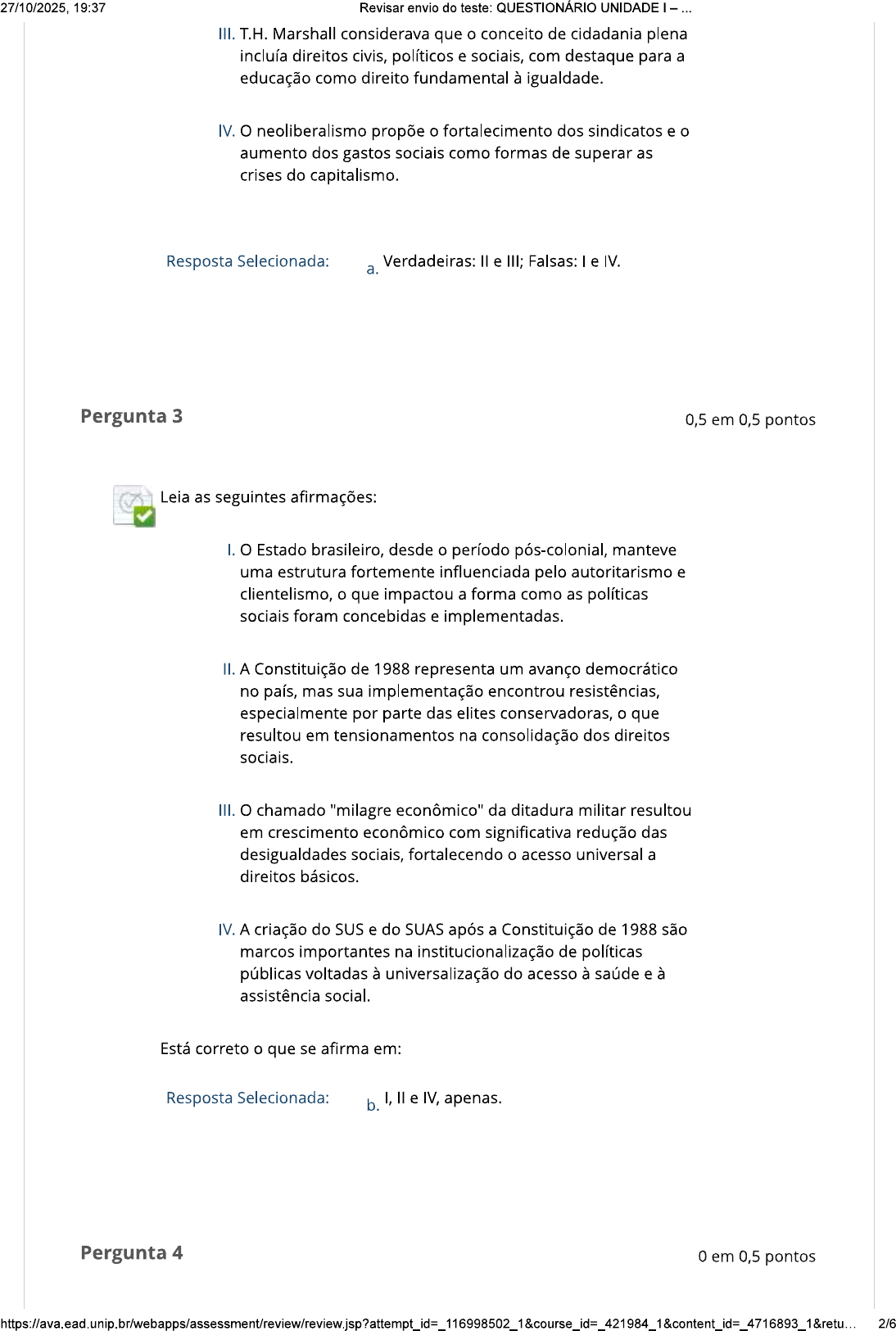 27/10/2025, 19:37 Revisar envio do teste: QUESTIONÁRIO UNIDADE III. Marshall considerava que conceito de cidadania plena incluía direitos civis, políticos e sociais, com destaque para a educação como direito fundamental à igualdade. IV. neoliberalismo propõe fortalecimento dos sindicatos e o aumento dos gastos sociais como formas de superar as crises do capitalismo. Resposta Selecionada: Verdadeiras: e III; Falsas: I e IV. a. Pergunta 3 0,5 em 0,5 pontos Leia as seguintes afirmações: I. O Estado brasileiro, desde o período pós-colonial, manteve uma estrutura fortemente influenciada pelo autoritarismo e clientelismo, o que impactou a forma como as políticas sociais foram concebidas e implementadas. II. A Constituição de 1988 representa um avanço democrático no país, mas sua implementação encontrou resistências, especialmente por parte das elites conservadoras, o que resultou em tensionamentos na consolidação dos direitos sociais. III. chamado "milagre econômico" da ditadura militar resultou em crescimento econômico com significativa redução das desigualdades sociais, fortalecendo acesso universal a direitos básicos. IV. A criação do SUS e do SUAS após a Constituição de 1988 são marcos importantes na institucionalização de políticas públicas voltadas à universalização do acesso à saúde e à assistência social. Está correto o que se afirma em: Resposta Selecionada: b. I, e IV, apenas. Pergunta 4 0 em 0,5 pontos 2/627/10/2025, 19:37 Revisar envio do teste: QUESTIONÁRIO UNIDADE I Leia trecho abaixo: Evidentemente, essa individualidade não é qualquer uma, é aquela que se adequa aos limites do mercado. Tanto é assim, que outro aspecto presente nas políticas, as quais nesse período apresentam-se de forma ainda difusa, refere-se à obrigatoriedade do trabalho, que é imposto sob a alegação moral de que a vadiagem é um mal a ser combatido. GONÇALVES, M. G. M. Psicologia, subjetividade e políticas públicas. São Paulo, Cortez, 2010, p. 68-69. Considerando contexto acima, avalie as seguintes asserções e a relação proposta entre elas. I. A Psicologia crítica, ao considerar a dimensão subjetiva da experiência humana, contribui para desenvolvimento de políticas públicas mais sensíveis às desigualdades sociais e históricas, como o racismo estrutural herdado da escravidão. PORQUE II. No contexto da sociedade liberal brasileira no século XXI, as políticas sociais têm se fortalecido continuamente como instrumentos de promoção da equidade, com base na universalização dos direitos e no combate à lógica de mercado. A respeito dessas asserções, assinale a opção correta. Resposta Selecionada: e. As asserções I e são proposições falsas. Pergunta 5 0,5 em 0,5 pontos Sobre a trajetória histórica e os princípios organizativos do Sistema Único de Saúde (SUS) no Brasil, assinale a alternativa correta: Resposta d. Selecionada: A Constituição Federal de 1988 reconheceu a saúde como direito de todos e dever do Estado, incorporando princípios como a universalidade, a gratuidade, a descentralização e a participação popular. 3/6