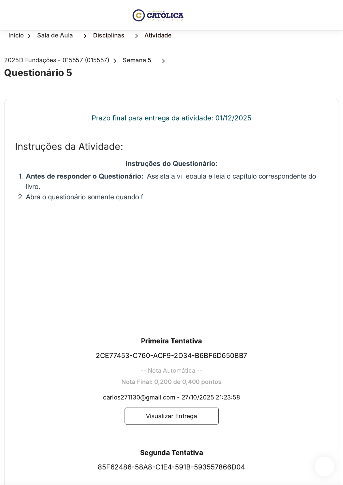 Início 〉 Sala de Aula 〉 Disciplinas 〉 Atividade 2025D Fundações - 015557 (015557) 〉 Semana 5 〉 Questionário 5 Instruções da Atividade: Prazo final para entrega da atividade: 01/12/2025 Instruções do Questionário: 1. Antes de responder o Questionário: Assista a videoaula e leia o capítulo correspondente do livro. 2. Abra o questionário somente quando for responder; 3. Ao abrir o questionário você terá 4 questões para responder; 4. Leia com calma todas as questões e entenda o que pede a questão: se pede a incorreta, a correta e qual o tema da questão; 5. Lembre-se de Clicar no botão "Enviar"; 6. Você tem duas tentativas para fazer o teste, a segunda tentativa é opcional; 7. Lembre-se que as respostas mudam de lugar em cada tentativa; 8. As respostas corretas só aparecem após o envio da segunda tentativa; 9. O sistema considera a maior nota entre as duas tentativas; 10. Lembre-se que na segunda tentativa zera TODAS as questões, inclusive as que você acertou na primeira tentativa. Bons estudos! Primeira Tentativa 2CE77453-C760-ACF9-2D34-B6BF6D650BB7 -- Nota Automática -- Nota Final: 0,200 de 0,400 pontos carlos271130@gmail.com - 27/10/2025 21:23:58 Visualizar Entrega Segunda Tentativa 85F62486-58A8-C1E4-591B-593557866D04 https://ava.uca.edu.br/aluno/sala-de-aula/disciplina/modulo/atividade/587667 https://ava.uca.edu.br/aluno/sala-de-aula/disciplina/modulo/atividade/587667 https://ava.uca.edu.br/aluno/sala-de-aula/disciplina https://ava.uca.edu.br/aluno/sala-de-aula/disciplina/modulo/atividade/:id/:nome https://api.whatsapp.com/send?phone=5514988263000&text=Suporte javascript:void(0); -- Nota Automática -- Nota Final: 0,400 de 0,400 pontos carlos271130@gmail.com - 27/10/2025 21:32:34 Visualizar Entrega Perguntas Pergunta 1. Pergunta 2. Pergunta 3. Pergunta 4. pontos: 0,100Pergunta 1. Para pilares de divisa, deve-se: Múltipla Escolha: A. Construir a estaca ou grupo de estacas concêntricas ao pilar. B. Considerar a carga do pilar de divisa como o dobro do valor real. C. Considerar a carga do pilar de divisa como a carga real aplicada na estaca. D. Considerar a carga do pilar de divisa como metade do valor real. E. Construir uma viga alavanca ou de equilíbrio. https://api.whatsapp.com/send?phone=5514988263000&text=Suporte javascript:void(0); pontos: 0,100Pergunta 2. Capacidade de carga ou capacidade de suporte de um solo indica: Múltipla Escolha: A. A resistência do solo B. A forma de dimensionamento da fundação. C. A forma de execução de uma estaca escavada. D. A resistência do elemento estrutural. E. O critério para adoção do tipo de estaca a ser empregada. Avaliação Nota Avaliada: 0,100 de 0,100 Avaliação Nota Avaliada: 0,100 de 0,100 https://api.whatsapp.com/send?phone=5514988263000&text=Suporte javascript:void(0); pontos: 0,100Pergunta 3. Uma vez escolhido o tipo de estaca, o número de estacas é calculado por: 𝑛 = 1, 1 . 𝑃𝑝𝑖𝑙𝑎𝑟 𝑃 Em que Ppilar é a carga no pilar e P é: Múltipla Escolha: A. Tensão geostática do solo. B. Compressibilidade do solo. C. Carga admissível do solo. D. Capacidade de carga do solo. E. Potencial de deformabilidade do solo. Avaliação Nota Avaliada: 0,100 de 0,100 https://api.whatsapp.com/send?phone=5514988263000&text=Suporte javascript:void(0); pontos: 0,100Pergunta 4. Pelo método de Aoki-Velloso são apresentadas as seguintes equações: Rp = rp . Ap rp = K . Np F1 Rl = U . ∑ (rl . ∆l) rl = α. K . Nl F2 Os parâmetros F1 e F2 correspondem a: Múltipla Escolha: A. Compressibilidade do solo. B. Tipo de estaca. C. Variação do nível de água. D. Tipo de solo E. Comprimento do fuste. Avaliação Nota Avaliada: 0,100 de 0,100 https://api.whatsapp.com/send?phone=5514988263000&text=Suporte javascript:void(0); Fechar Visualização 〈 Voltar aos Módulos 〈 Anterior Próxima 〉 Faculdade Católica Paulista Contato Endereço Avenida Cristo Rei, 305 – Banzato Marília, São Paulo – CEP: 17515-200 Horário De Funcionamento Segunda a quinta, das 8:00 às 20:00 horas As sextas, das 8:00 às 18:00 horas. WhatsApp : (14) 9.8826-3000 Telefone Sede: (14) 3422-1815 Central de Atendimento: 0800 664 5583 E-mail : secretaria@uca.edu.br https://www.instagram.com/faculdadecatolicaead/ https://facebook.com/ucaead https://www.youtube.com/@UcaEduBr https://www.linkedin.com/school/faculdade-catolica-paulista/?originalSubdomain=br https://maps.app.goo.gl/wWsD9QX5fVPa3h6PA https://api.whatsapp.com/send?phone=5514988263000&text=Suporte tel:14-3422-1815 tel:14-3422-1815 tel:0800-664-5583 tel:0800-664-5583 mailto:secretaria@uca.edu.br https://api.whatsapp.com/send?phone=5514988263000&text=Suporte javascript:void(0);
