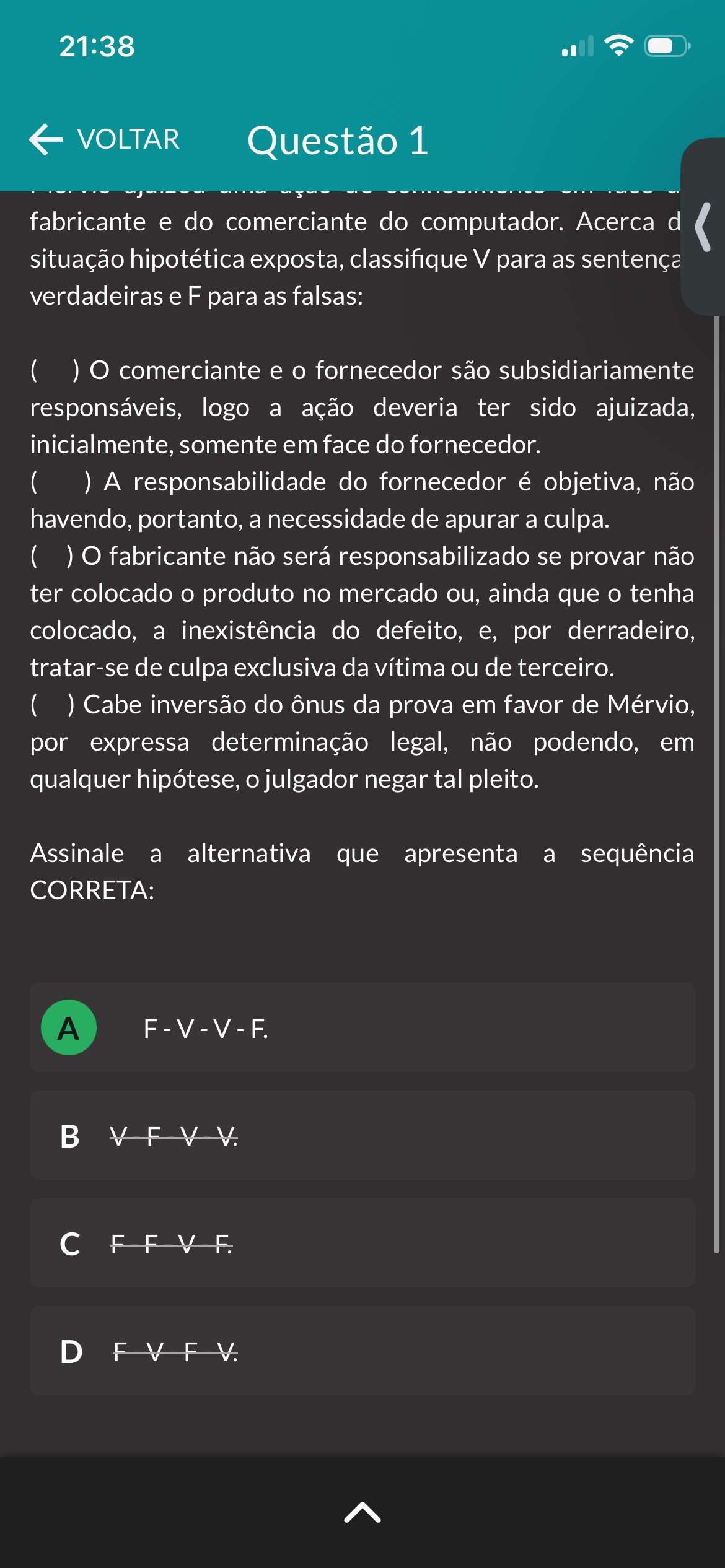 21:38 VOLTAR Questão 1 fabricante e do comerciante do computador. Acerca d situação hipotética exposta, classifique V para as sentença verdadeiras e F para as falsas: ( ) comerciante e fornecedor são subsidiariamente responsáveis, logo a ação deveria ter sido ajuizada, inicialmente, somente em face do fornecedor. ( ) A responsabilidade do fornecedor é objetiva, não havendo, portanto, a necessidade de apurar a culpa. fabricante não será responsabilizado se provar não ter colocado produto no mercado ou, ainda que tenha colocado, a inexistência do defeito, e, por derradeiro, tratar-se de culpa exclusiva da vítima ou de terceiro. ( ) Cabe inversão do ônus da prova em favor de Mérvio, por expressa determinação legal, não podendo, em qualquer hipótese, julgador negar tal pleito. Assinale a alternativa que apresenta a sequência CORRETA: A F-V-V-F. c D FVFV.