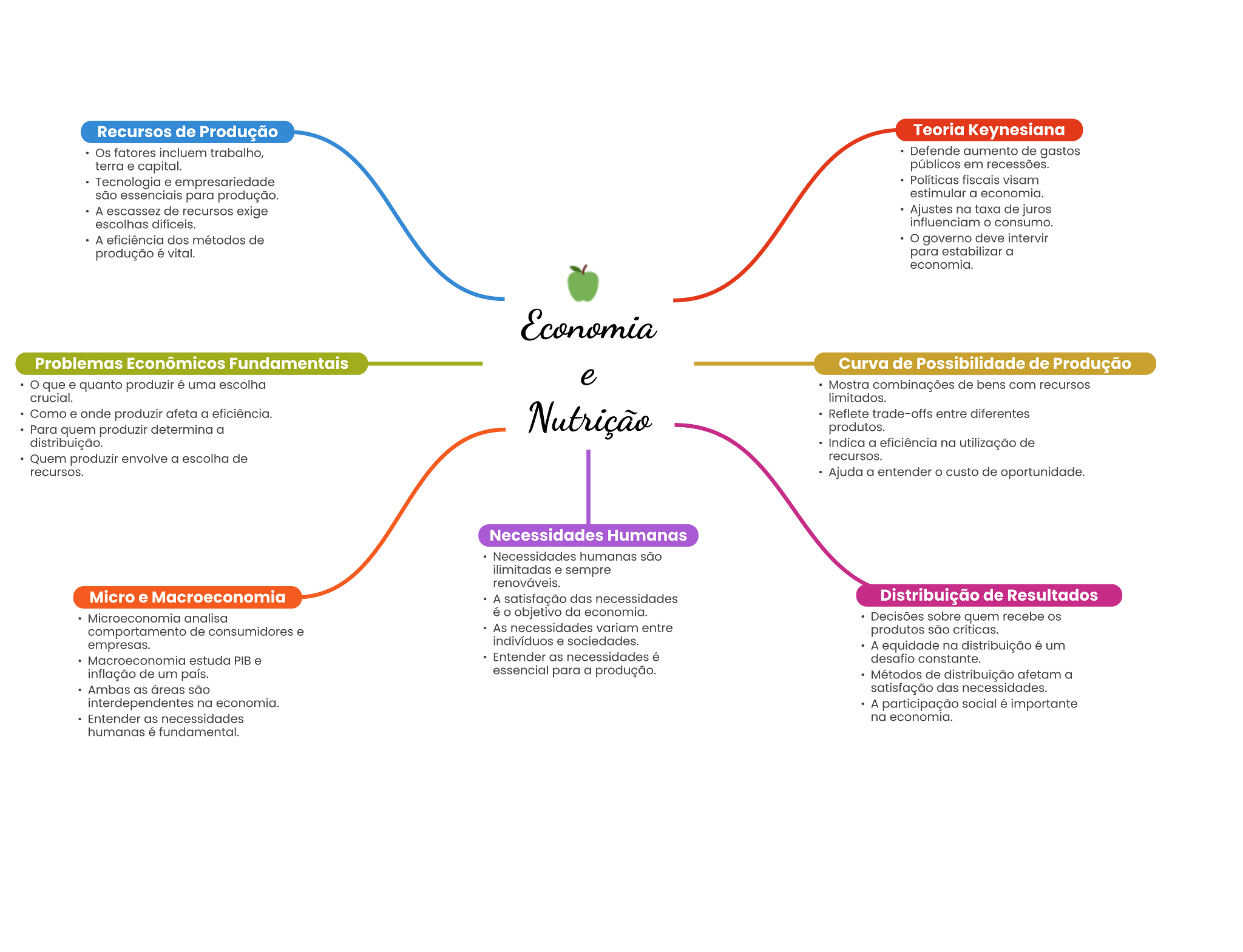 Recursos de Produção Teoria Keynesiana fatores trabalho, de gastos terra . capital. públicos em recessões. Politicas visam são para produção. estimular a economia. A de recursos exige Ajustes na de juros escolhas consumo. A eficiência dos métodos de governo deve produção vital. para a economia. Problemas Econômicos Fundamentais Curva de Possibilidade de Produção que quanto produzir é uma escolha Mostra combinações de bens com recursos limitados. Como onde produzir afeta a eficiência. Reflete trade-offs entre diferentes Para quem produzir determina a produtos. distribuição. Indica a eficiência na utilização de Quem produzir envolve a escolha de recursos. recursos. Ajuda a entender custo de oportunidade. Necessidades Humanas Necessidades humanas são e sempre Micro e Macroeconomia A satisfação necessidades Distribuição de Resultados é o da economia. Decisões sobre quem recebe comportamento de consumidores As necessidades variam entre produtos são empresas. individuos sociedades. A equidade na distribuição é um Macrosconomia estuda PIB Entender as necessidades constante. inflação de um país. para a produção. Métodos de distribuição afetam a Ambas as são das necessidades. na A participação social importante Entender as necessidades na humanas fundamental.