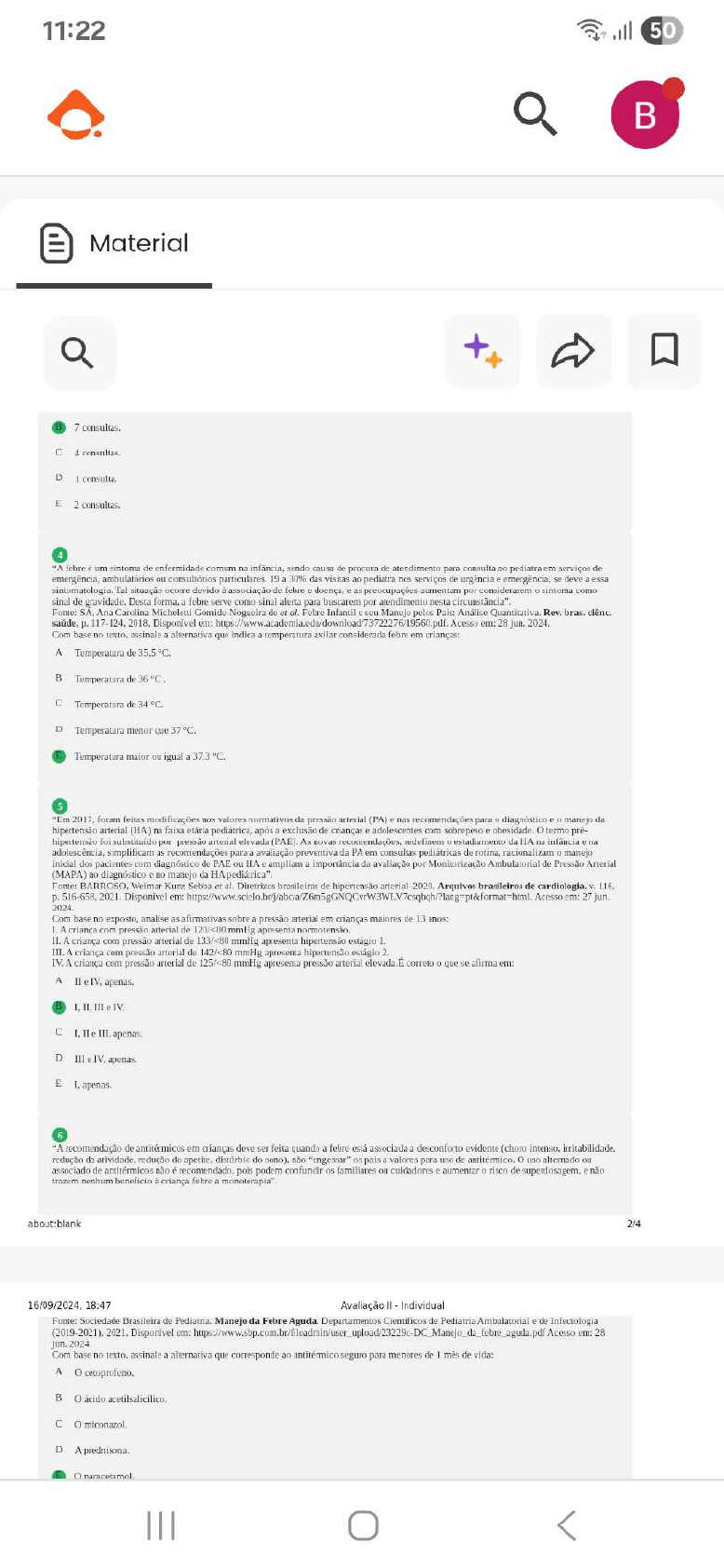 11:22 50 B Material 7 consultas. C D E 4 "A febre um sintoma de enfermidade comum na infância, sendo causa de procura de atendimento para consulta ao pediatra em serviços de emergência, ambulatórios ou consultórios particulares. 19 30% das visitas ao pediatra nos serviços de urgência e se deve a essa Tal situação devido à associação de febre doença, e as preocupações aumentam por considerarem sintoma como sinal de gravidade. Desta forma. a febre serve como sinal alerta para buscarem por atendimento nesta circunstância". Fonte: Ana Carolina Gomide-Nogueira de et al. Febre Infantil seu Manejo pelos Pais: Análise Quantitativa. Rev. bras. saúde, p. 2018. Disponível pdf. Acesso em: 28 jun. 2024. Com base no assinale a alternativa que a temperatura axilar considerada febre em crianças: A Temperatura de 35.5 Temperatura de C Temperatura de D Temperatura menor que 37 °C. Temperatura maior ou igual 5 "Em foram feitas modificações nos valores normativos da pressão arterial (PA) nas recomendações para diagnóstico e 0 manejo da hipertensão arterial (HA) na faixa etária após a exclusão de crianças adolescentes com sobrepeso termo hipertensão foi por pressão arterial elevada (PAE). As novas recomendações, redefinem estadiamento da na infância e na simplificam as recomendações para a avaliação preventiva da PA em consultas pediátricas de rotina, racionalizam manejo inicial dos pacientes com diagnóstico de PAE ou HA e ampliam a importância da avaliação por Monitorização Ambulatorial de Pressão Arterial (MAPA) no diagnóstico e no manejo da HA Fonte: Kunz Sebba et Diretrizes brasileiras de hipertensão Arquivos brasileiros de V. 116. Disponível em: em: 27 jun. 2024 Com base no exposto, analise as afirmativas sobre pressão arterial em crianças maiores de 13 anos: LA criança com pressão arterial de 120/09:04 58 B Material 7 "As consequências mais graves das doenças diarreicas seja qual for sua são a desidratação e a desnutrição, com problemas no desenvolvimento pôndero-estatural além de aumentor as infecções sistêmicas, tempo de hospitalização A desidratação è uma situação grave e demanda tratamento imediato, por isso fundamental que 05 profissionais envolvidos conheçam sinais de desidratação, ea classificação do tratamento em planos B e que segundo manual nos casos em que 0 paciente tem mas ainda não tem desidratação classificado como plano Fonte: B. L. Mortalidade infantil: Determinantes e agravos по Brasil. Faculdades Pequeno Principe, 2022. Disponível em: MORTALIDADE INFANTIL no Acesso em: jul. Com base nas informações avalie as asserções seguir e relação proposta entre elas: LO Plano no protocolo do AIDPI recomenda tratamento com soro de reidratação oral em casos de diarreia e PORQUE Uma criança com pode apresentando sinais como olhos fundos. dificuldade em beber líquidos pele menos A respeito dessas asserções, assinale a opção correta: A uma proposição verdadeira a II é uma proposição falsa. A asserção uma proposição falsa uma proposição verdadeira C As asserções são D As asserções II são mas a não é uma justificativa da As asserções são e a uma justificativa correta da 8 A triagem neonatal com do pezinho" monitora e acompanha crianças com casos positivos durante 0 A coleta é realizada em pontos da Atenção Básica em Saúde e, em alguns estados, em maternidades, casas de parto ou comunidades Independentemente do coleta deve ser documentada no sistema de A organização do fluxo de coleta exige cuidados para garantir resultados incluindo a seleção treinamento do profissional responsável e 0 transporte adequado das amostras ao laboratório para Fonte: adaptado de: BRASIL Triagem neonatal biológica: manual Ministério da Saúde, 2016. Disponível em: Acesso em: 21 jun. Com base no analise as afirmativas sobre teste do pezinho: LA coleta do sangue é realizada nas laterais da região plantar do calcanhar com 0 uso de lancetas teste realizado entre terceiro quinto dia de vida para identificar doenças genéticas, metabolicas e III. profissional deve as usar luvas, garantir assepsiar 0 calcanhar com álcool massagear para ativar a circulação esperar álcool E correto que se afirma em: A B apenas. D about:blank 3/4 22:25 Avaliação Individual III. 9 "A consulta de puericultura é uma ferramenta potente para a do cuidado pois é uma atividade dinâmica de baixa que oportuniza a implementação da do crescimento e do desenvolvimento Nesse ressalta-se na são realizadas ações de proteção, prevenção de agravos promoção da saúde da criança na Estratégia Saúde da Familia pelo médico pelo Fonte: VIEIRA, Daniele de Souza et al. A prática do enfermeiro na consulta de puericultura na estratégia saúde da Texto & Contexto- Enfermagem, n. p. e4890017, 2018. Disponivel em: em: 25 2024. Com base no assinale a alternativa que corresponde quantidade de consultas preconizadas no primeiro ano de vida da criança segundo Ministério da saúde: A consulta 7 D E09:04 58 B Material E correto que se afirma em: A II III. apenas. B apenas. apenas. III. apenas. about:blank 3/4 16/09/2024 22:25 Avaliação Individual III. "A consulta de puericultura é uma ferramenta potente para a integralidade do cuidado infantil, pois uma atividade dinâmica e de baixa complexidade, que oportuniza a implementação da vigilância do crescimento e do desenvolvimento Nesse ressalta-se que, na são realizadas ações de proteção, prevenção de agravos e promoção da saúde da criança na Estratégia Saúde da Família pelo médico e pelo Fonte: Daniele de Souza et al. A prática do enfermeiro na consulta de puericultura na estratégia saúde da Texto & Contexto- n. 4. p. 2018. Disponível em: Acesso em: 25 jun. 2024. Com base no texto, assinale a alternativa que corresponde à quantidade de consultas preconizadas no primeiro ano de vida da criança segundo Ministério da saúde: A 7 consultas. D E consu