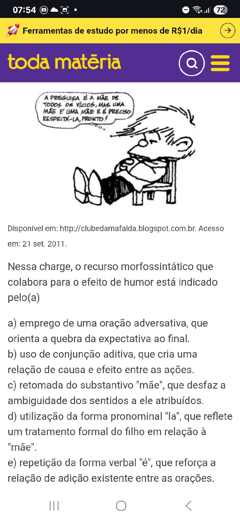 07:54 72 Ferramentas de estudo por menos de R$1/dia toda matēria A PREGUIÇA É A MÃE DE TODOS os VÍCIOS, MAS UMA MÃE UMA MÃE EÉ PRECISO PRONTO Disponível em: Acesso em: 21 set. 2011. Nessa charge, o recurso morfossintático que colabora para o efeito de humor está indicado pelo(a) a) emprego de uma oração adversativa, que orienta a quebra da expectativa ao final. b) uso de conjunção aditiva, que cria uma relação de causa e efeito entre as ações. c) retomada do substantivo "mãe", que desfaz a ambiguidade dos sentidos a ele atribuídos. d) utilização da forma pronominal "la", que reflete um tratamento formal do filho em relação à "mãe". e) repetição da forma verbal "é", que reforça a relação de adição existente entre as orações.07:54 72 Ferramentas de estudo por menos de R$1/dia toda matēria Tecnologias 5. (Enem/2013) Para a identificação de um rapaz vítima de acidente, fragmentos de tecidos foram retirados e submetidos à extração de DNA nuclear, para comparação com DNA disponível dos possíveis familiares (pai, avô materno, avó materna, filho e filha). Como o teste com o DNA nuclear não foi conclusivo, os peritos optaram por usar também DNA mitocondrial, para dirimir dúvidas. Para identificar o corpo, os peritos devem verificar se há homologia entre o DNA mitocondrial do rapaz e DNA mitocondrial do(a) a) pai. b) filho. c) filha. d) avó materna. e) avô materno Ver Resposta Veja também: Biologia no Enem: os assuntos que07:55 72 Ferramentas de estudo por menos de R$1/dia toda matēria No heredograma, símbolos preenchidos representam pessoas portadoras de um tipo raro de doença genética. Os homens são representados pelos quadrados e as mulheres, pelos círculos. Qual é o padrão de herança observado para essa doença? a) Dominante autossômico, pois a doença aparece em ambos os sexos. b) Recessivo ligado ao sexo, pois não ocorre a transmissão do pai para os filhos. c) Recessivo ligado ao Y, pois a doença é transmitida dos pais heterozigotos para os filhos. d) Dominante ligado ao sexo, pois todas as filhas de homens afetados também apresentam a doença. e) Codominante autossômico, pois a doença é herdada pelos filhos de ambos os sexos, tanto do pai quanto da mãe.07:55 72 todamateria.com.br/ + 30 ... Ferramentas de estudo por menos de R$1/dia toda matēria 7. (Enem/2015) A soda cáustica pode ser usada no desentupimento de encanamentos domésticos e tem, em sua composição, o hidróxido de sódio como principal componente, além de algumas impurezas. A soda normalmente é comercializada na forma sólida, mas que apresenta aspecto "derretido" quando exposta ao ar por certo período. O fenômeno de "derretimento" decorre da a) absorção da umidade presente no ar atmosférico. b) fusão do hidróxido pela troca de calor com o ambiente. c) reação das impurezas do produto com o oxigênio do ar. d) adsorção de gases atmosféricos na superfície do sólido. e) reação do hidróxido de sódio com o gás nitrogênio presente no ar. Ver Resposta07:55 72 + 30 ... Ferramentas de estudo por menos de R$1/dia toda matēria 8. (Enem/2016) Uma pessoa é responsável pela manutenção de uma sauna úmida. Todos os dias cumpre o mesmo ritual: colhe folhas de capim- cidreira e algumas folhas de eucalipto. Em seguida, coloca as folhas na saída do vapor da sauna, aromatizando-a, conforme mostrado na figura. Parede Sauna úm Geradorde vapor Fohas Saída do vapor Qual processo de separação é responsável pela aromatização promovida? a) Filtração simples. b) Destilação simples. c) Extração por arraste. d) Sublimação fracionada. e) Decantação sólido-líquido.72 9. (Enem/2017) Fusível é um dispositivo de proteção contra sobrecorrente em circuitos. Quando a corrente que passa por esse componente elétrico é maior que sua máxima corrente nominal, o fusível queima. Dessa forma, evita que a corrente elevada danifique os aparelhos do circuito. Suponha que o circuito elétrico mostrado seja alimentado por uma fonte de tensão U e que fusível suporte uma corrente nominal de 500 mA. 30 30 Ω Ω Fusivel 009 U Qual é o máximo valor da tensão U para que o fusível não queime? a) 20 V b) 40 V c) 60 V d) 120 V e) 185 V Ver Resposta Estudar Ciências da Natureza exige mais do que