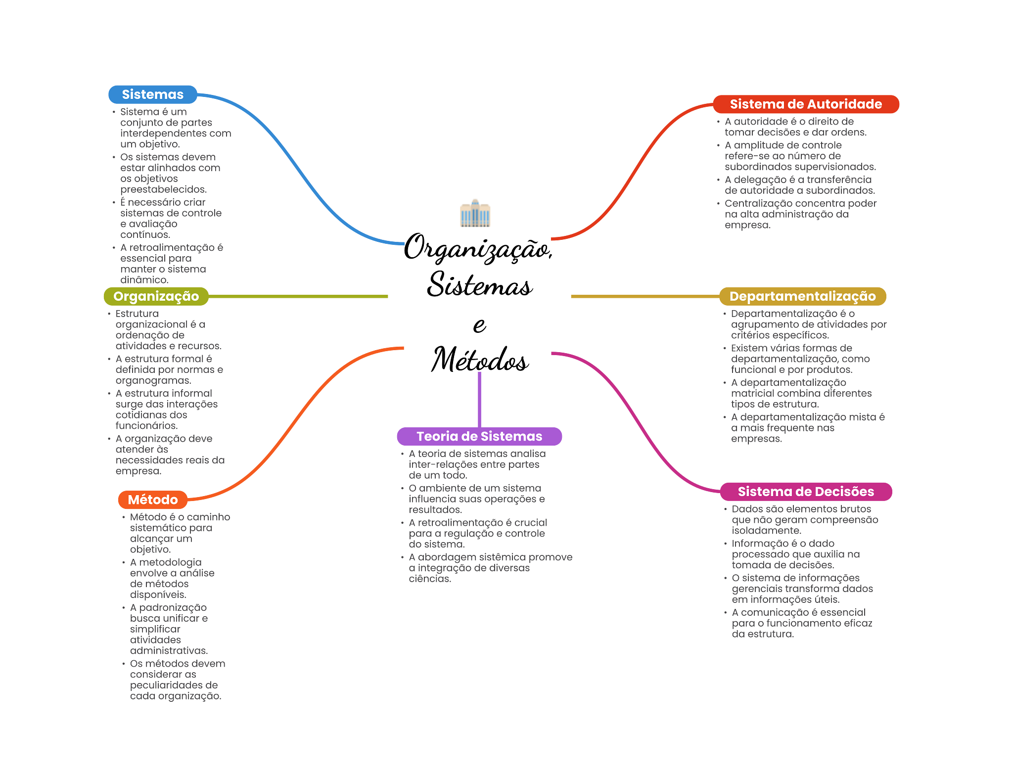 Sistemas Sistema de Autoridade um conjunto de partes A autoridade direito de com dar ordene. um objetivo. A amplitude de controle Os sistemas refere-se número de com subordinados objetivos A delegação a transferência de autoridade a subordinados. É necessário criar concentra poder sistemas de controle na alta administração da empresa. continuos. A retroalimentação é essencial para manter dinâmico. Organização Departamentalização Estrutura é organizacional a agrupamento de atividades por ordenação de critérios específicos. atividades recursos. formas de A estrutura formal é como definida por normas funcional 9 por produtos. A A estrutura informal matricial combina diferentes surge interações tipos de estrutura. cotidianas dos A mista é funcionários. a mais frequente A organização deve Teoria de Sistemas empresas. atender A teoria de sistemas necessidades da entre partes empresa. de um todo. ambiente de um Sistema de Decisões Método operações resultados. Dados são elementos brutos Método o caminho para A que não geram para a regulação controle alcançar um objetivo. do sistema. Informação dado A abordagem sistêmica promove processado que na A metodologia envolve a a de tomada de decisões. de métodos ciências. de gerencials transforma dados em informações A busca unificar e A comunicação simplificar para o funcionamento eficaz da estrutura. atividades métodos devem de cada organização.