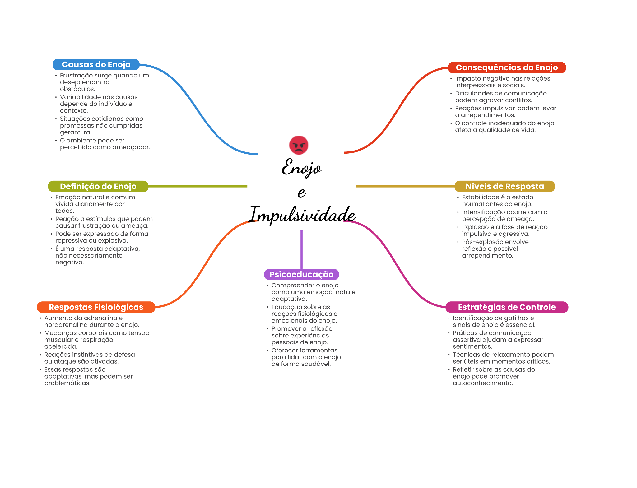 Causas do Enojo Consequências do Enojo Frustração surge quando um encontra Impacto negativo nas relações socials. nas causas de comunicação depende do podem agravar podem levar cotidianas como a arrependimentos. promessas não cumpridas controle inadequado do enojo geram afeta a qualidade de vida. ambiente pode percebido como Definição do Enojo Níveis de Resposta Emoção natural comum Estabilidade é estado vivida por normal do enojo. todos. com a Reação a que podem percepção de causar frustração ou Explosão a de Pode ser de forma agressiva. repressiva ou explosiva. envolve É uma resposta adaptativa, reflexão possível não arrependimento. negativa. Psicoeducação Compreender enojo como uma emoção adaptativa. Respostas Fisiológicas Educação sobre as Estratégias de Controle da reações emocionals do enojo. de durante enojo. Promover a reflexão de enojo essencial. como teneão sobre experiências de comunicação muscular respiração de enojo. ajudam a expressor sentimentos. Oferecer ferramentas de defesa para lidar com o enojo de relaxamento podem ou ataque são ativadas. de forma saudável. ser em momentos criticos. Essas Refletir sobre as do adaptativas, mas podem ser enojo pode promover