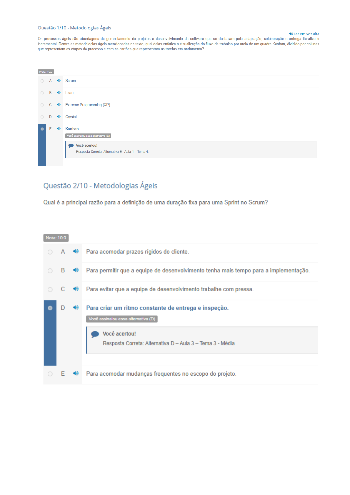 Questão 1/10 Metodologias Ágeis Ler em voz alta Os processos ágeis são abordagens de gerenciamento de projetos e desenvolvimento de software que se destacam pela adaptação, colaboração e entrega iterativa e incremental. Dentre as metodologias ágeis mencionadas no texto, qual delas enfatiza a visualização do fluxo de trabalho por meio de um quadro Kanban, dividido por colunas que representam as etapas do processo e com cartões que representam as tarefas em andamento? Nota: 10.0 A Scrum Lean C Extreme Programming (XP) D Crystal E Kanban Você assinalou essa alternativa (E) Você acertou! Resposta Correta: Alternativa E. Aula 1 Tema 4. Questão 2/10 Metodologias Ágeis Qual é a principal razão para a definição de uma duração fixa para uma Sprint no Scrum? Nota: 10.0 A Para acomodar prazos rígidos do cliente. Para permitir que a equipe de desenvolvimento tenha mais tempo para a implementação. C Para evitar que a equipe de desenvolvimento trabalhe com pressa. D Para criar um ritmo constante de entrega e inspeção. Você assinalou essa alternativa (D) Você acertou! Resposta Correta: Alternativa D Aula 3 Tema 3 - Média E Para acomodar mudanças frequentes no escopo do projeto.Questão 3/10 Metodologias Ageis Sobre 0 Scrum, assinale se as seguintes afirmações são verdadeiras (V) ou falsas (F): () Scrum é uma metodologia ágil que visa 0 desenvolvimento de software de forma iterativa e incremental, em ciclos curtos de tempo chamados Sprints. () Scrum Master é responsável por gerenciar e priorizar 0 backlog do produto. () Scrum promove a transparência, inspeção e adaptação como princípios-chave. () Durante a Sprint, a equipe de desenvolvimento realiza reuniões diárias de curta duração para compartilhar seu progresso e identificar () Scrum é uma metodologia que não enfatiza a colaboração entre membros da equipe. Nota: 10.0 A V-F-V-F-F V-F-F-V-F F-V-F-V-V D F-V-F-F-V E V-F-V-V-F Você assinalou essa alternativa (E) Você acertou! Resposta correta: Alternativa E Aula 3 - Tema 1 Média Questão 4/10 Metodologias Ágeis Assinale se as seguintes afirmações são verdadeiras (V) ou falsas (F): ()A cultura organizacional ágil enfatiza a transparência, inspeção e adaptação. ()A cultura ágil não valoriza a colaboração entre os membros da equipe. ()A cultura organizacional ágil não incentiva a experimentação e 0 aprendizado contínuo. ()A cultura ágil prioriza a entrega contínua de valor ao cliente. ()A cultura organizacional ágil não busca a melhoria contínua nas práticas de trabalho. Nota: 10.0 A V-F-F-V-F Você assinalou essa alternativa (A) Você acertou! Resposta correta: Alternativa A - Aula 1 - Tema 2 V-V-F-V-F F-F-V-V-V D F-V-F-F-VOs processos ágeis são abordagens de gerenciamento de projetos e desenvolvimento de software que ganharam destaque nas últimas décadas. Eles se destacam por sua ênfase na adaptação, colaboração e entrega incremental de produtos de software. Em contraste com métodos tradicionais de gestão de projetos, que tendem a ser mais burocráticos e rígidos, processos ágeis oferecem uma abordagem mais flexível. Esses processos buscam criar um ambiente que permita às equipes de desenvolvimento de software serem ágeis, respondendo rapidamente às mudanças nas necessidades do cliente e do mercado. Isso é alcançado através da priorização da comunicação efetiva, da colaboração contínua e do feedback regular. Os processos ágeis também incentivam a entrega de incrementos de software funcional em ciclos curtos e frequentes, permitindo que produto evolua à medida que novas funcionalidades são adicionadas. Existem várias metodologias ágeis populares, cada uma com suas próprias abordagens e práticas específicas. Entre elas, destacam-se 0 Scrum, 0 Extreme Programming (XP), 0 Kanban e 0 Lean Agile. Cada uma dessas metodologias tem seu foco particular, mas todas compartilham os princípios fundamentais do Manifesto Ágil, enfatizando valores como colaboração, flexibilidade e busca pela qualidade do software. No geral, processos ágeis transformaram a forma como 0 desenvolvimento de software é conduzido, promovendo maior adaptabilidade, eficiência e sucesso em projetos de software. Com base no texto, qual é 0 principal objetivo dos processos ágeis no desenvolvimento de software? Nota: 10.0 A Minimizar 0 retrabalho e as esperas. Seguir um plano rígido e pré-definido. Priorizar a entrega rápida e eficiente de software. Você assinalou essa alternativa (C) Você acertou! Resposta correta: Alternativa C Aula 1 Tema 4. Fácil Em um projeto Scrum, os três papéis principais desempenham funções cruciais para 0 sucesso do projeto. No entanto, esses papéis têm responsabilidades distintas. Considere 0 seguinte cenário: Uma equipe de desenvolvimento está trabalhando em um projeto de desenvolvimento de software. Scrum Master tem notado que a equipe está tendo dificuldades para entender os requisitos do Product Backlog e está tendo dificuldades em auto-organizar-se eficazmente para atender às metas da Sprint. Além disso, 0 Product Owner parece estar constantemente mudando de ideia sobre as prioridades das funcionalidades no Product Backlog. Como resultado, a equipe está enfrentando desafios na entrega de valor. Nesse contexto, qual é 0 papel mais apropriado para abordar esses problemas e melhorar a situação da equipe? Nota: 10.0 A Scrum Master deve trabalhar diretamente com 0 Product Owner para estabelecer prioridades claras e garantir uma compreensão adequada dos requisitos. Scrum Master deve reunir a equipe de desenvolvimento e Product Owner para uma Sprint Retrospective e discutir os problemas e desafios enfrentados pela equipe. Você assinalou essa alternativa (B) Você acertou! Resposta Correta: Alternativa - Aula 3 Tema 5 Difícil A equipe de desenvolvimento deve designar um membro como um líder informal para tomar decisões em nome da equipe e resolver problemas de priorização. D