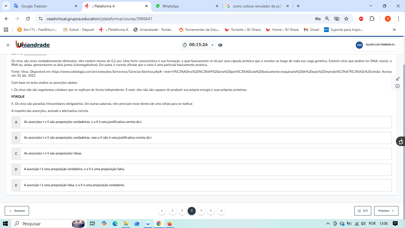 Google Tradutor X + Plataforma A X WhatsApp como colocar emulador de ps2 + X ceadvirtual.grupoa.education/plataforma/course/3986641 g 6m:17s Eobot Deposit Plataforma A Uniandrade Portal... Ferramentas de Estu... Torrents BJ-Share Home BJ-Share Gmail Suporte para Inspir... 00:15:26 GM GILSON LUIS FERREIRA Os são seres verdadeiramente diminutos: eles medem menos de Uma forte é sua a qual basicamente se por uma cápsula proteica que envolve ao longo de toda sua carga genética. Existem virus que podem ter outros, RNA ainda, apresentarem os dois juntos Em suma, é correto afirmar que 0 virus é uma particula basicamente proteica. Fonte: Virus. Disponível em: Acesso em: 02 2021. Com base no texto analise as asserções abaixo: i Os virus não são organismos celulares que se replicam de forma independente. E mais: eles não são capazes de produzir sua energia e suas proprias PORQUE Os virus são parasitas intracelulares obrigatórios. Em outras eles precisam estar dentro de uma célula para se replicar. A respeito das assinale a alternativa correta. A As asserções e II são proposições verdadeiras, e a II é uma justificativa correta da B As asserções e II são proposições verdadeiras, mas a II não é uma justificativa correta da C As asserções e II são proposições falsas. D A asserção é uma proposição e a II é uma proposição falsa. E A asserção é uma proposição falsa, e a II é uma proposição verdadeira. Anterior 3/5 > Pesquisar POR 13:06