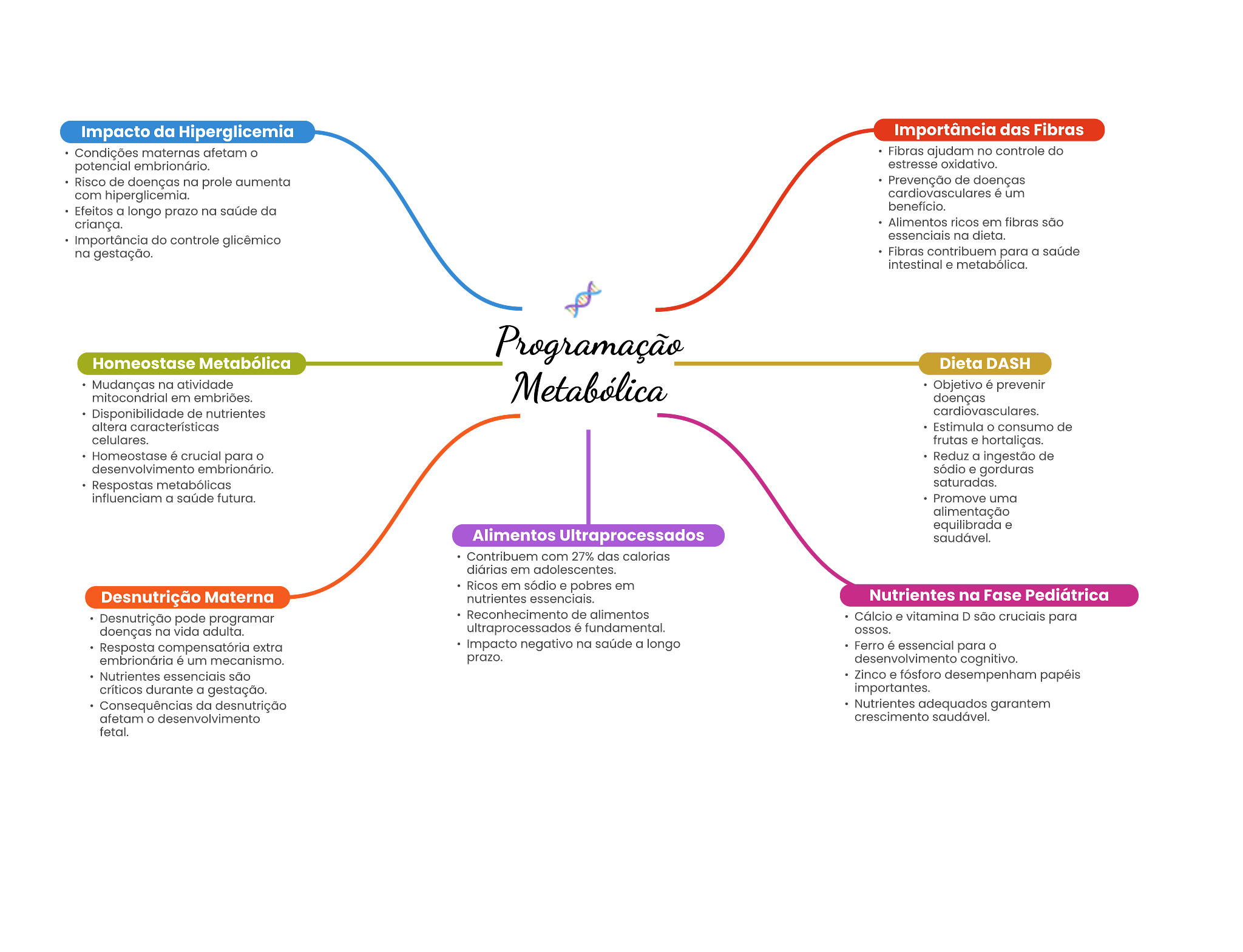 Impacto da Hiperglicemia Importância das Fibras Condições o Fibras ajudam no controle do potencial embrionário. addativo. Risco de na aumenta Prevenção de doenças com cardiovasculares um Efeitos a longo prazo na da criança. Alimentos ricos em fibras do controle glicêmico na dieta. na gestação. Fibras contribuem para a Homeostase Metabólica Dieta DASH Mudanças na atividade Objetivo prevenir mitocondrial em doenças Disponibilidade de cardiovasculares. altera características Estimula o consumo de celulares. frutas . Homeostase para Reduz a de sódio gorduras Respostas metabólicas saturadas. influenciam a saúde futura. Promove uma allmentação . Alimentos Ultraprocessados com 27% em Ricos em sódio pobres em Desnutrição Materna nutrientes Nutrientes na Fase Pediátrica Desnutrição pode programar Reconhecimento de alimentos vitamina D para doenças na vida adulta. é fundamental. Resposta compensatória extra negativo na a longo Ferro é essencial para o é um prazo. desenvolvimento cognitivo. Nutrientes Zinco desempenham durante a gestação. Consequências da desnutrição Nutrientes adequados garantem crescimento fetal.