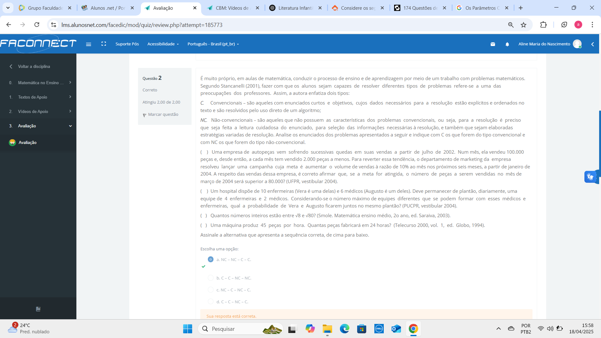 Grupo Faculdade Alunos .net / Por Avaliação CBM: Vídeos de Literatura Infanti Considere os 174 Questões de G Os Parâmetros + X 4 a FACONNECT Suporte Pós Acessibilidade Português Brasil (pt_br) Aline Maria do Nascimento Voltar a disciplina Questão 2 É muito próprio, em aulas de matemática, conduzir O processo de ensino e de aprendizagem por meio de um trabalho com problemas matemáticos. 0. Matemática no Ensino > Segundo Stancanelli (2001), fazer com que os alunos sejam capazes de resolver diferentes tipos de problemas refere-se a uma das Correto preocupações dos professores. Assim, a autora enfatiza dois tipos: 1. Textos de Apoio > Atingiu 2,00 de 2,00 C. Convencionais são aqueles com enunciados curtos e objetivos, cujos dados necessários para a resolução estão explícitos e ordenados no 2. Vídeos de Apoio > texto e são resolvidos pelo uso direto de um algoritmo; Marcar questão NC. Não-convencionais são aqueles que não possuem as características dos problemas convencionais, ou seja, para a resolução é preciso 3. Avaliação que seja feita a leitura cuidadosa do enunciado, para seleção das informações necessárias à resolução, e também que sejam elaboradas estratégias variadas de resolução. Analise os enunciados dos problemas apresentados a seguir e indique com C os que forem do tipo convencional e Avaliação com NC os que forem do tipo não-convencional. ( ) Uma empresa de autopeças vem sofrendo sucessivas quedas em suas vendas a partir de julho de 2002. Num mês, ela vendeu 100.000 peças e, desde então, a cada mês tem vendido 2.000 peças a menos. Para reverter essa tendência, 0 departamento de marketing da empresa resolveu lançar uma campanha cuja meta é aumentar volume de vendas à razão de 10% ao mês nos próximos seis meses, a partir de janeiro de 2004. A respeito das vendas dessa empresa, é correto afirmar que, se meta for atingida, 0 número de peças a serem vendidas no mês de março de 2004 será superior a 80.000? (UFPR, vestibular 2004). ( ) Um hospital dispõe de 10 enfermeiras (Vera é uma delas) e 6 médicos (Augusto é um deles). Deve permanecer de plantão, diariamente, uma equipe de 4 enfermeiras e 2 médicos. Considerando-se número máximo de equipes diferentes que se podem formar com esses médicos e enfermeiras, qual a probabilidade de Vera e Augusto ficarem juntos no mesmo plantão? (PUCPR, vestibular 2004). Quantos números inteiros estão entre e (Smole. Matemática ensino médio, ano, ed. Saraiva, 2003). ( Uma máquina produz 45 peças por hora. Quantas peças fabricará em 24 horas? (Telecurso 2000, vol. 1, ed. Globo, 1994). Assinale a alternativa que apresenta a sequência correta, de cima para baixo. Escolha uma opção: b.C-C-NC-NC. d.C-C-NC-C. Sua resposta está correta. 2 24°C POR 15:58 Pesquisar Pred. nublado PTB2 18/04/2025