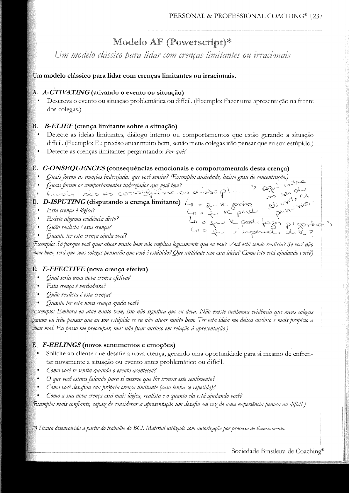 PERSONAL & PROFESSIONAL 237 Modelo AF (Powerscript)* Um modelo clássico para lidar com crenças limitantes ou irracionais Um modelo clássico para lidar com crenças limitantes ou irracionais. A. A-CTIVATING (ativando evento ou situação) Descreva evento ou situação problemática ou difícil. (Exemplo: Fazer uma apresentação na frente dos colegas.) B. B-ELIEF (crença limitante sobre a situação) Detecte as ideias limitantes, diálogo interno ou comportamentos que estão gerando a situação difícil. (Exemplo: Eu preciso atuar muito bem, senão meus colegas irão pensar que eu sou estúpido.) Detecte as crenças limitantes perguntando: Por quê? C. C-ONSEQUENCES (consequências emocionais e comportamentais desta crença) Quais foram as emoções indesejadas que você sentiu? (Exemplo: ansiedade, baixo grau de concentração.) Quais foram os comportamentos indesejados que você teve? disso ? do a D. D-ISPUTING (disputando a crença limitante) VC Esta crença é lógica? Existe alguma evidência disto? Quão realista é esta crença? P' Quanto ter esta crença ajuda você? (Exemplo: Só porque você quer atuar muito bem não implica logicamente que eu vou? Você está sendo realista? Se você não atuar bem, será que seus colegas pensarão que você é estúpido? Que utilidade tem esta ideia? Como isto está ajudando você?) E. E-FFECTIVE (nova crença efetiva) Qual seria uma nova crença efetiva? Esta crença é verdadeira? Quão realista é esta crença? Quanto ter esta nova crença ajuda você? (Exemplo: Embora eu atue muito bem, isto não significa que eu deva. Não existe nenbuma evidência que meus colegas pensam ou irão pensar que eu sou estúpido se eu não atuar muito bem. Ter esta ideia me deixa ansioso e mais propício a atuar mal. Eu posso me preocupar, mas não ficar ansioso em relação à apresentação.) F. F-EELINGS (novos sentimentos e emoções) Solicite ao cliente que desafie a nova crença, gerando uma oportunidade para si mesmo de enfren- tar novamente a situação ou evento antes problemático ou difícil. Como você se sentiu quando evento aconteceu? O que você estava falando para si mesmo que trouxe este sentimento? Como você desafiou sua própria crença limitante (caso se repetido)? Como a sua nova crença está mais lógica, realista e 0 quanto ela está ajudando você? (Exemplo: mais confiante, capaz de considerar a apresentação um desafio em vez de uma experiência penosa ou difícil.) (*) Técnica desenvolvida a partir do trabalho do BCI. Material utilizado com autorização por processo de licenciamento. Sociedade Brasileira de