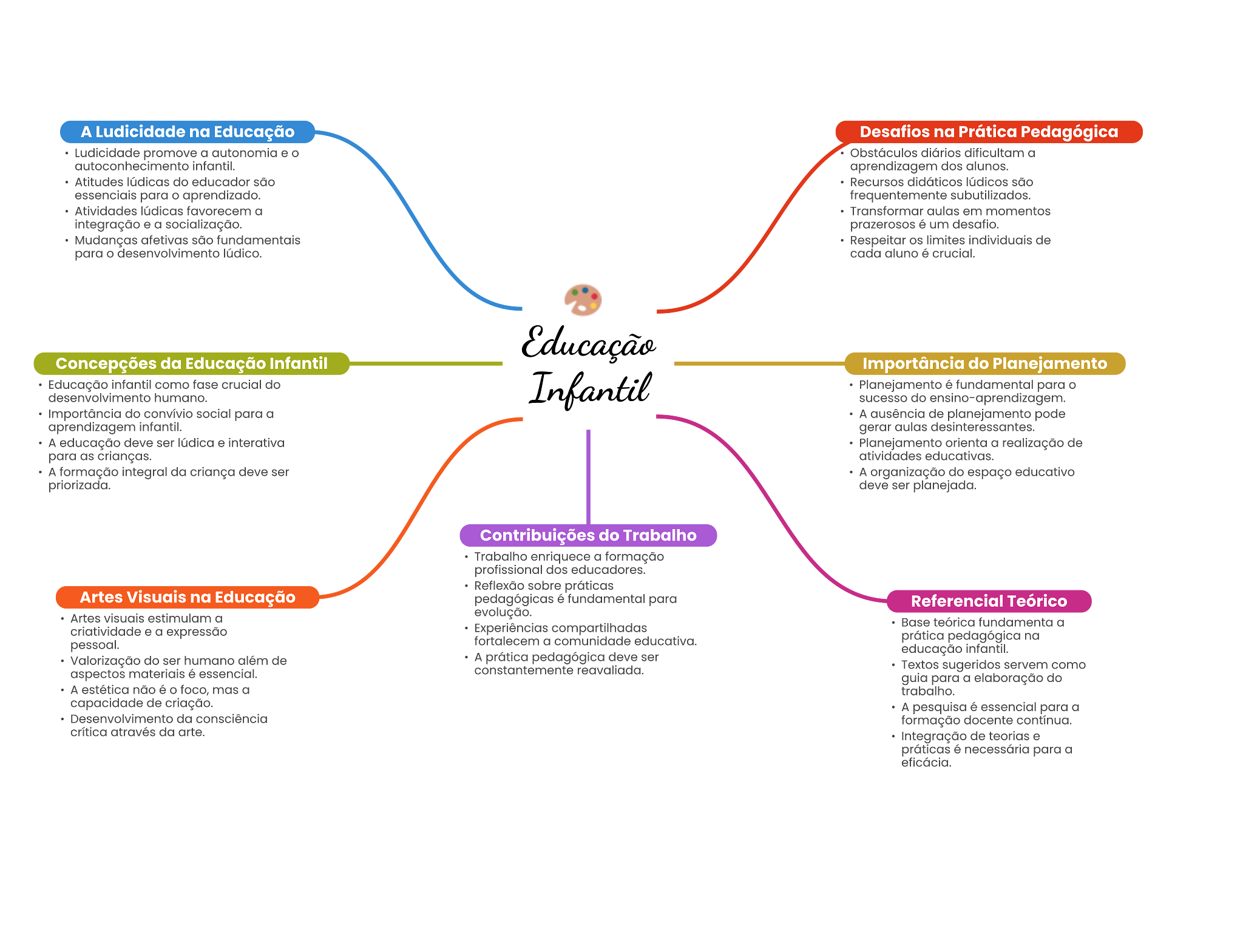 A Ludicidade na Educação Desafios na Prática Pedagógica Ludicidade promove a . Obstáculos diários dificultam a autoconhecimento aprendizagem dos alunos. Atitudes lúdicas do educador Recursos essenciale para aprendizado. frequentemente favorecem a Transformar em momentos a um desafio. crietivas são fundamentale os limites de para deservolvimento oada aluno crucial. Concepções da Educação Infantil Importância do Planejamento Educação como fase crucial do é fundamental para desenvolvimento humano. sucesso do do social para a A de pode aprendizagem gerar A educação deve ser lúdica orienta a realização de para atividades educativas. A formação da criança deve A organização do educativo priorizada. deve ser Contribuições do Trabalho Trabalho enriquece a formação dos educadores. sobre próticas Artes Visuais na Educação pedagógicas fundamental para Referencial Teórico Artes estimulam evolução. Experiências Base teórica fundamenta a criatividade e a expressão a comunidade educativa. prática pedagógica na Valortzação do ser humano além de A pedagógica deve ser educação aspectos materials essencial. Textos sugeridos servem como para a elaboração do A estética não foco, mas a trabalho. capacidade de A é para a Desenvolvimento da consciência formação docente critica atravée da de e práticas para a